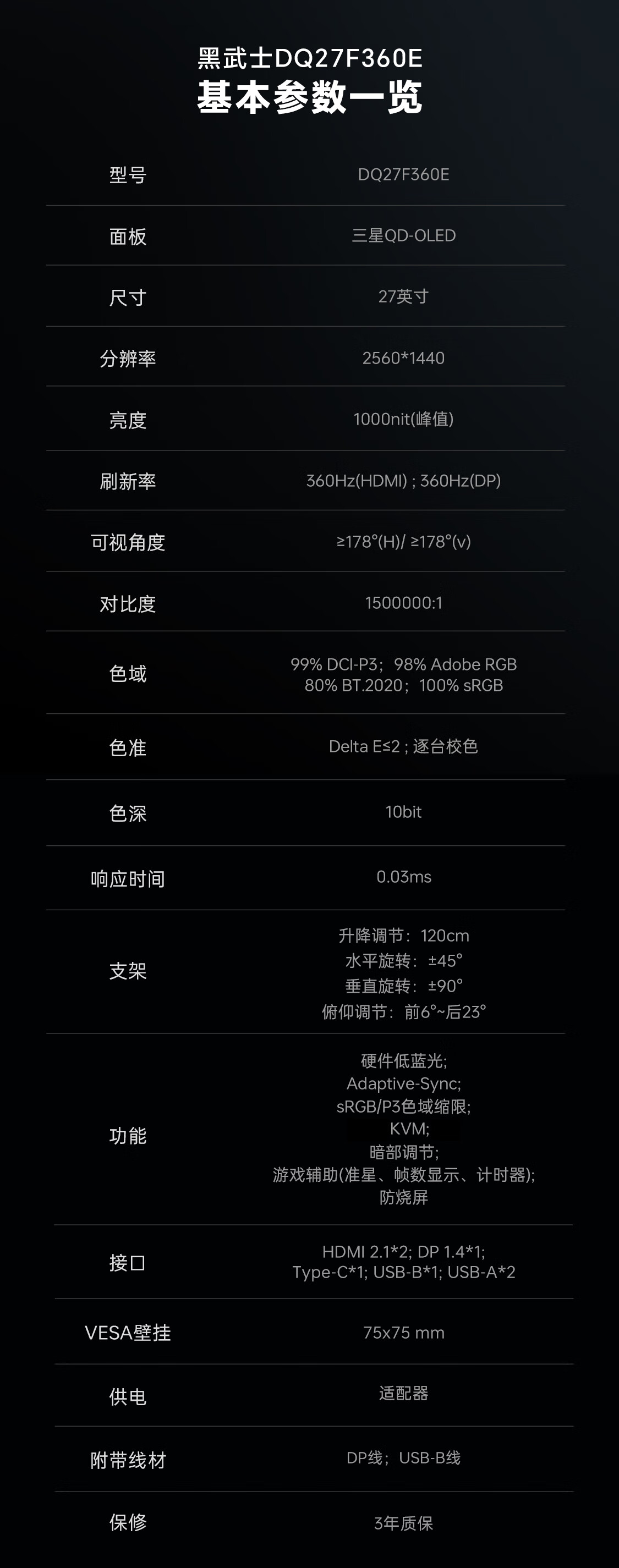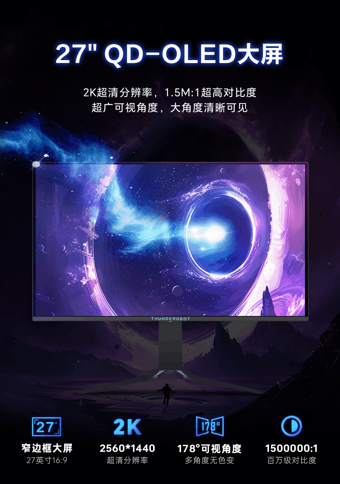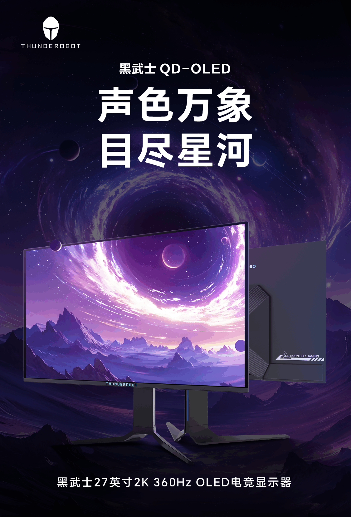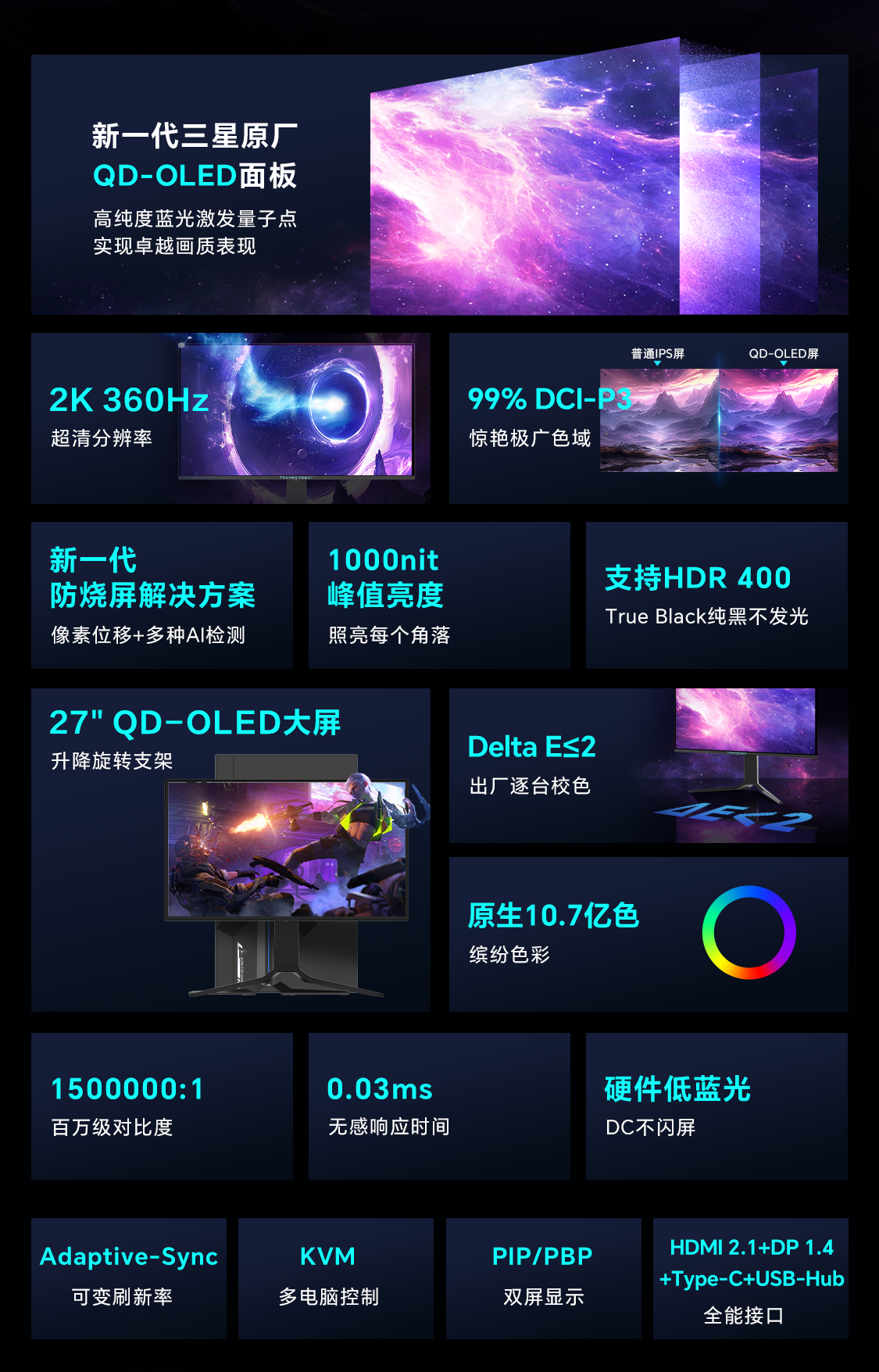 雷神26.5英寸 2K OLED 360Hz 硬件低蓝光 0.03ms HDR1000nit 15W反向充旋转升降电竞显示器DQ27F360E
