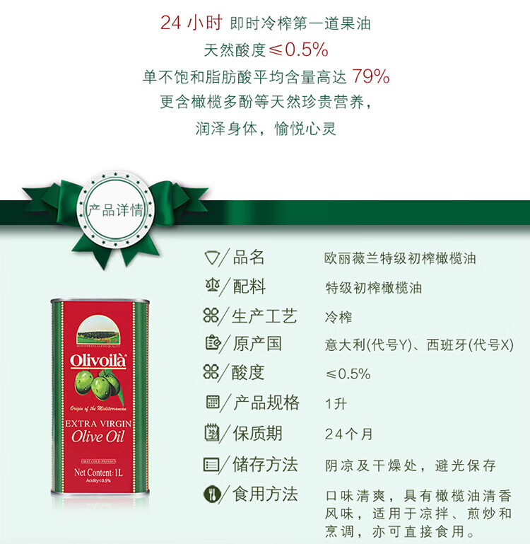 欧丽薇兰 Olivoila【保真橄榄油】食用油 特级初榨橄榄油红装1L