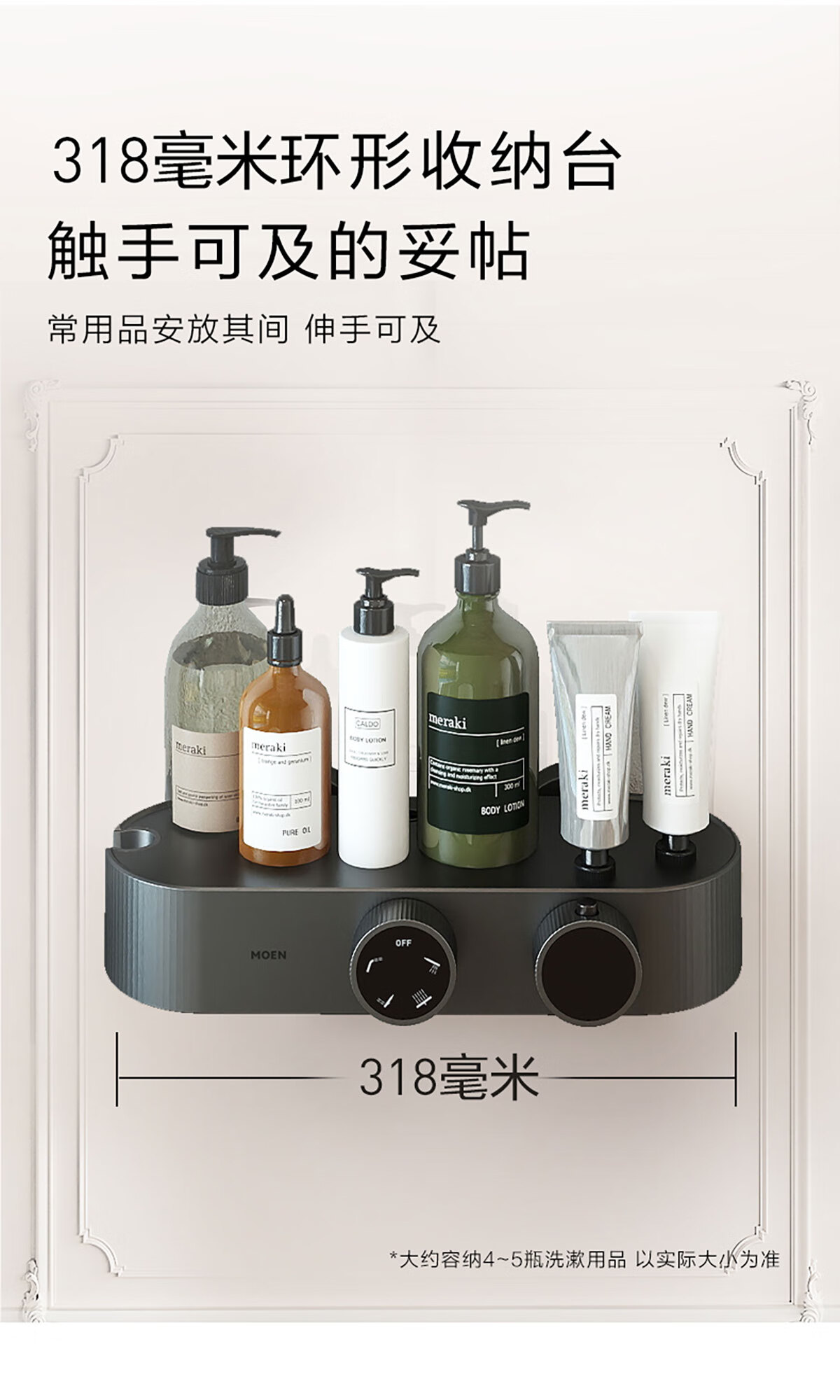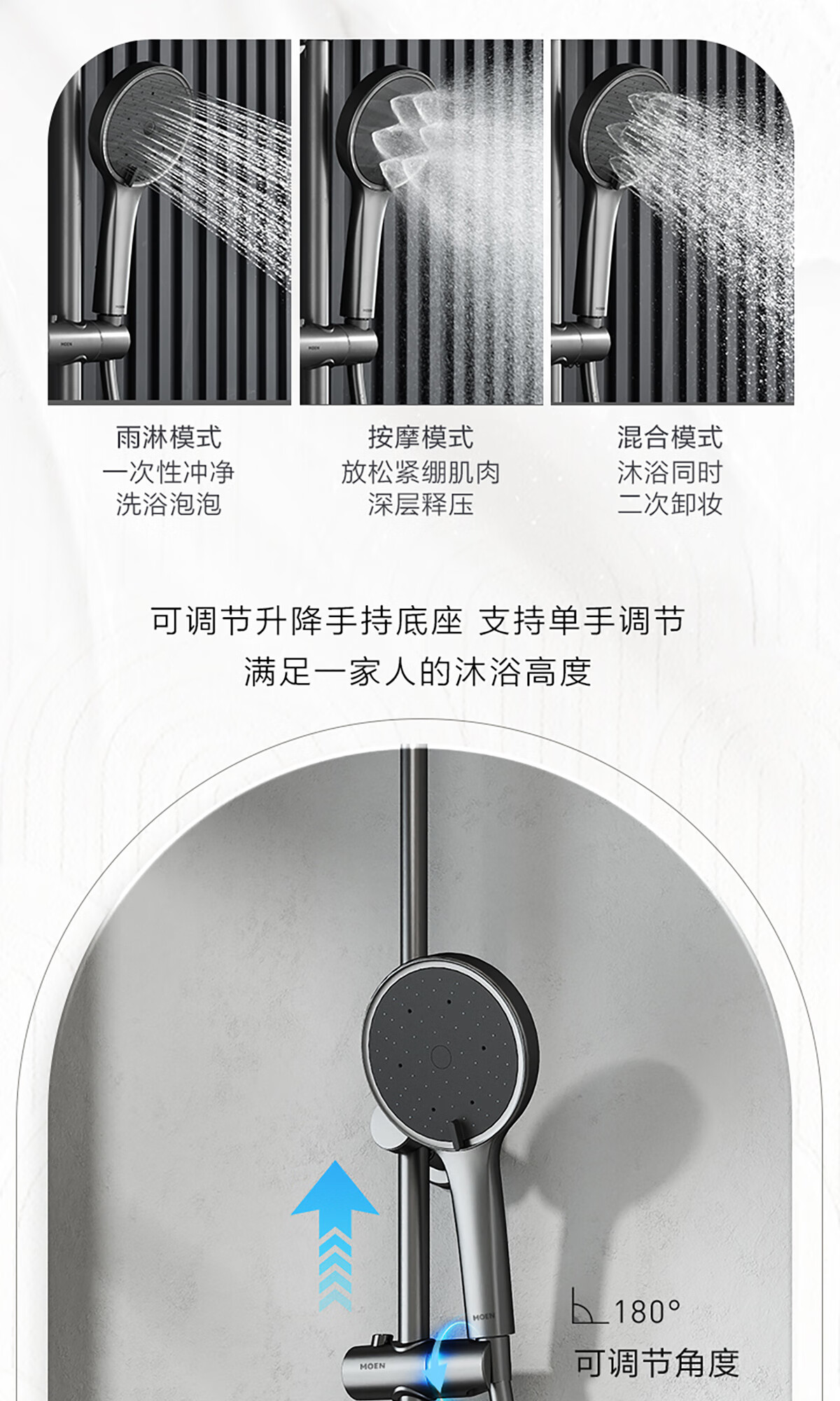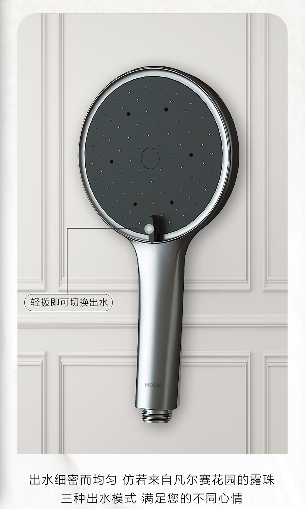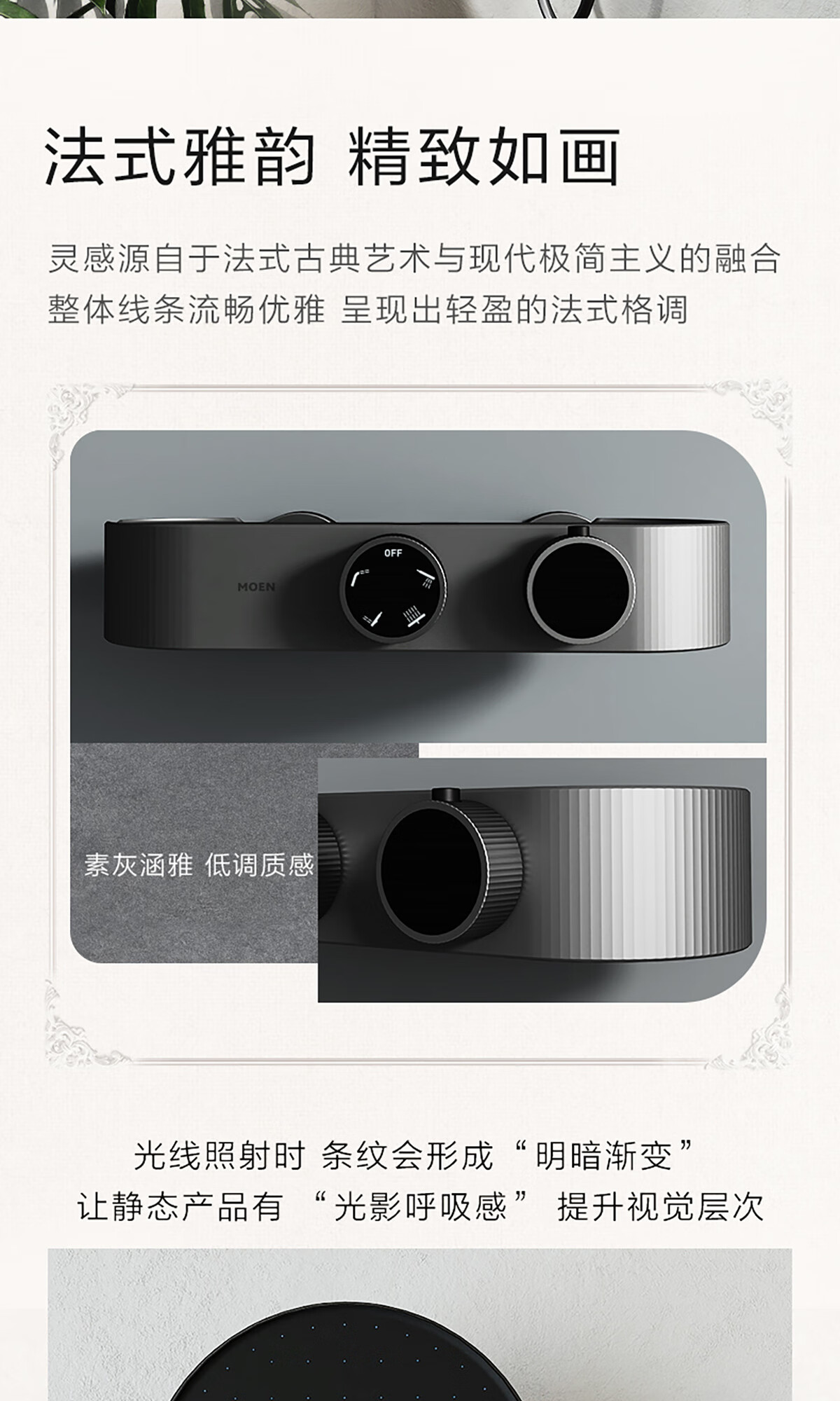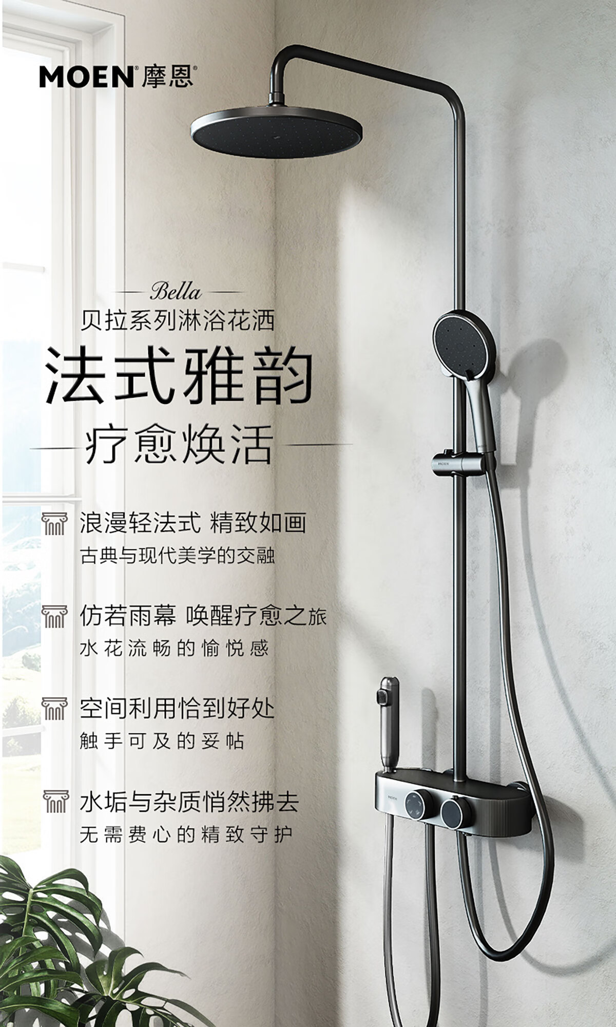 摩恩(MOEN)【迷住专属】贝拉系列花洒套装奶油风空气增压大平台置物淋浴器 恒温下出水+手持+顶喷+喷枪白色