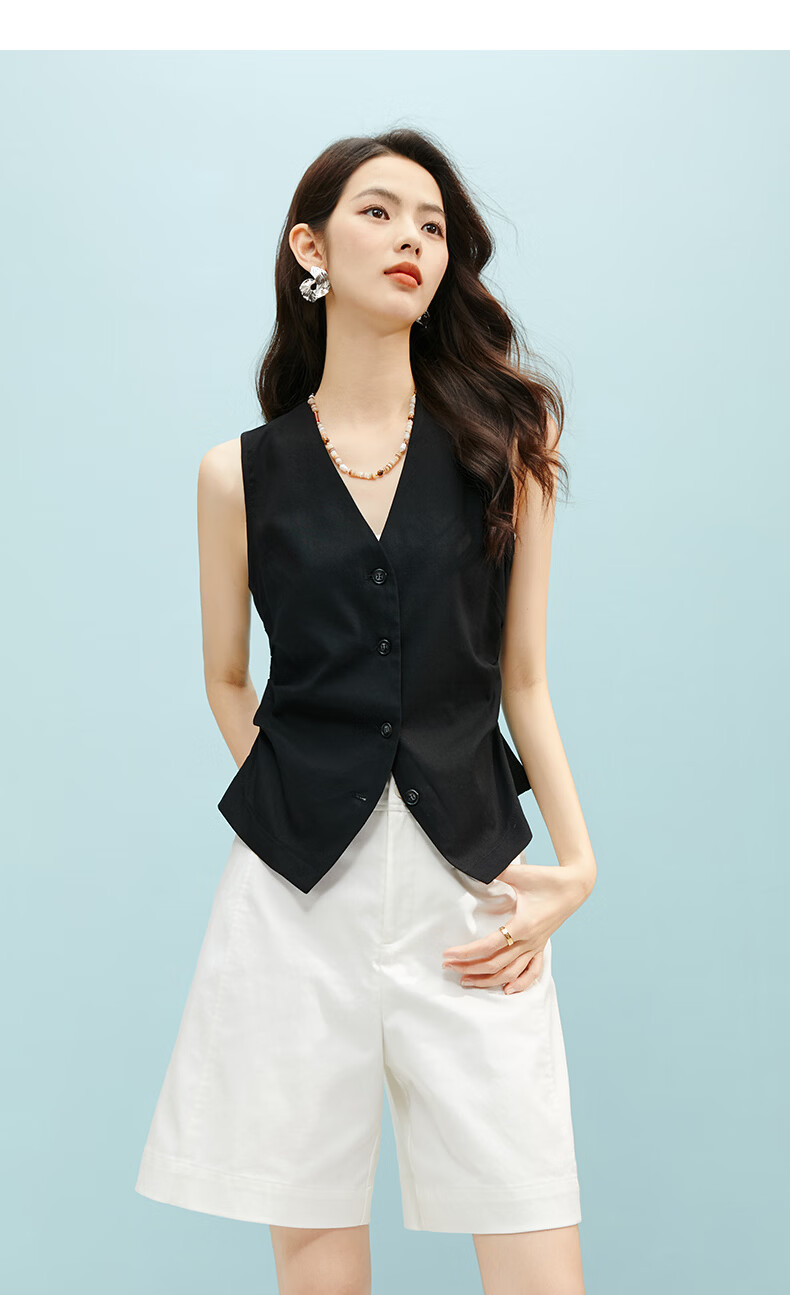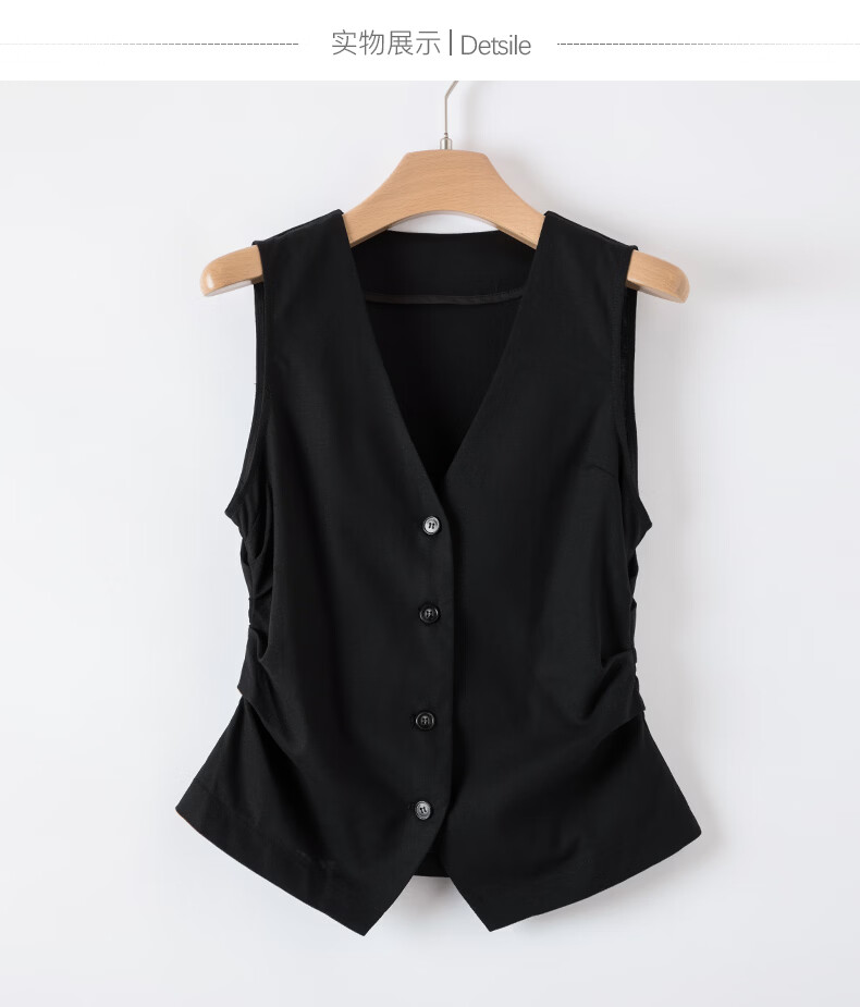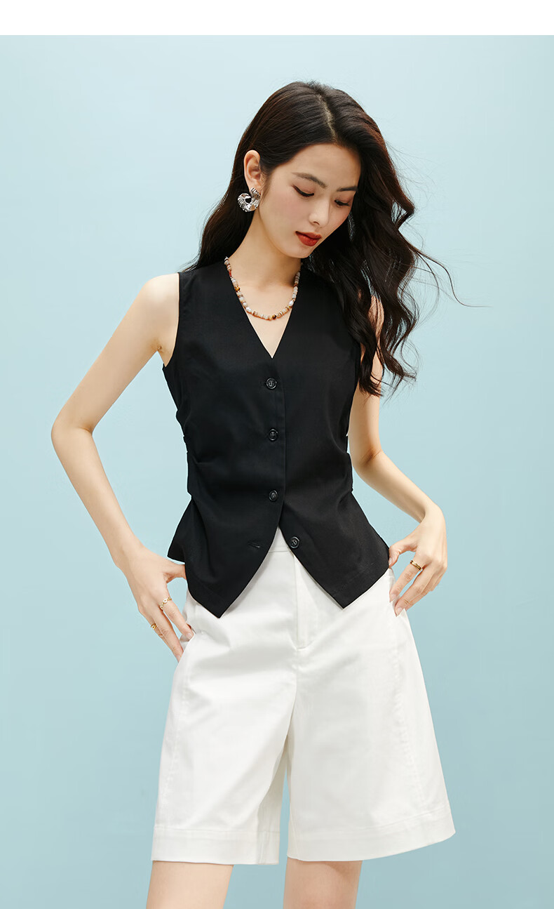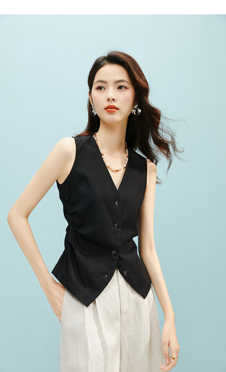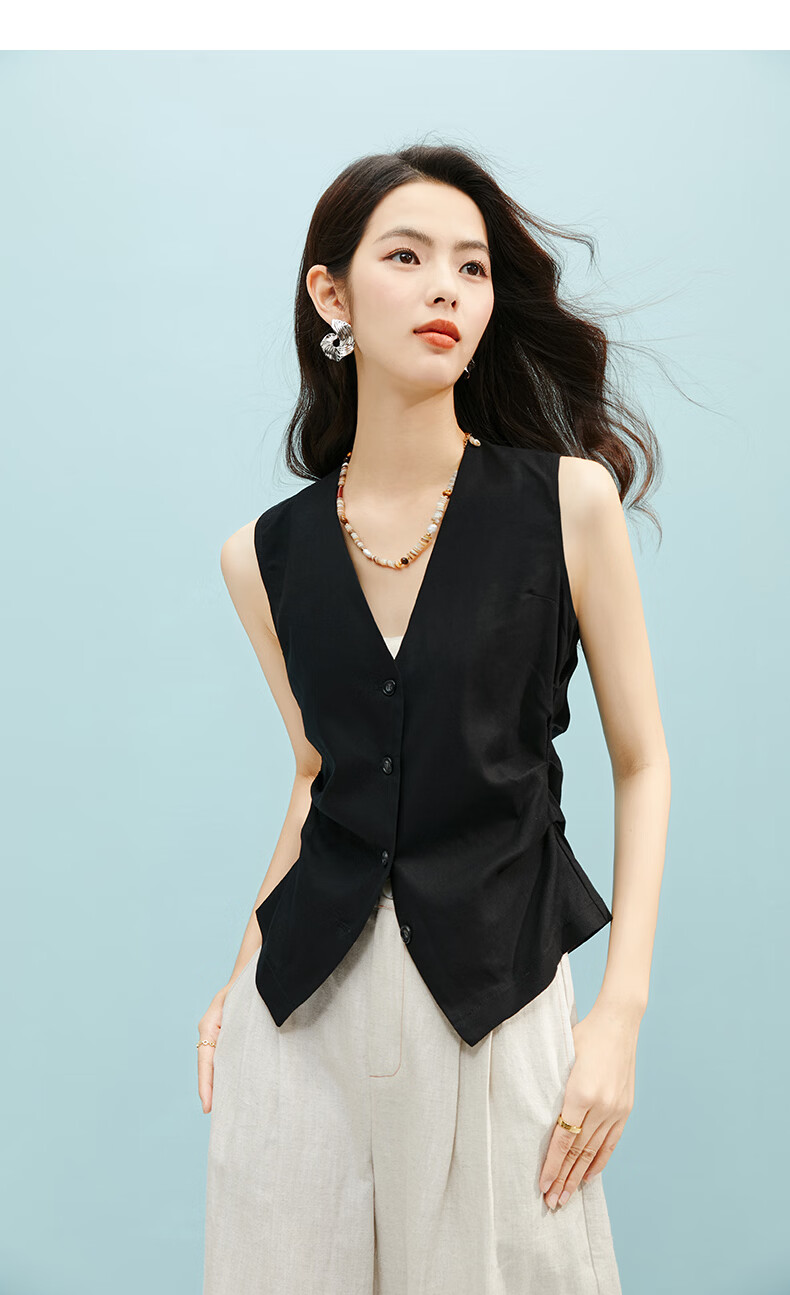 晚白【新品】2026年春款经典V领棉麻上衣透气收腰黑色西装马夹女 黑色 S