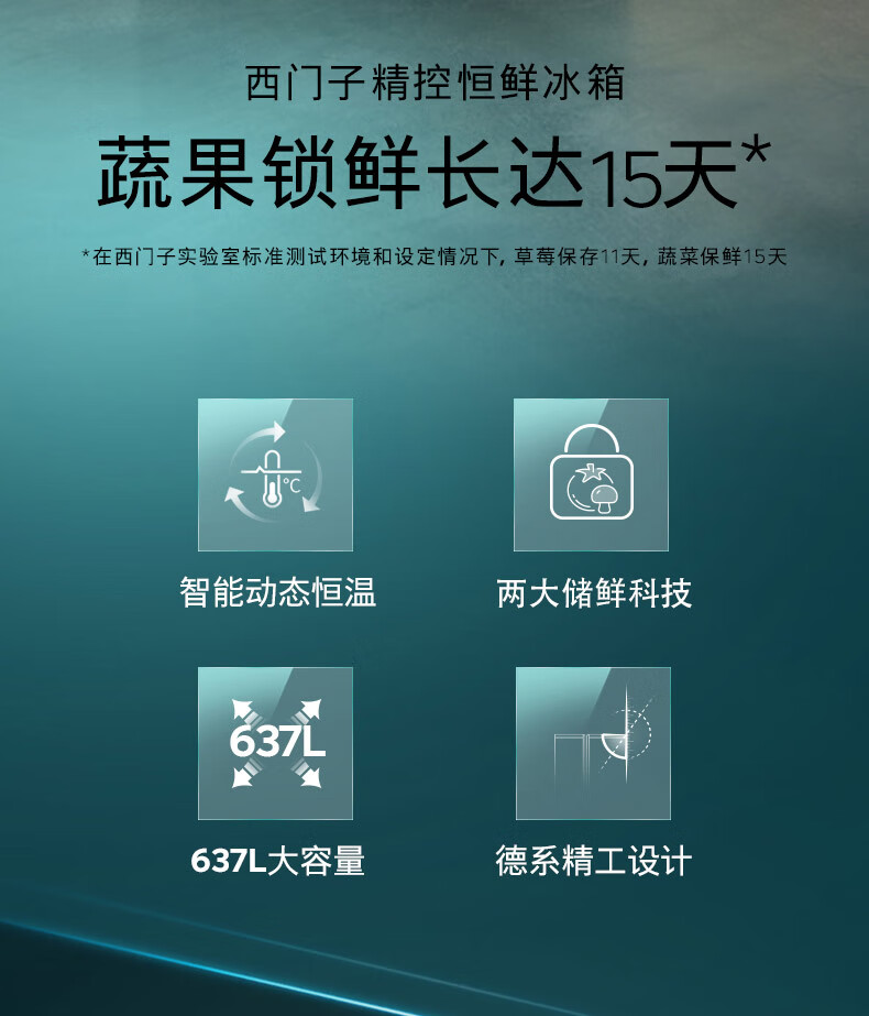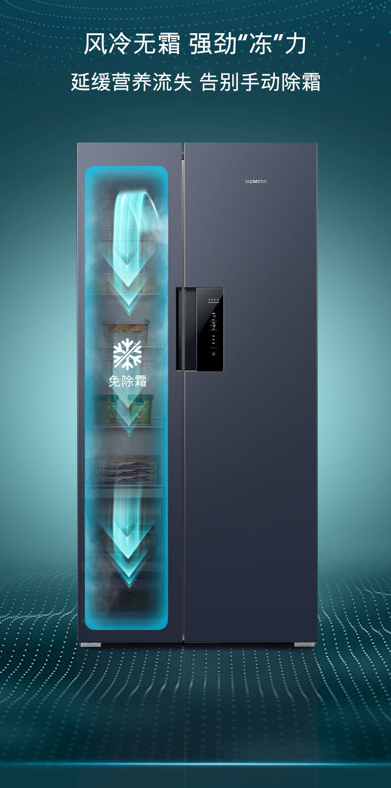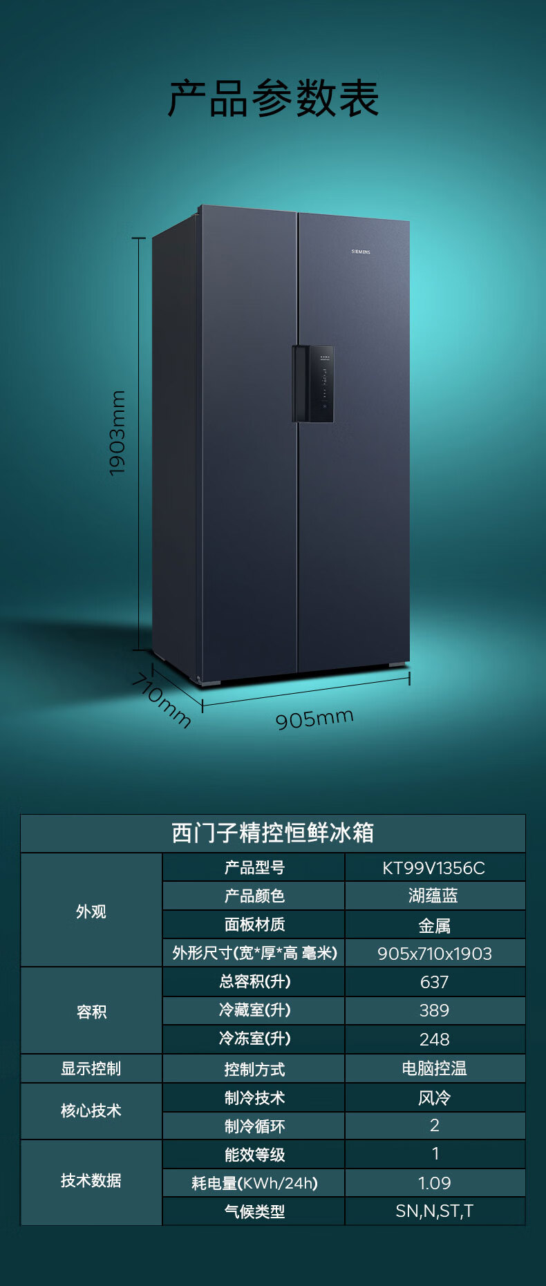 西门子(SIEMENS)精控恒鲜637L对开门冰箱 智能动态恒温 超大容量 一级能效 湖蕴蓝 KT99V1356C 国家补贴