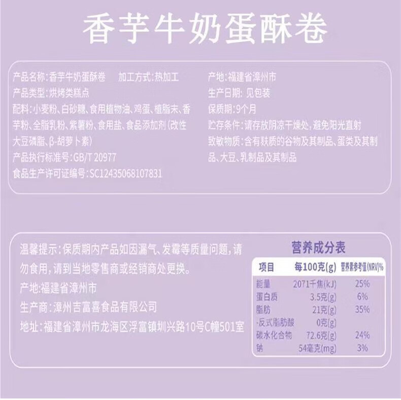 香芋牛奶蛋卷多规格 注心夹心饼干休闲小吃下午茶零食 5包/30根(125g)