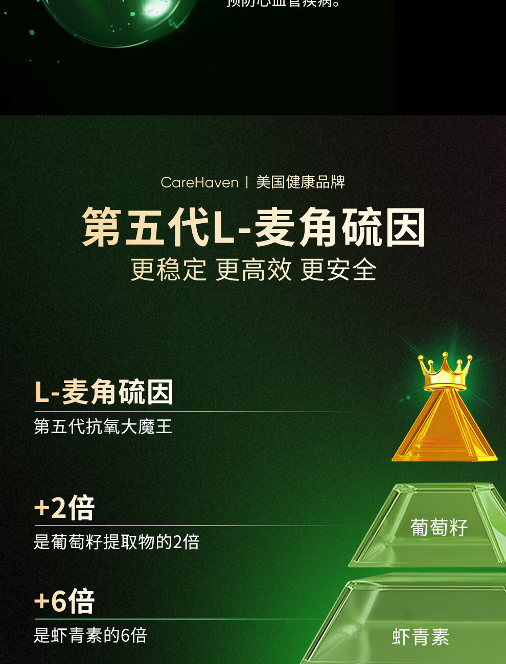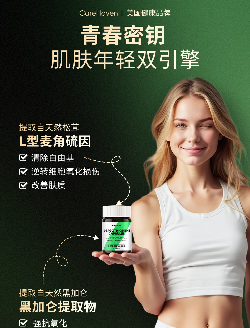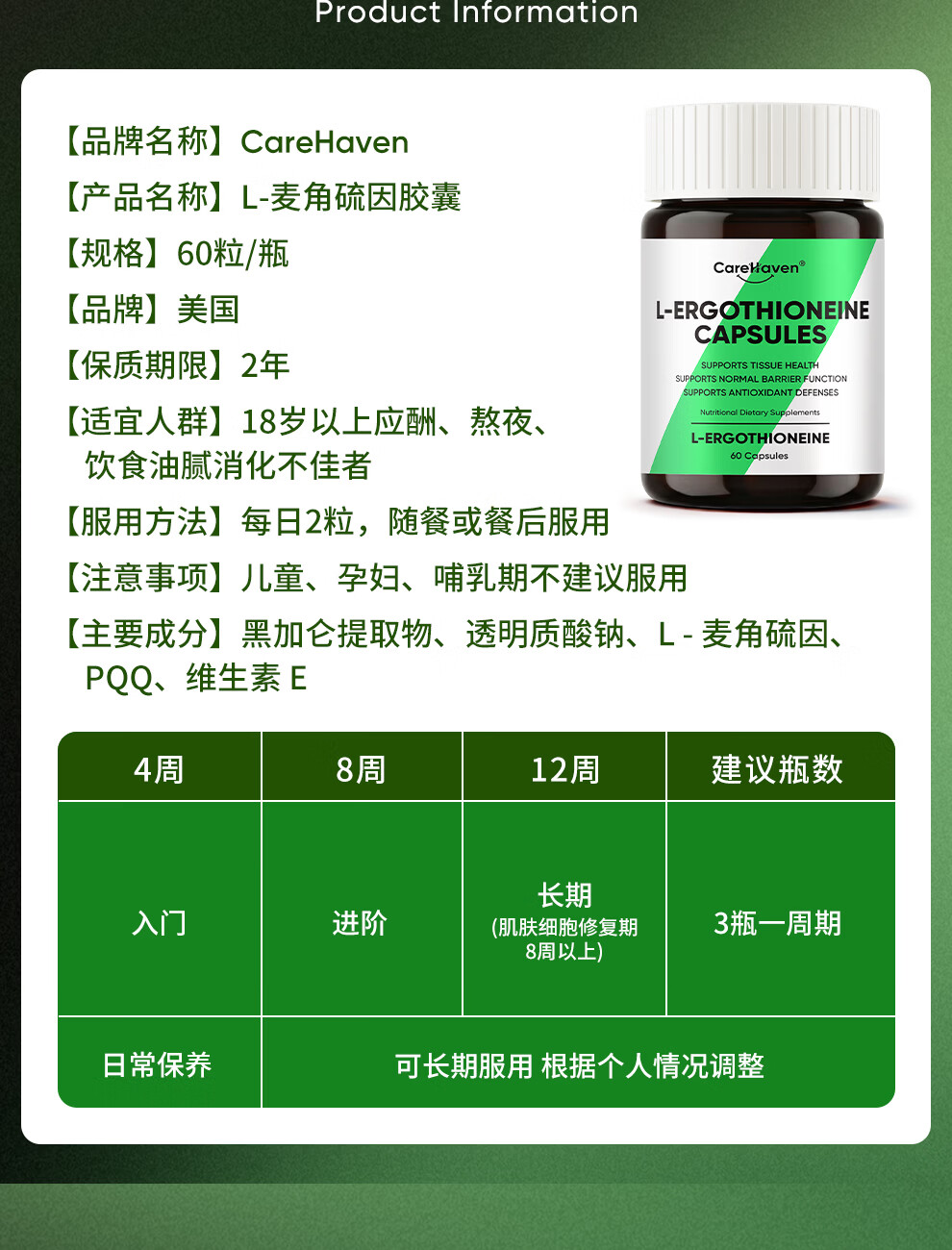 CareHaven【香港直邮】美国进口高纯度麦角硫因胶囊养颜美白抗衰淡斑祛纹 60粒*1瓶