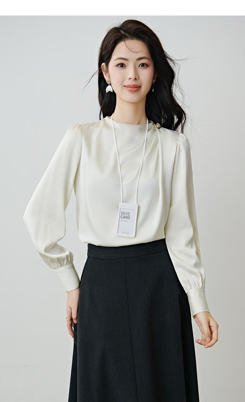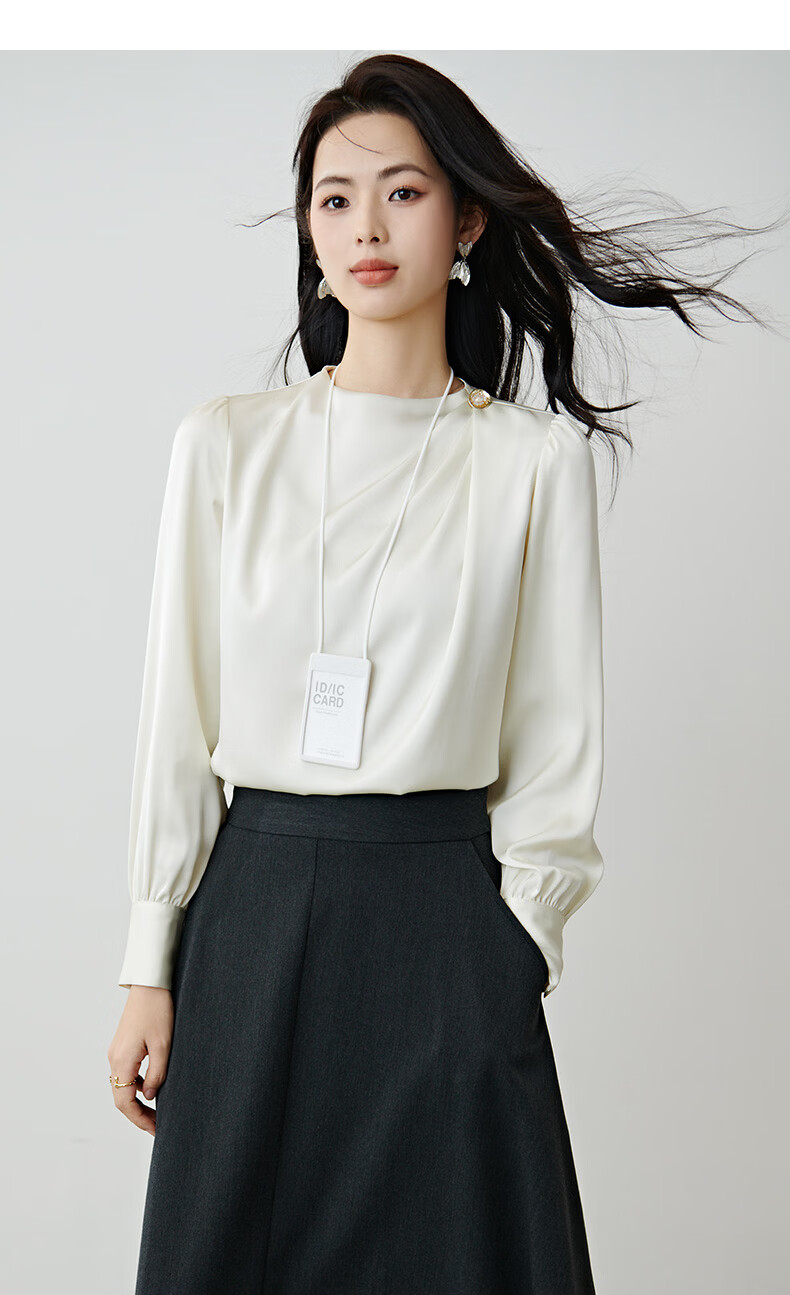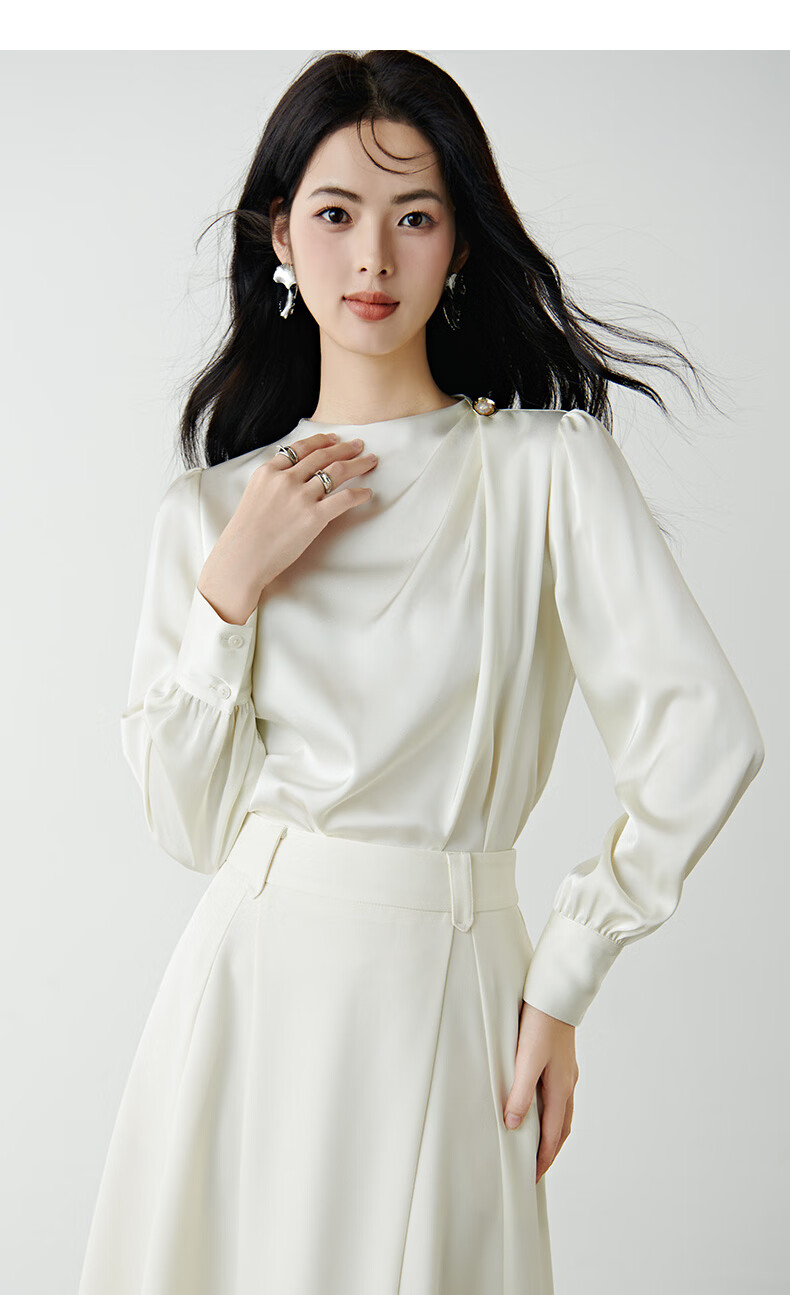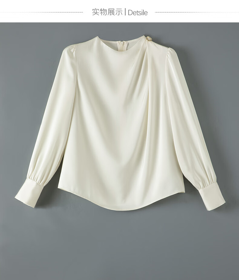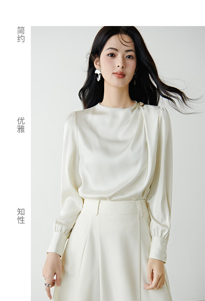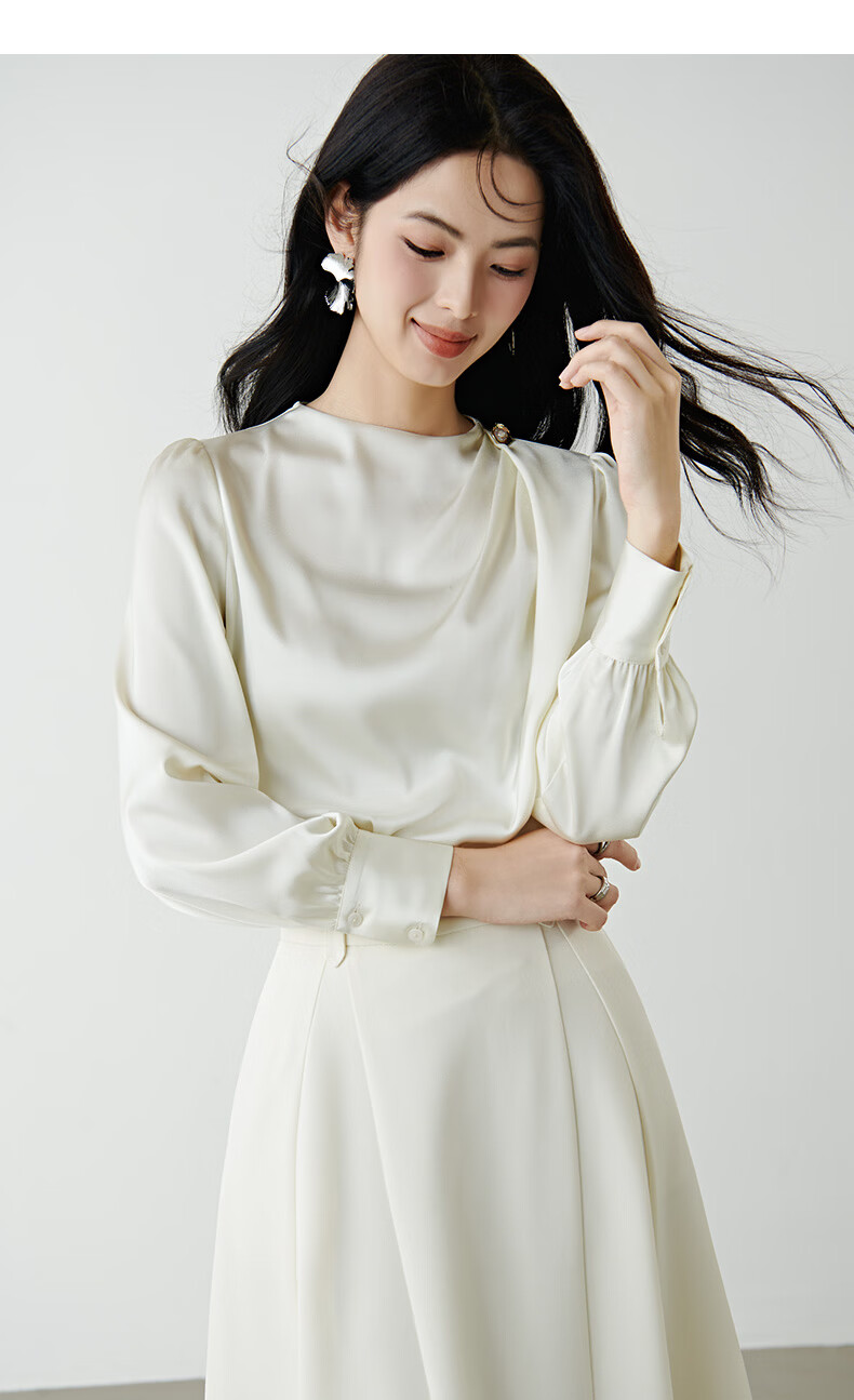 晚白设计感压褶缎面垂顺不易皱免烫衬衫2026春款时尚优雅法式通勤衬衣 米杏色 M