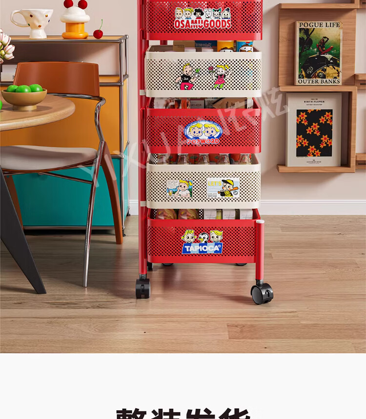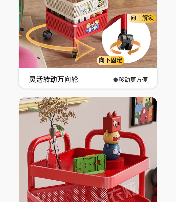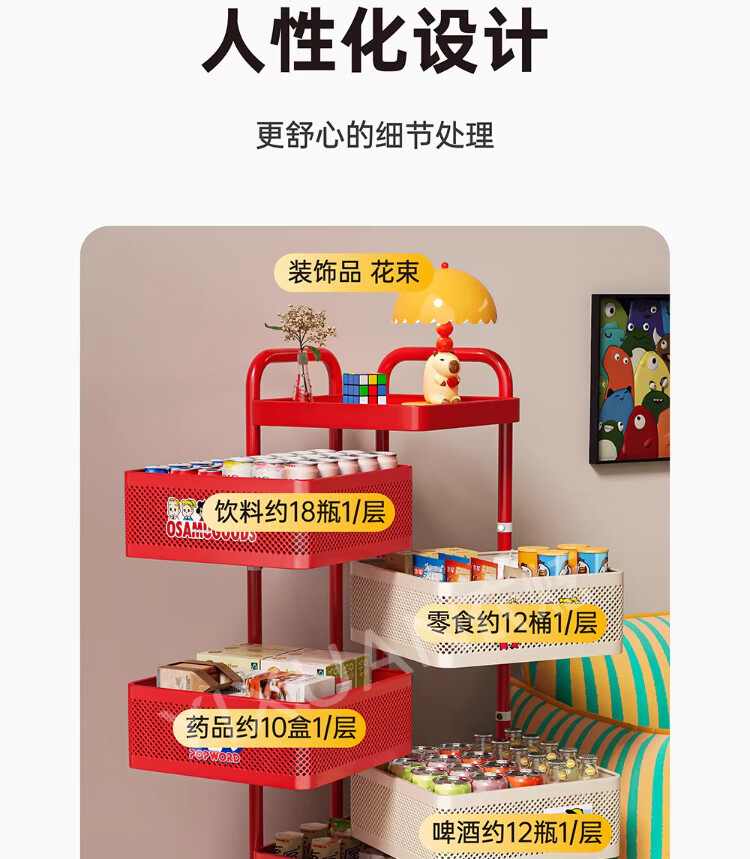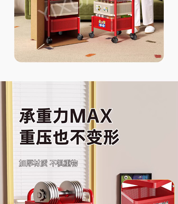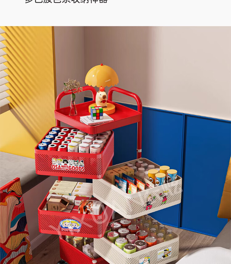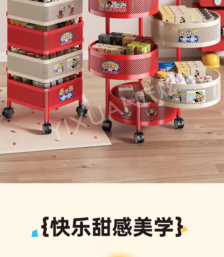 衣炫多巴胺小推车零食置物架可移动旋转落地家用客厅厨房多层收纳架子 【方形-巨厚碳钢】三层带磁吸 升级免安装 到手即用