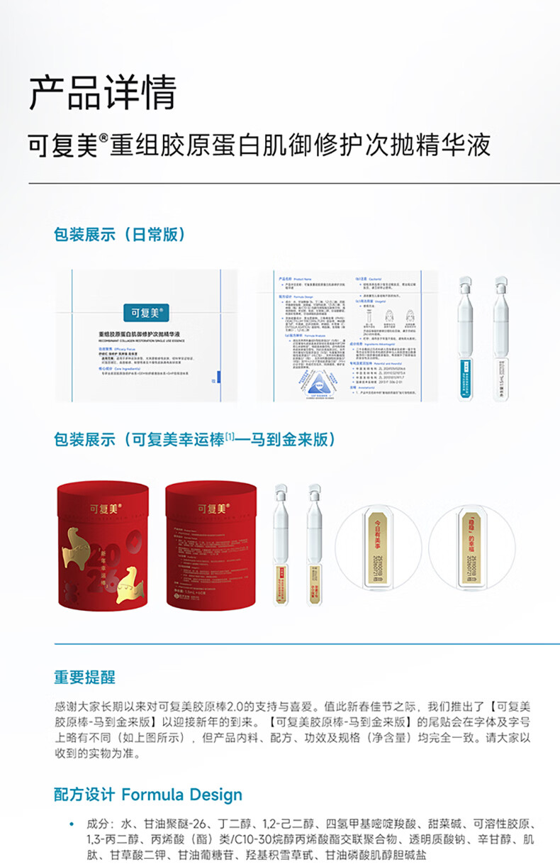 可复美胶原棒2.0重组胶原蛋白肌御修护次抛精华液60支幸运棒*马到金来版