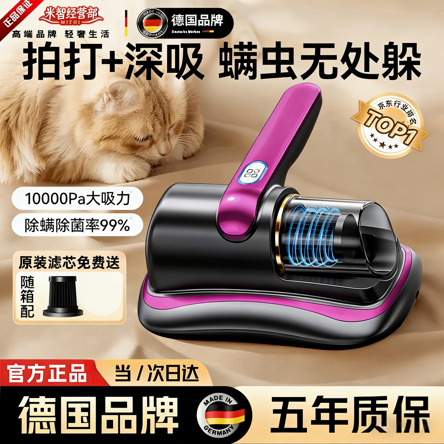 【德国进口】除螨菌99.99%无线手持除螨仪床上家用除菌吸尘器紫外线杀菌吸尘除螨二合一 顶配金【10000P吸力】滤芯终身送 99%除螨率+进口机芯+高效除菌