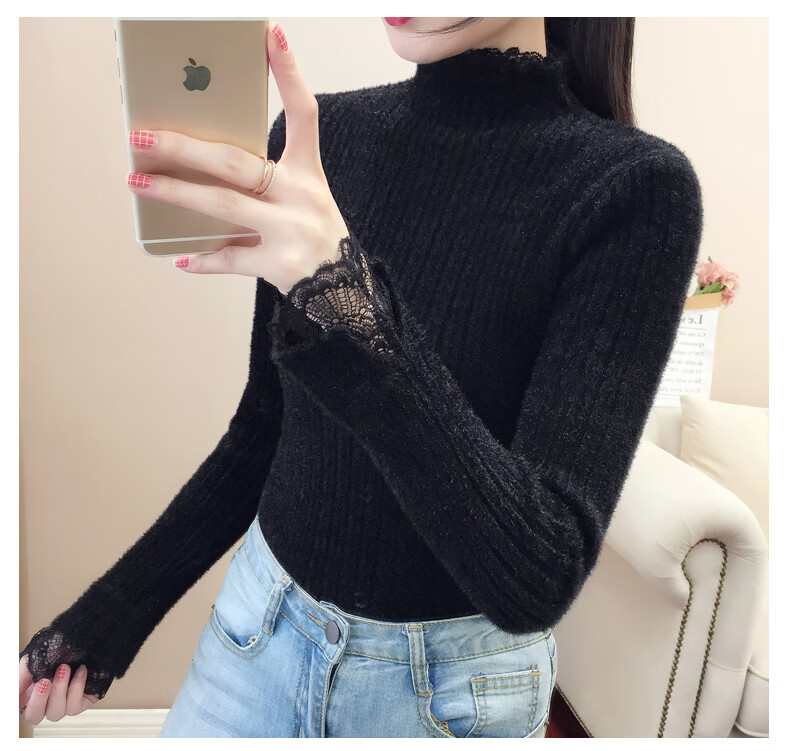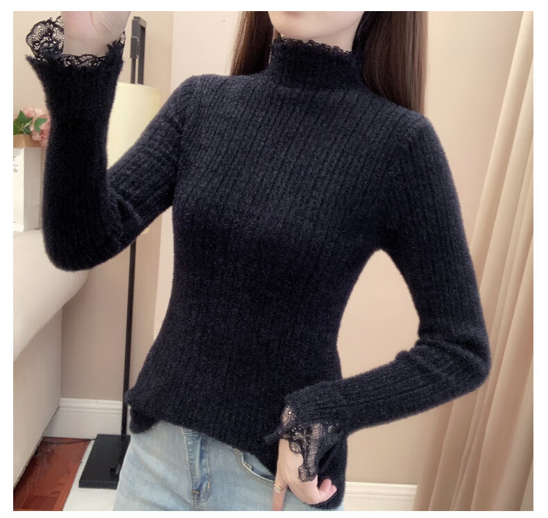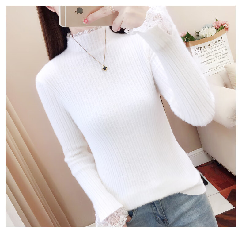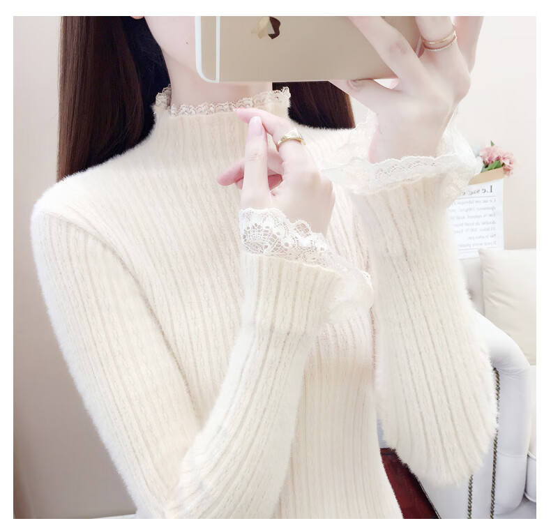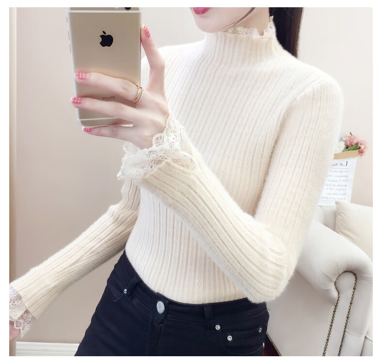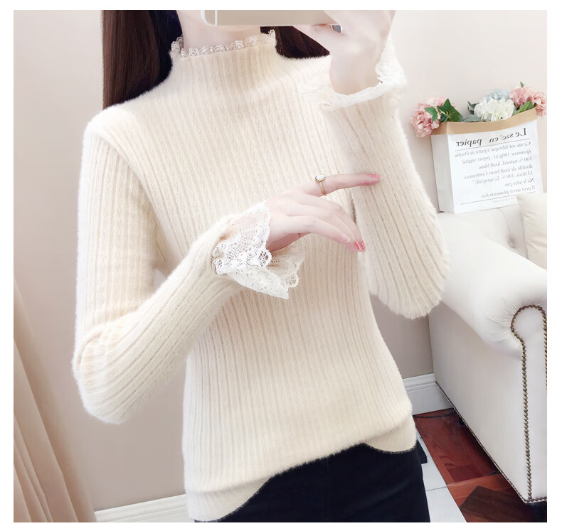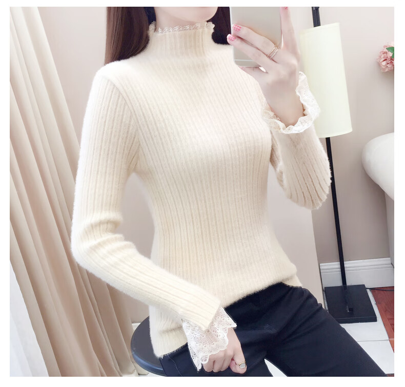 香影纯高级感花边圆领打底毛衫女春秋冬内搭洋气修身荷叶针织低领毛衣女 杏色 S (建议95斤以内)