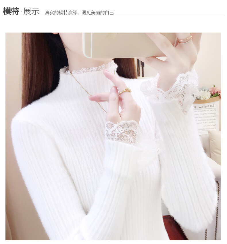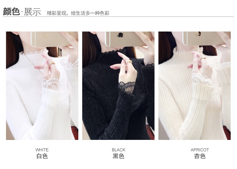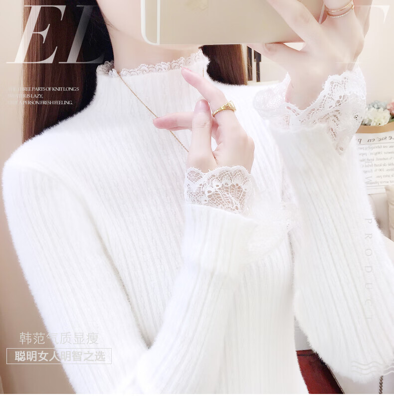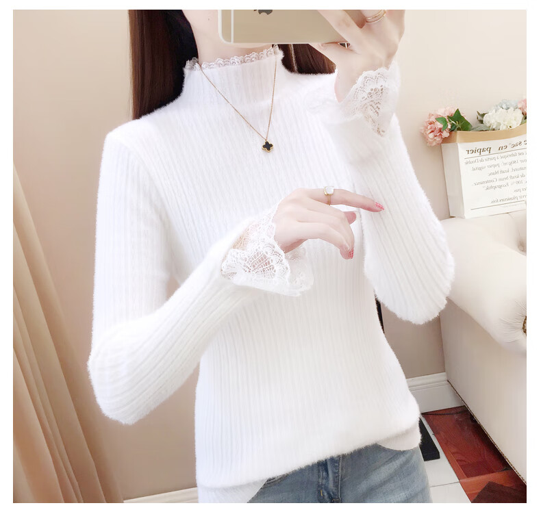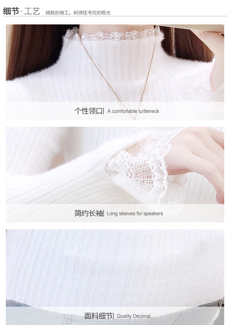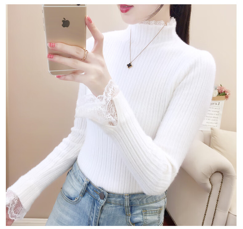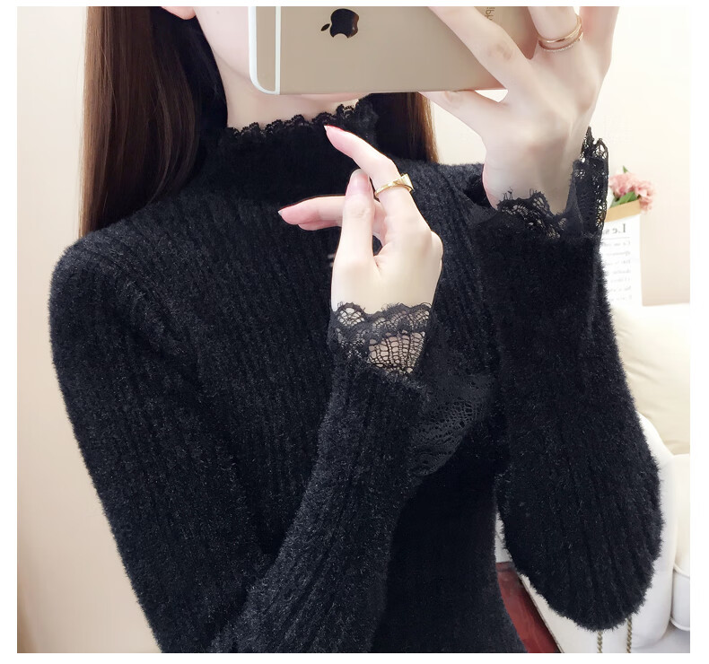 香影纯高级感花边圆领打底毛衫女春秋冬内搭洋气修身荷叶针织低领毛衣女 杏色 S (建议95斤以内)