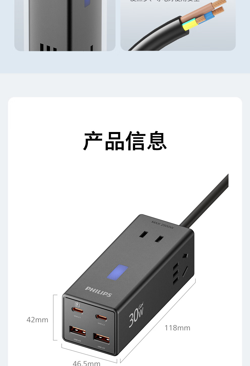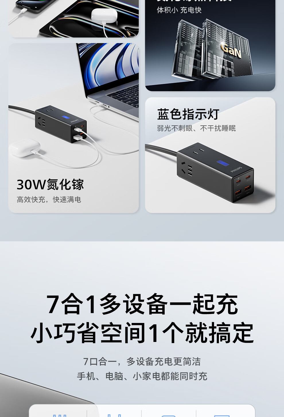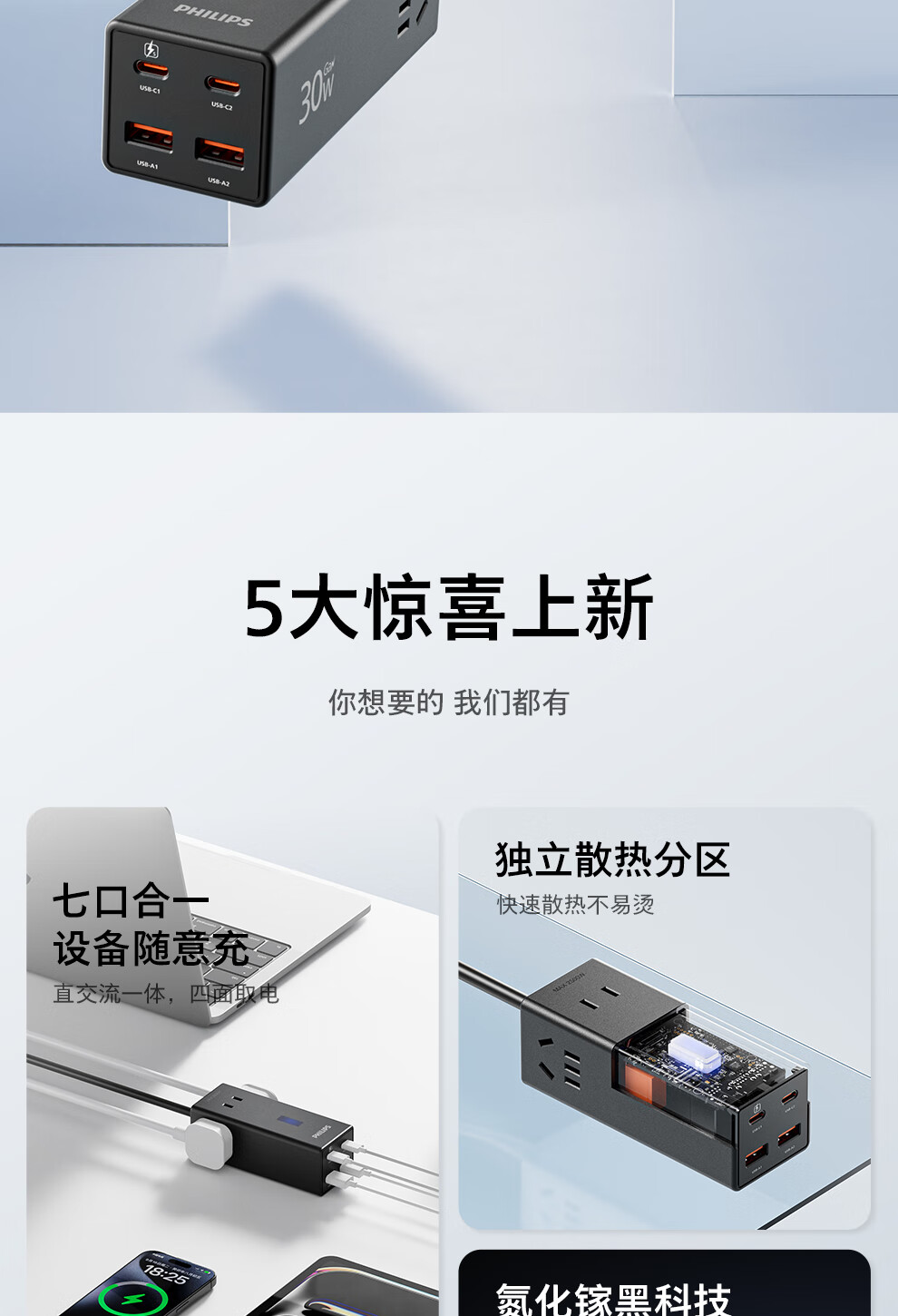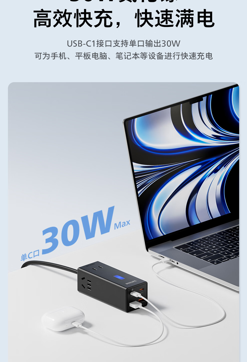 飞利浦(PHILIPS)桌面充电站30W带usb插座typec插排快充排插多功能插线板多口充电器扩产充电坞