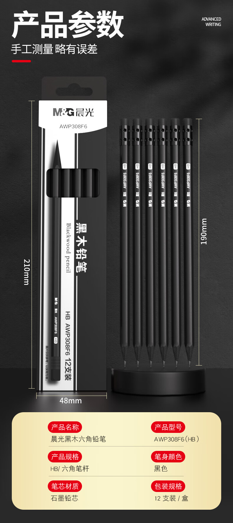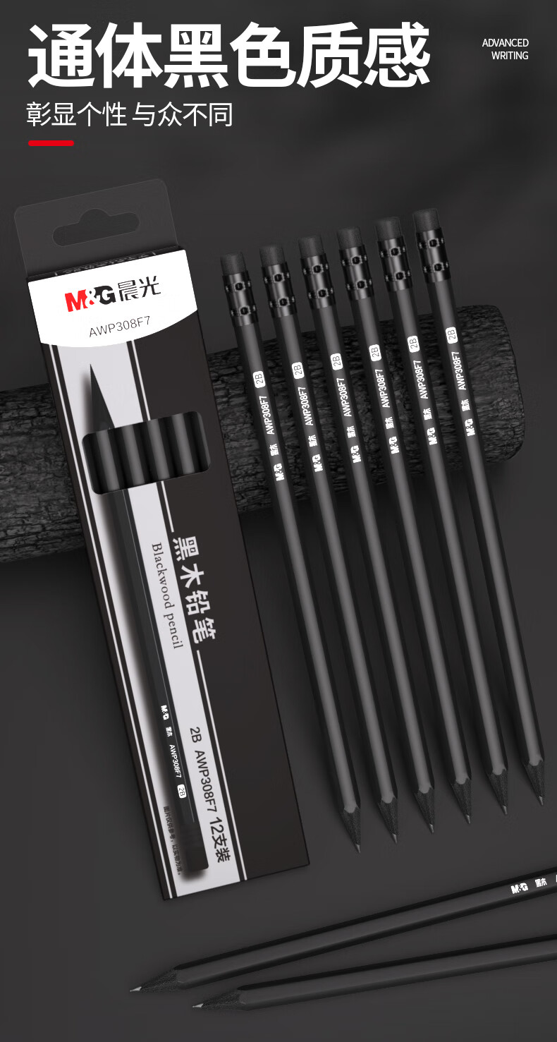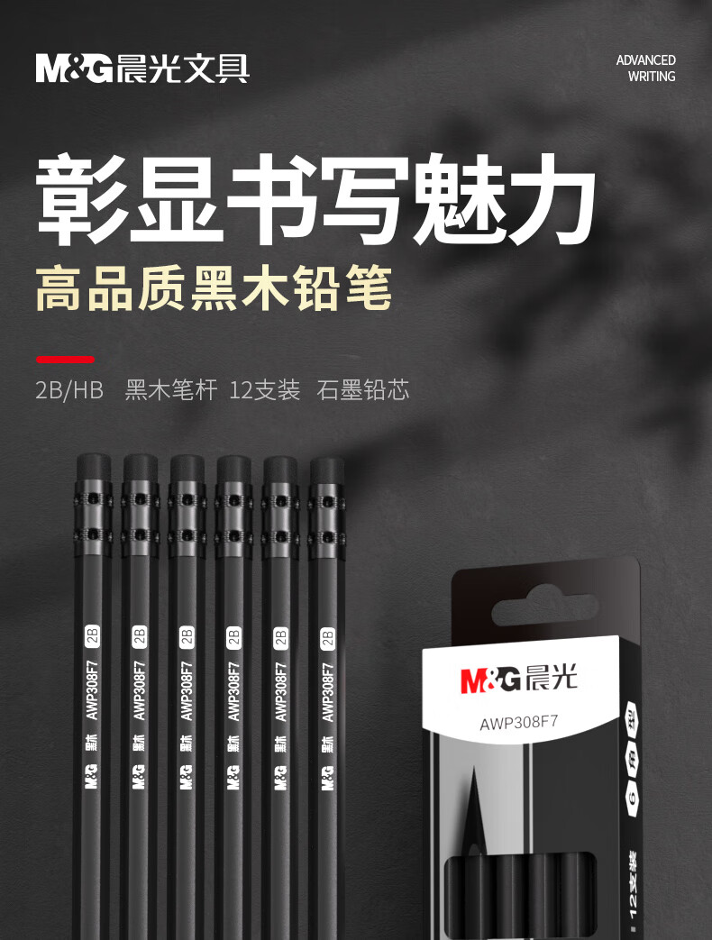 晨光(M&G)文具黑木铅笔 HB带橡皮头木杆铅笔 高档六角笔杆寒假美术生素描书写铅笔 12支装AWP308F6