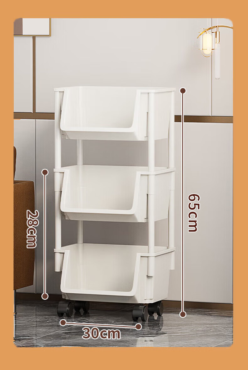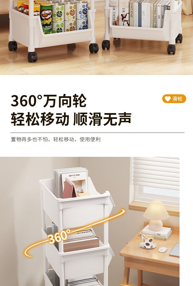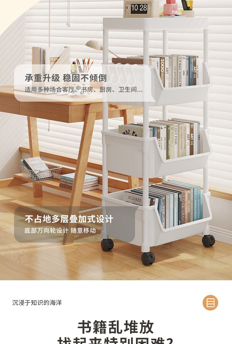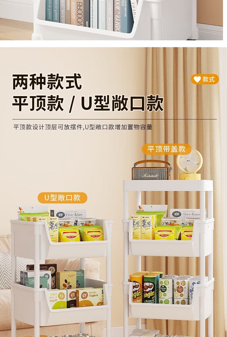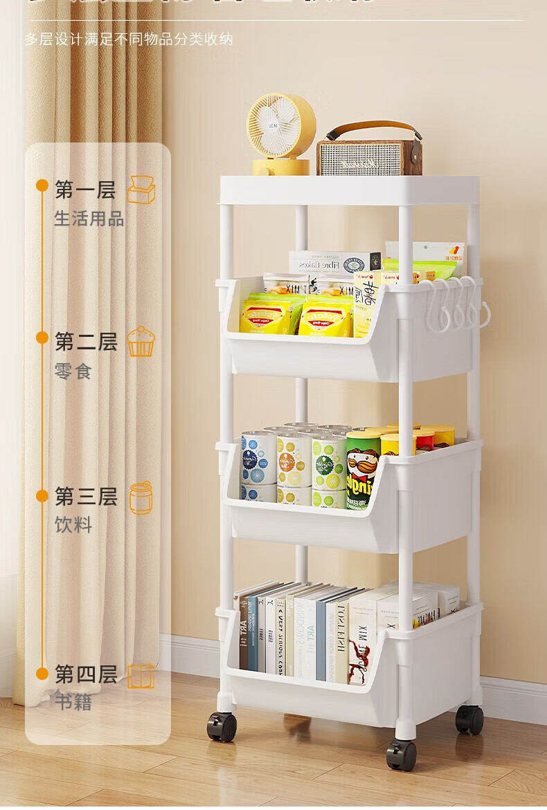小推车置物架落地浴室移动零食卫生间多层卧室床头多层收纳储物架 3层白-开口【加大加厚款】