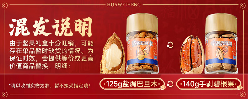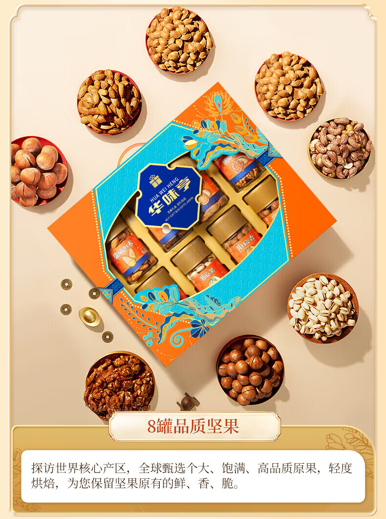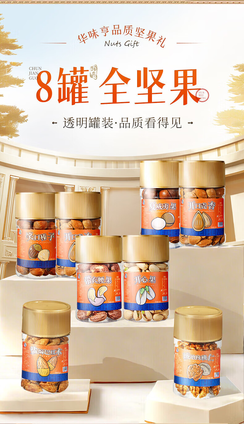 华味亨坚果礼遇礼盒1110g/8罐 纯坚果年货送礼团购开心果核桃休闲零食 罐装坚果礼盒1110g