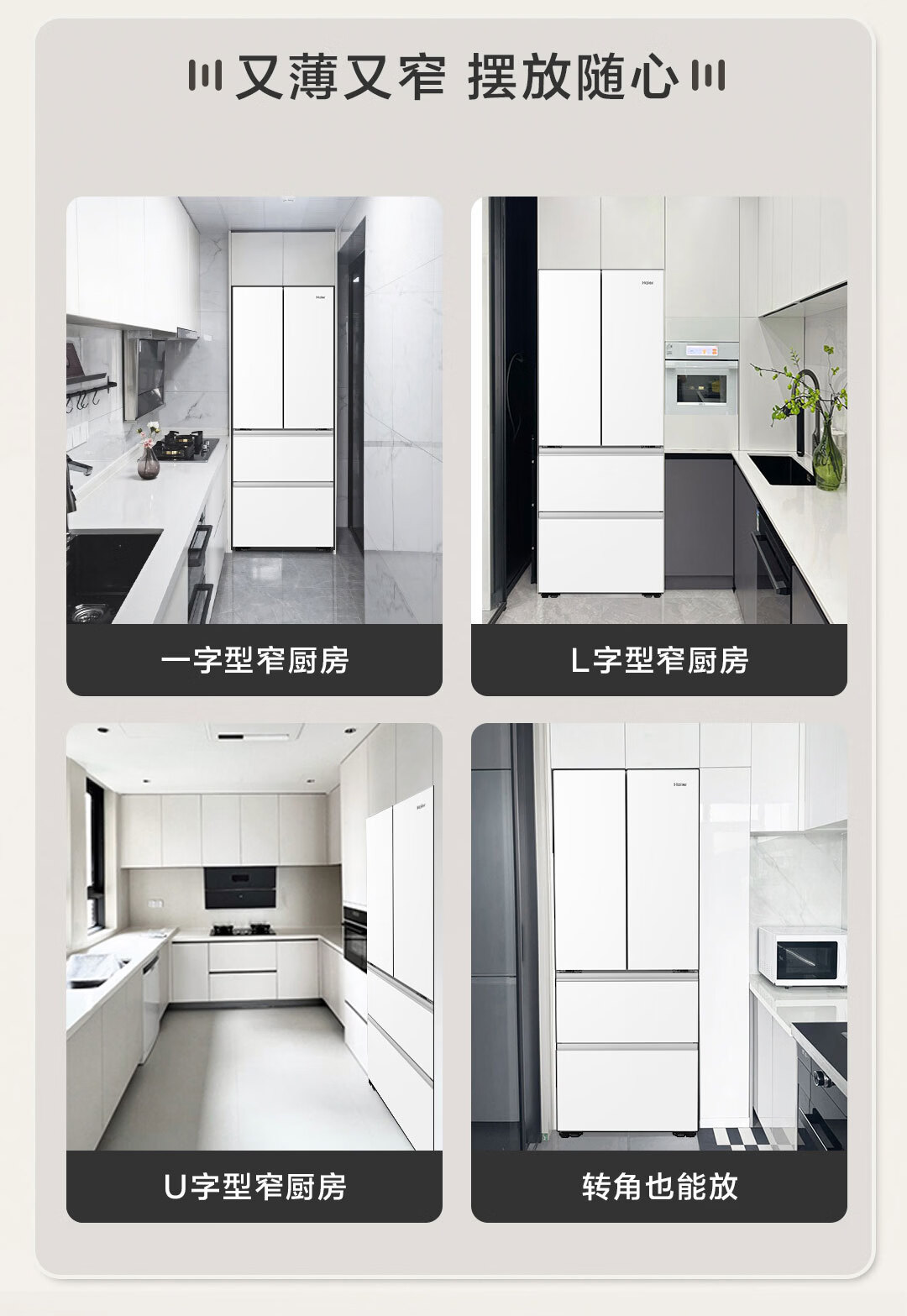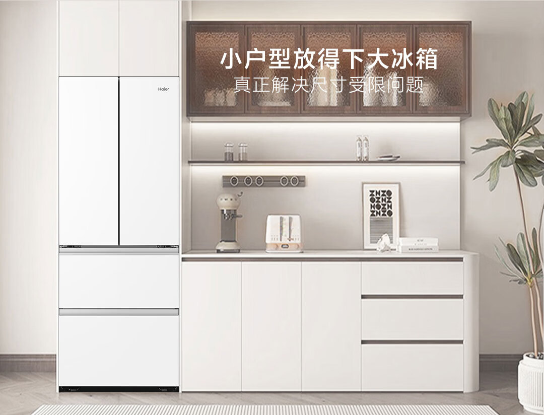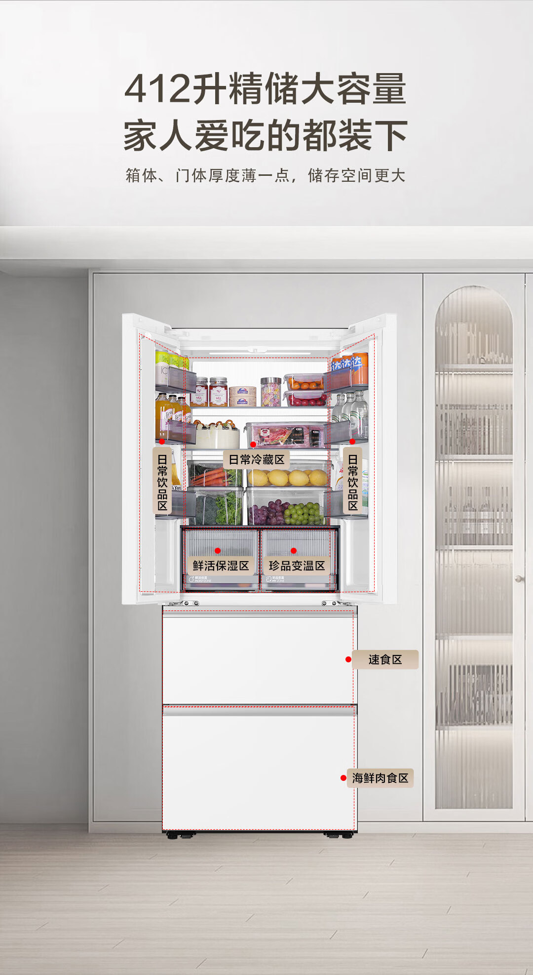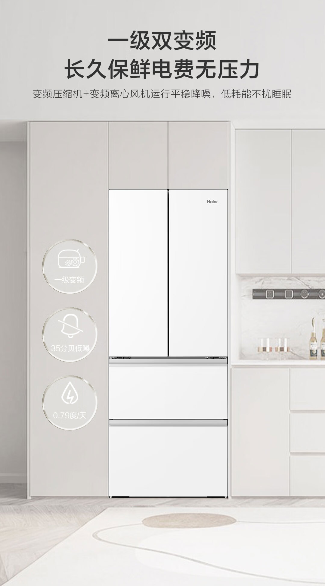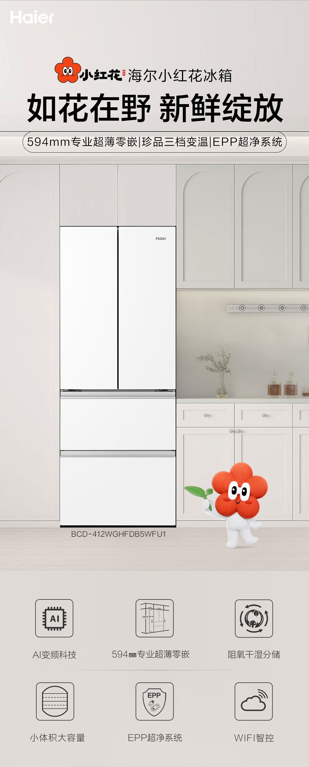 海尔(Haier)25新款小红花412升法式多门冰箱594mm超薄零嵌70超窄EPP超净阻氧干湿分储三档变温一级能效家用 BCD-412WGHFDB5WFU1咨询领政府补贴