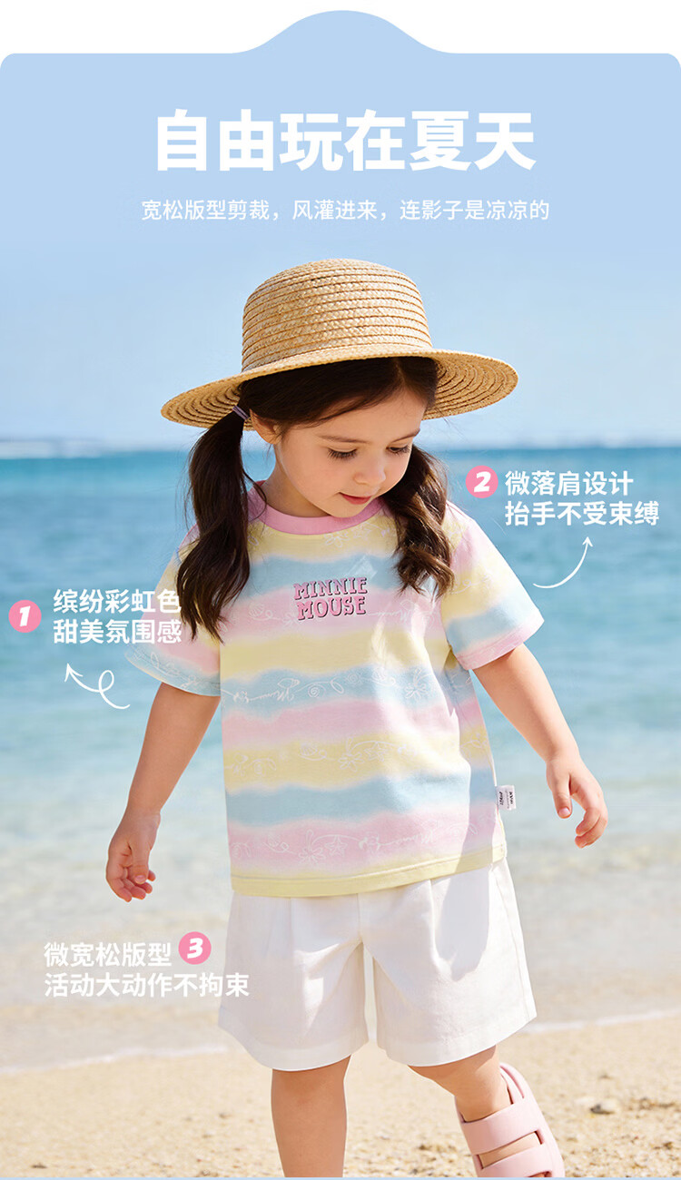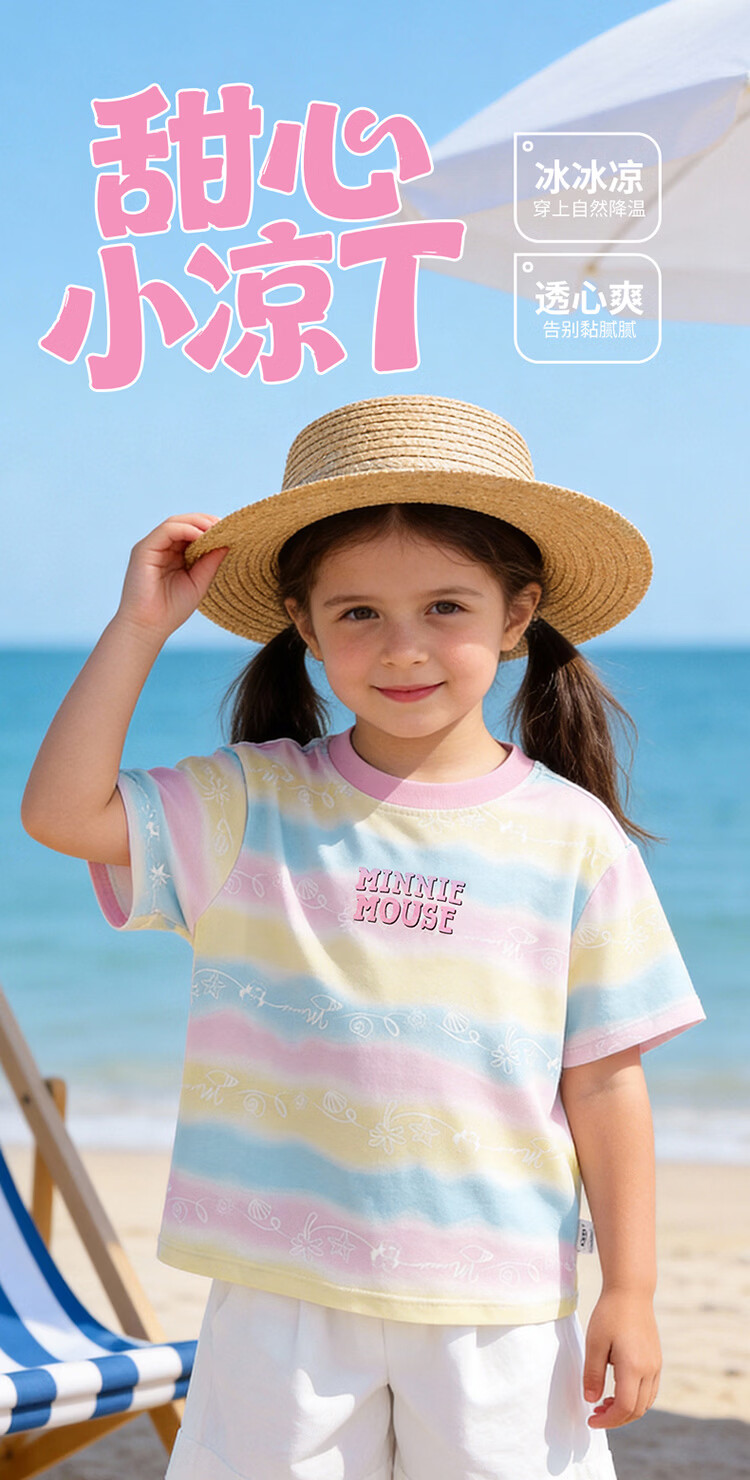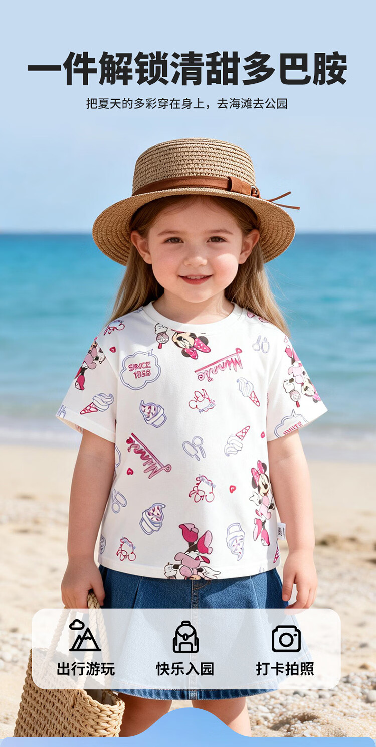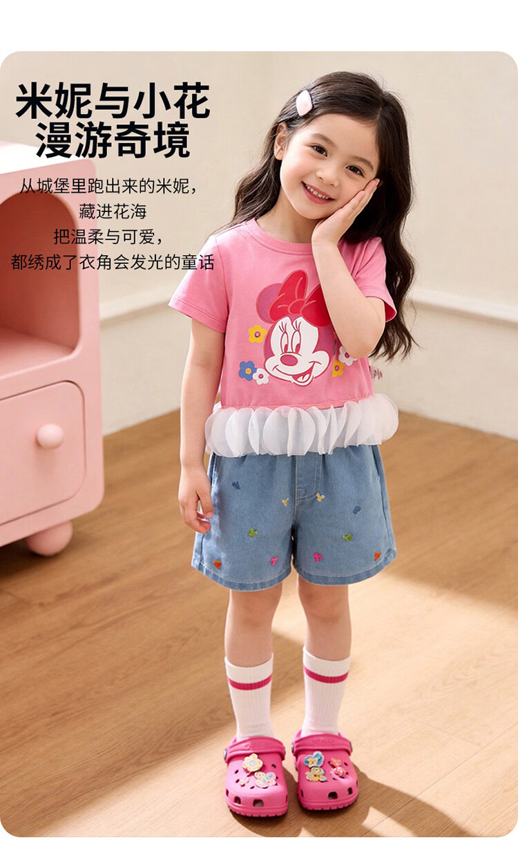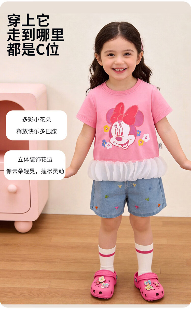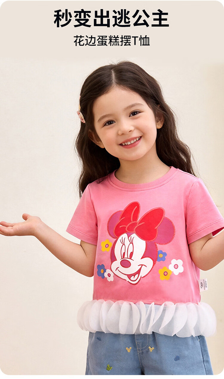 迪士尼(Disney)男女童夏季新款卡通凉感短袖T恤休闲运动7A抗菌儿童短袖童装 玫粉花边米妮 120 (建议4-6岁身高110-120cm)