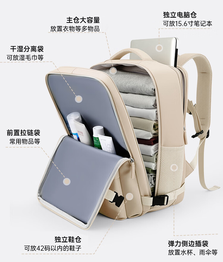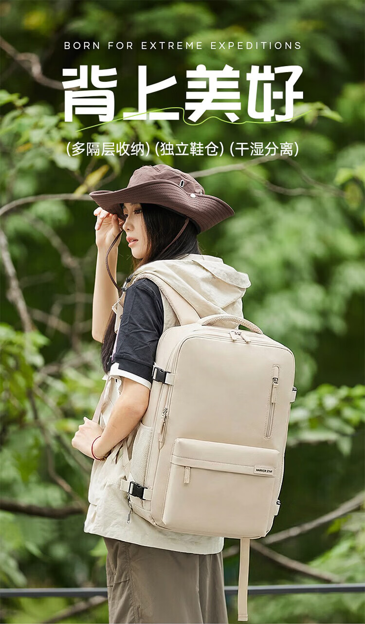新潮代旅行包男大容量商务双肩包手提休闲运动背包出差轻便户外登山包 卡其色【45L大容量+带干湿分离侧袋】