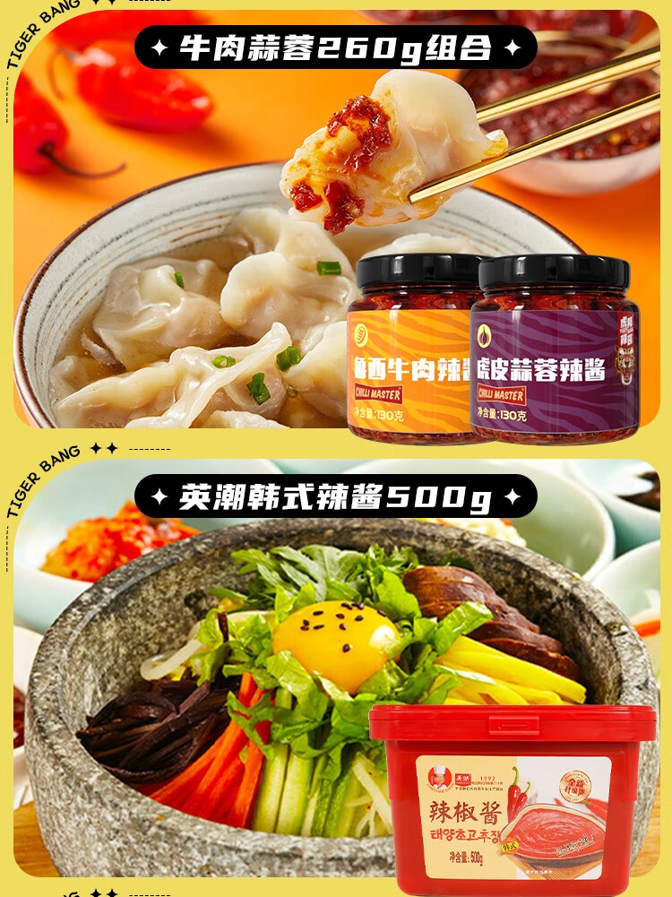 虎邦辣酱 鲁西风味牛肉酱麻辣香辣蒜蓉酱组合辣酱 拌面拌饭酱辣酱 香辣牛肉130g*2+麻辣牛肉130g*2+蒜蓉130g