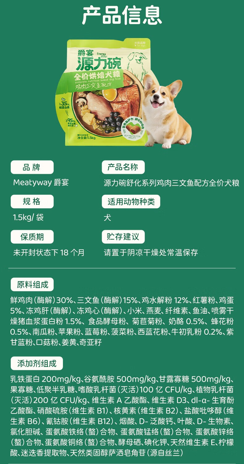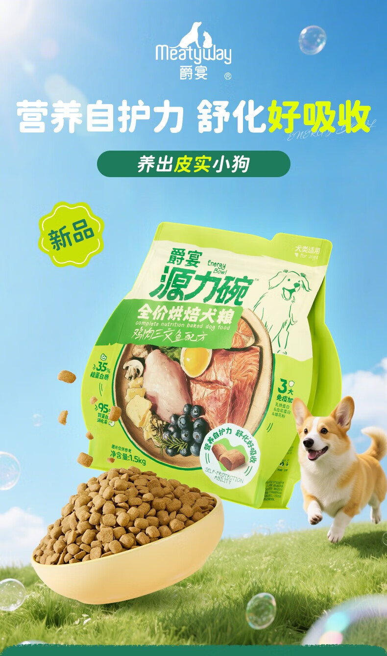 Meatyway爵宴源力碗狗粮全价烘焙粮鸡肉三文鱼 中小型成犬幼犬通用犬主粮 全价烘焙粮-鸡肉三文鱼配方 正装1.5kg*3包