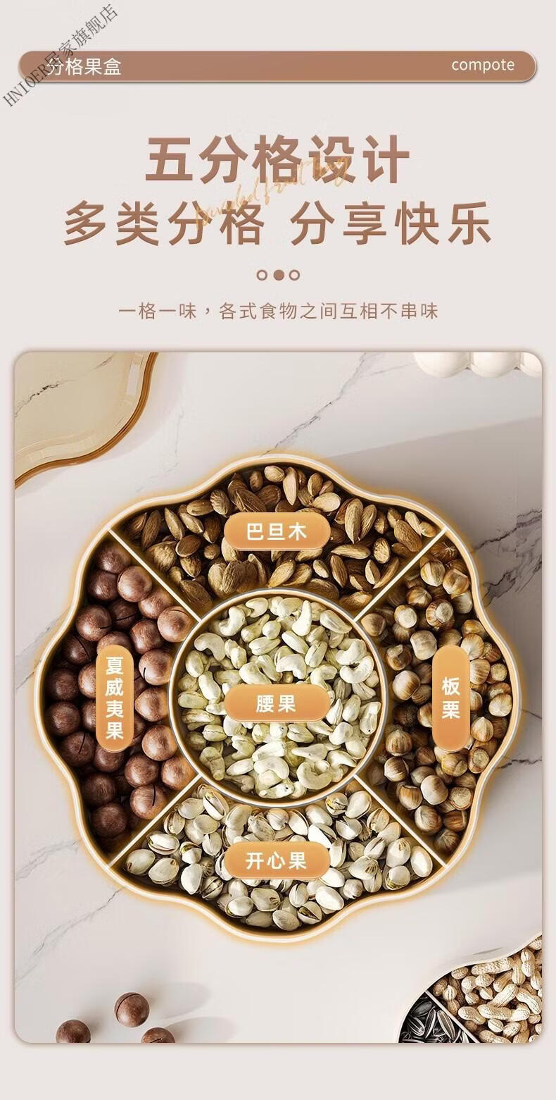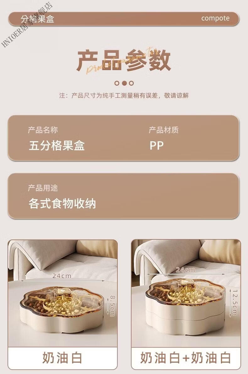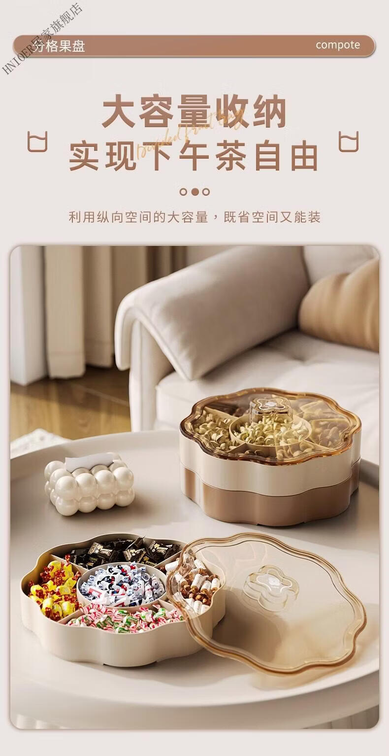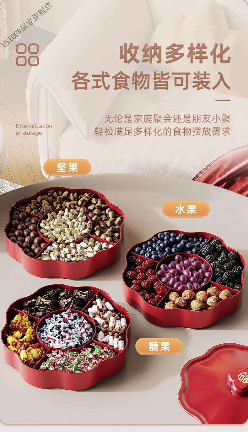 温诗欧果盘新年新婚水果盘坚果盘家用糖果盒客厅茶几瓜子零食摆盘收纳盒 奶油色-双层【五分格/带盖】