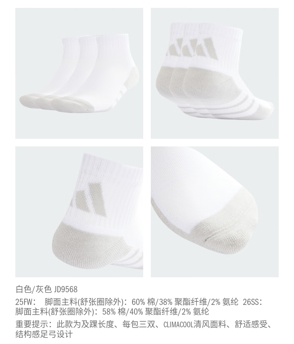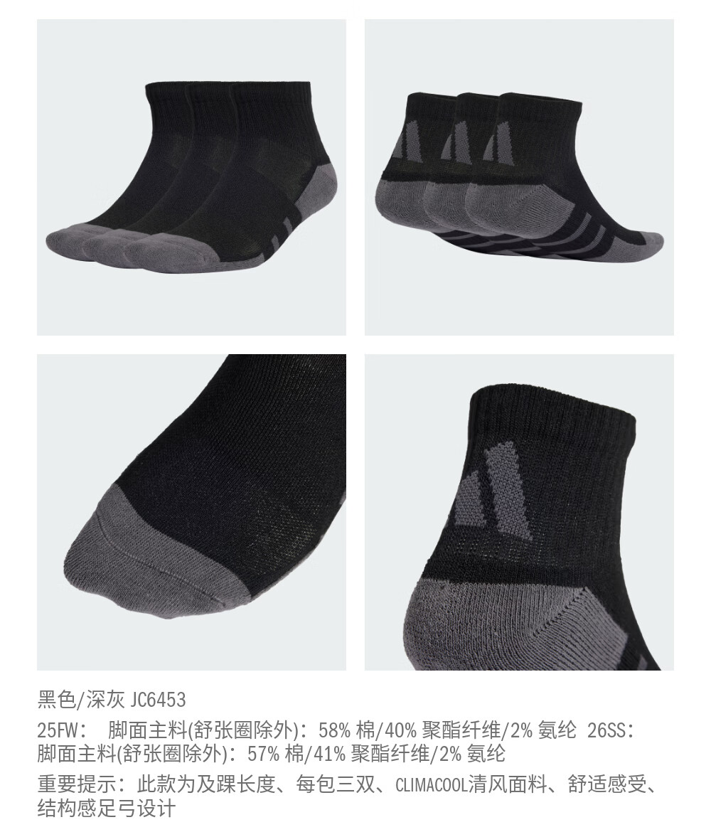 adidas三双装简约舒适袜子男女新款阿迪达斯官方 黑色/深灰 M