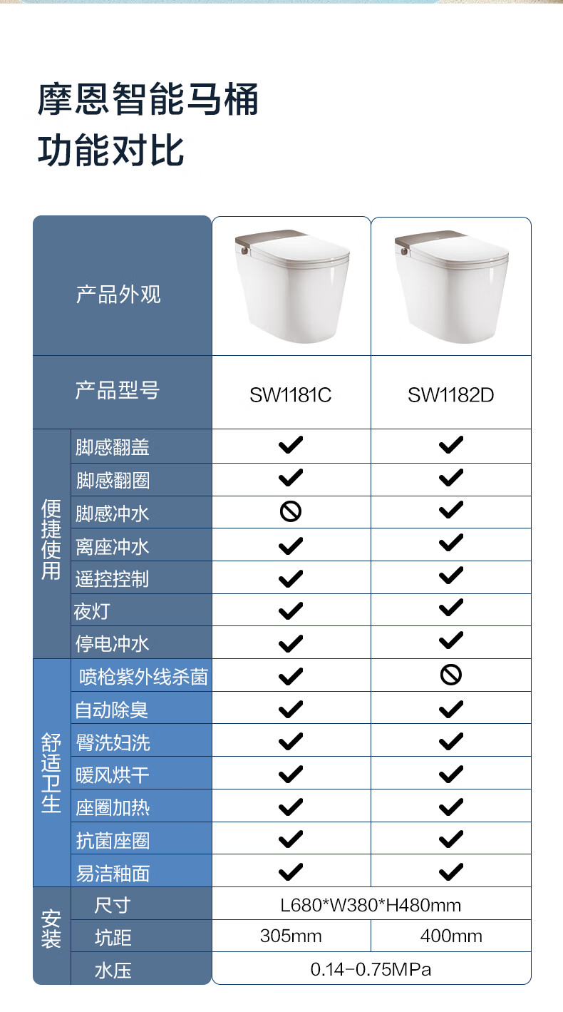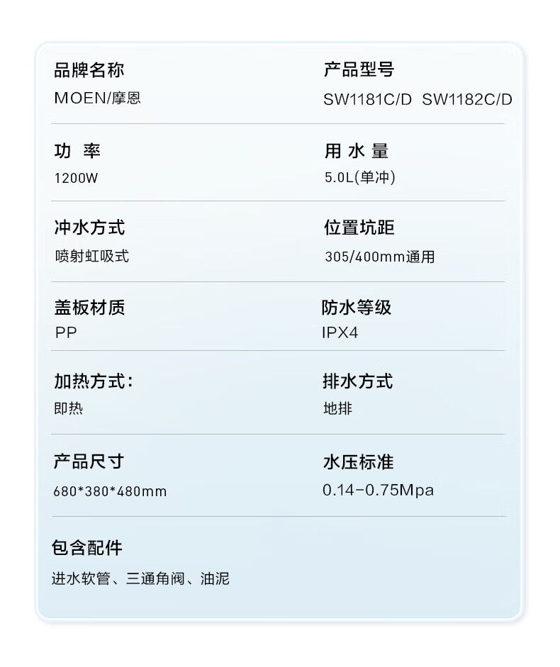 摩恩(MOEN)智能马桶小户型卫生间一体式坐便器家用加热SW1181C 智能一体坐便器(智能脚感翻圈+翻盖、自动除臭)