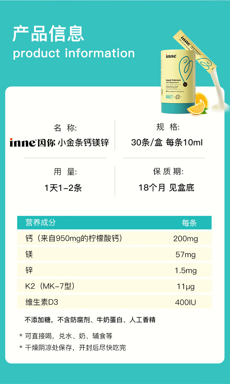 Inne因你钙镁锌小金条液体钙儿童钙维生素d3婴儿香橙味3条体验装