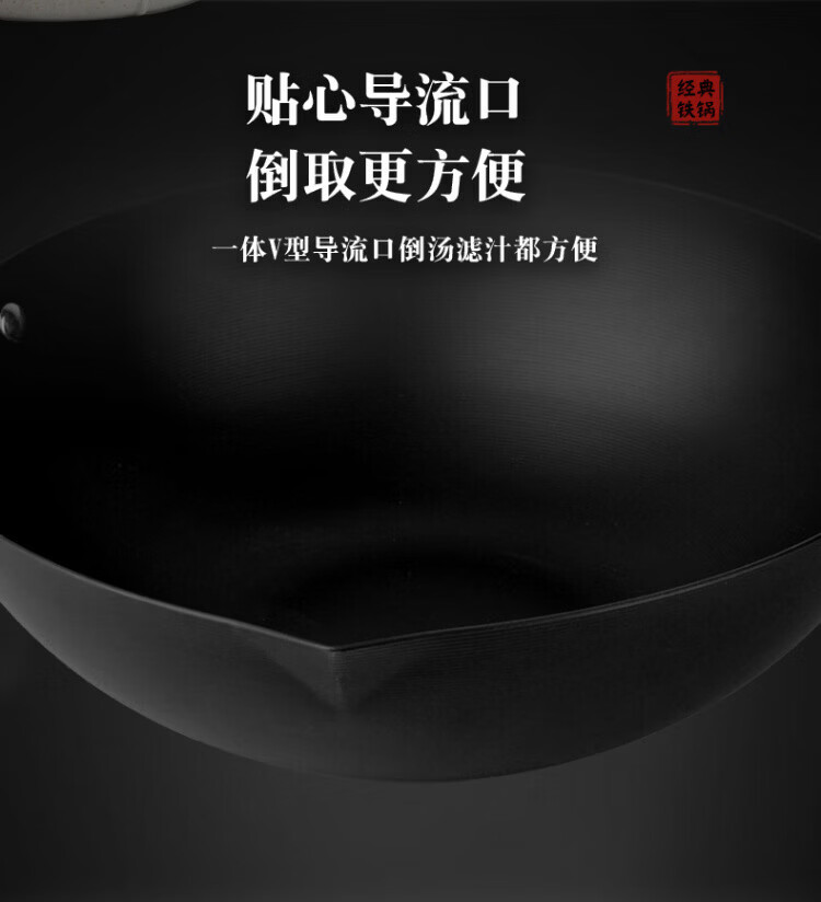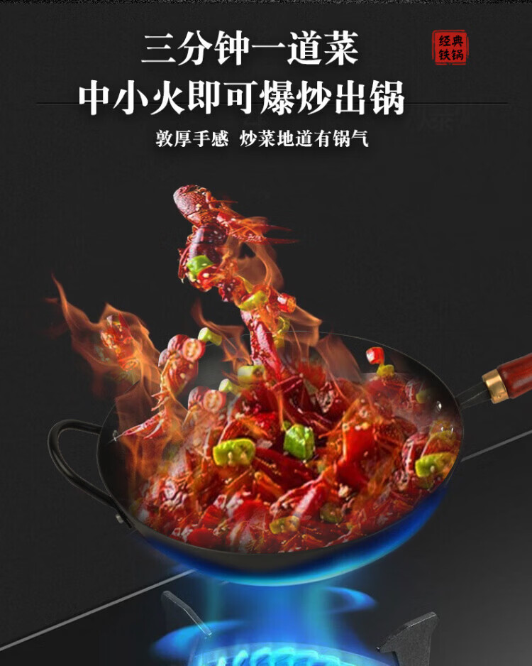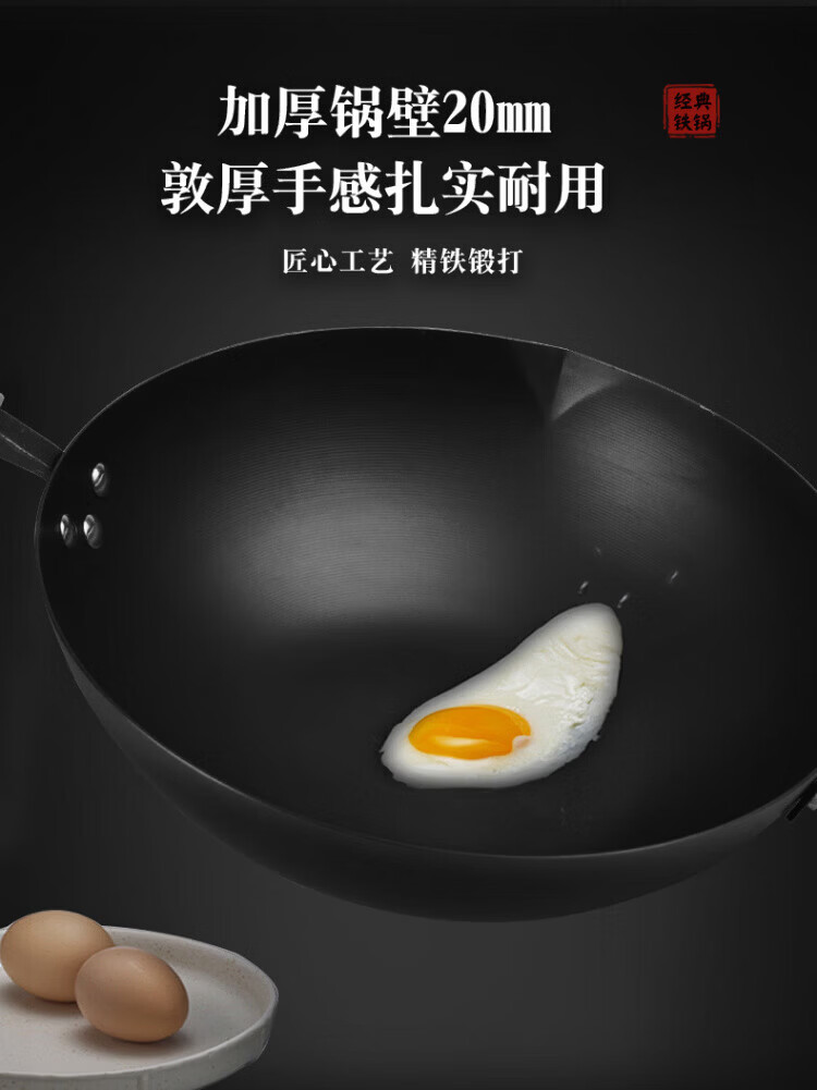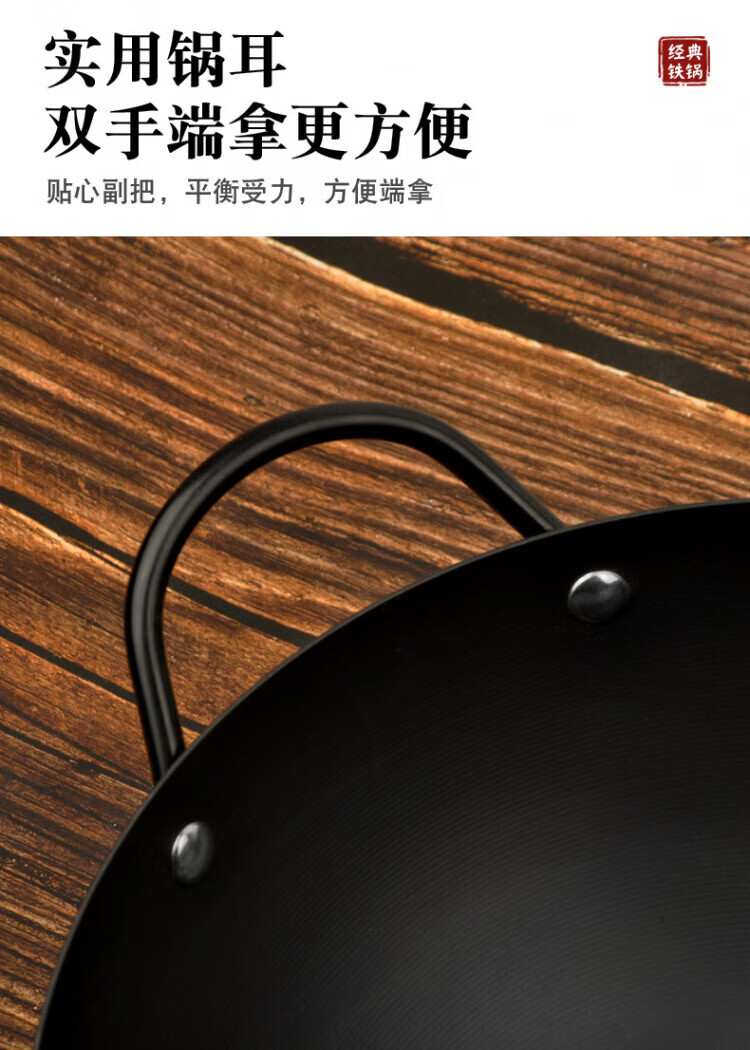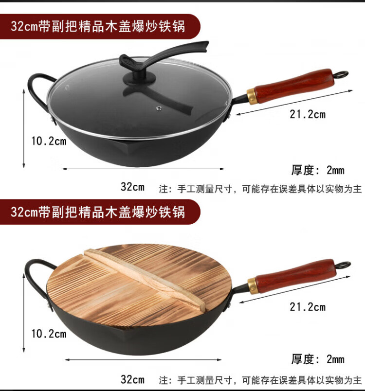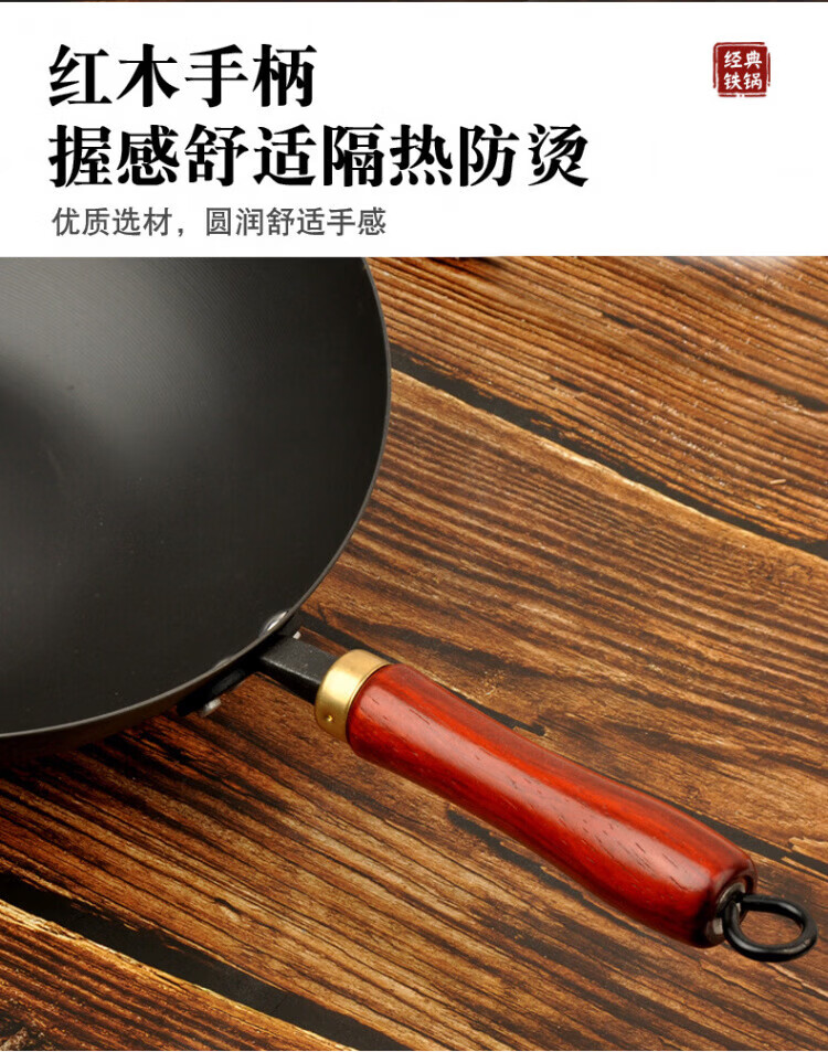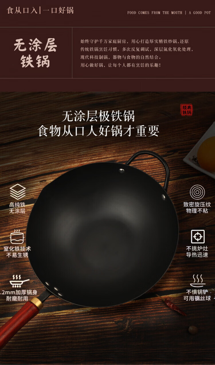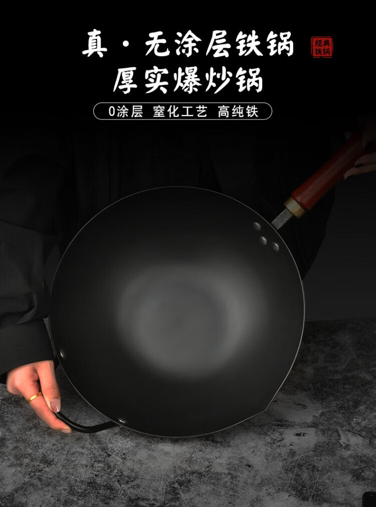 OCMOGO日本品牌不粘锅爆炒锅家用平底炒菜锅熟铁氮化无涂层铁锅电磁炉燃 爆炒锅 32cm 【带木盖】
