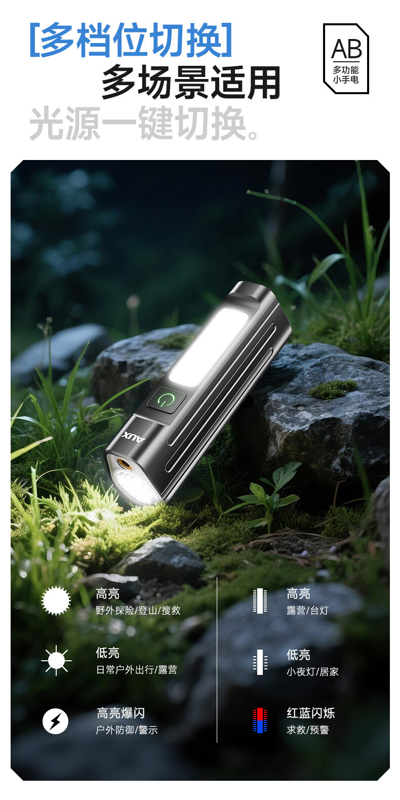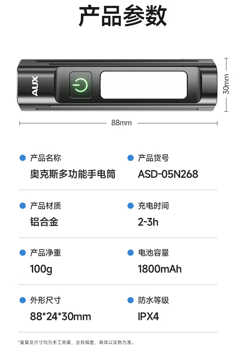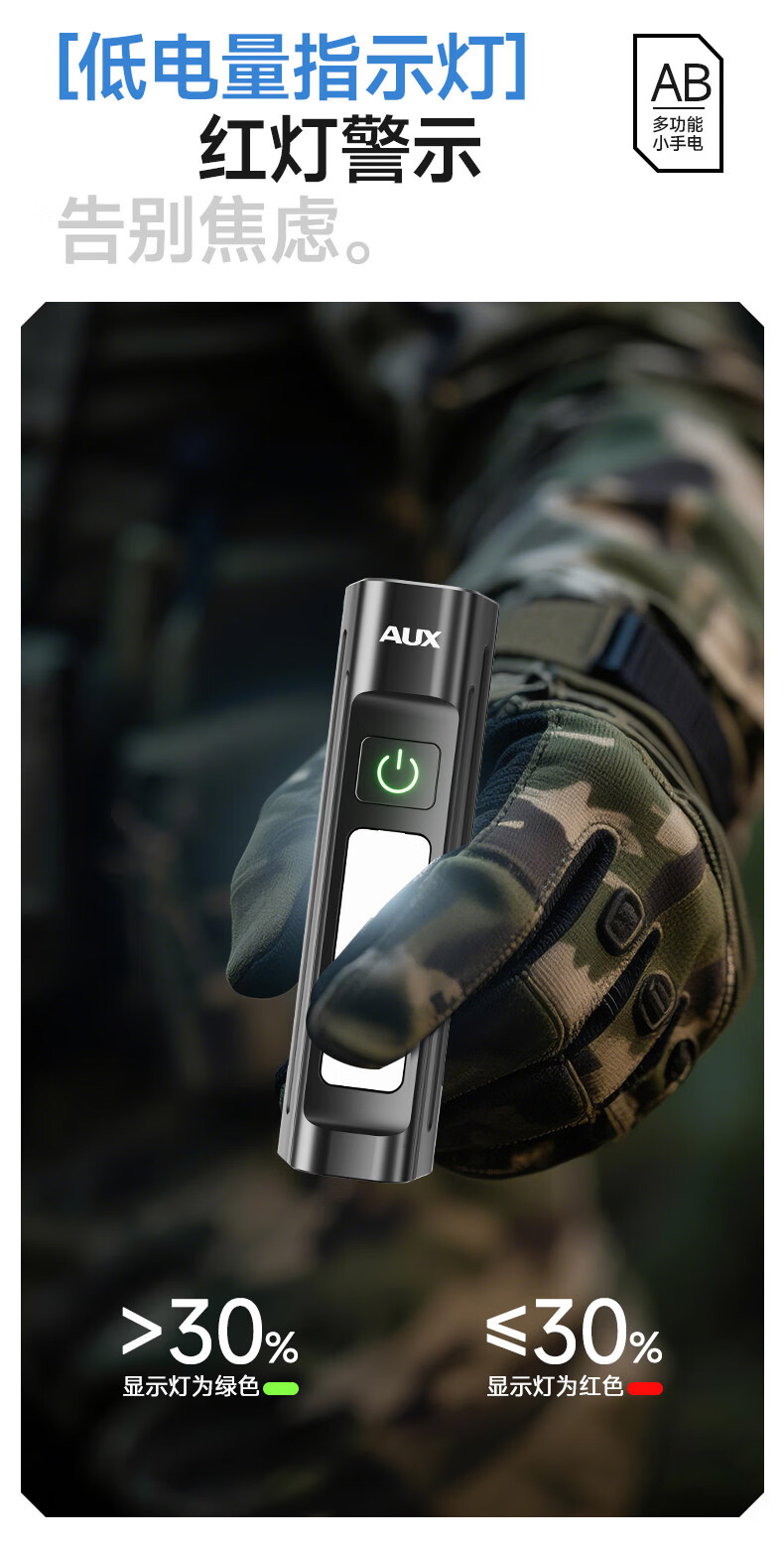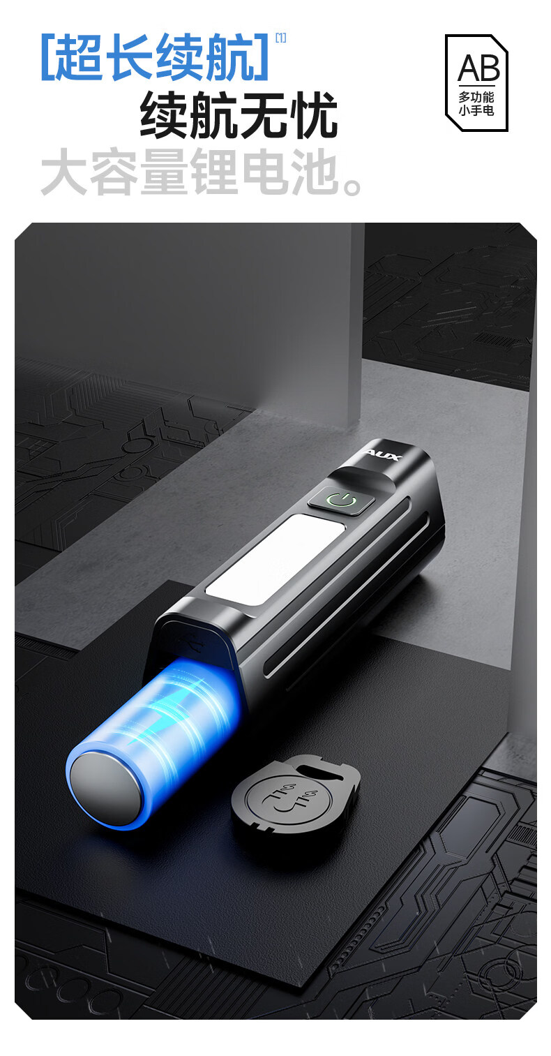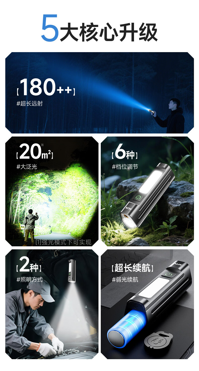 奥克斯(AUX)手电筒强光充电超长续航大容量家用户外小型便携远射超亮大功率 【升级款-银色】液晶电显+Type-C快充+高亮侧灯