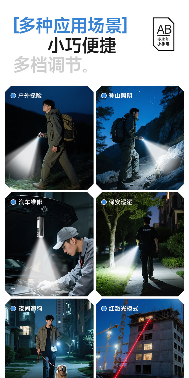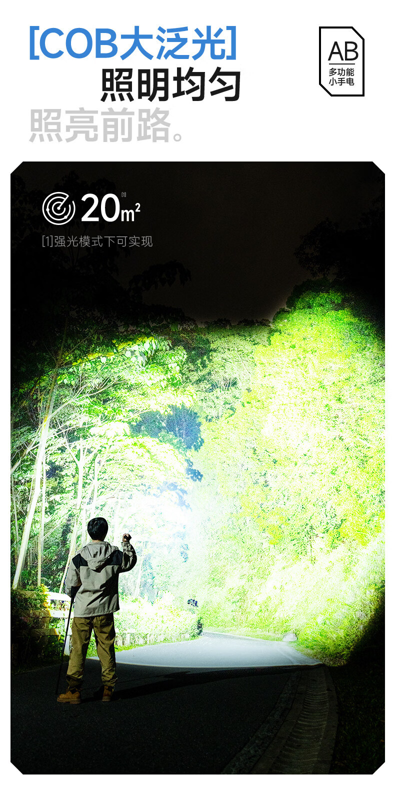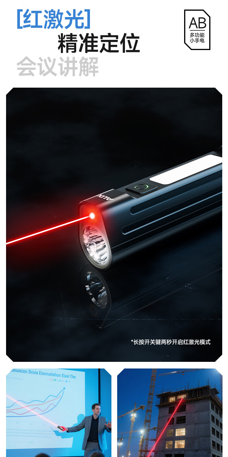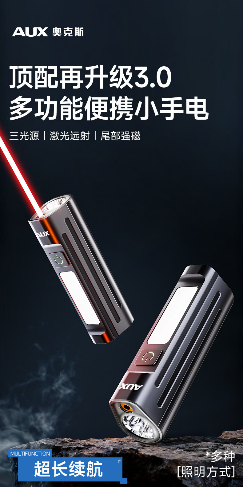 奥克斯(AUX)手电筒强光充电超长续航大容量家用户外小型便携远射超亮大功率 【升级款-银色】液晶电显+Type-C快充+高亮侧灯
