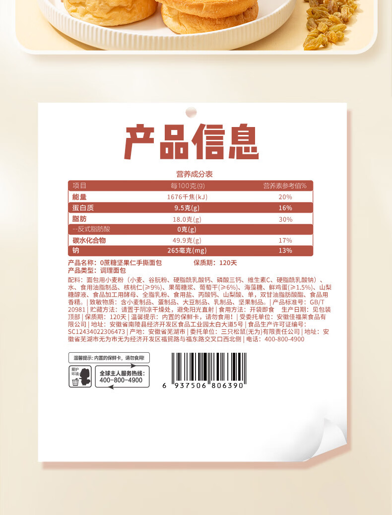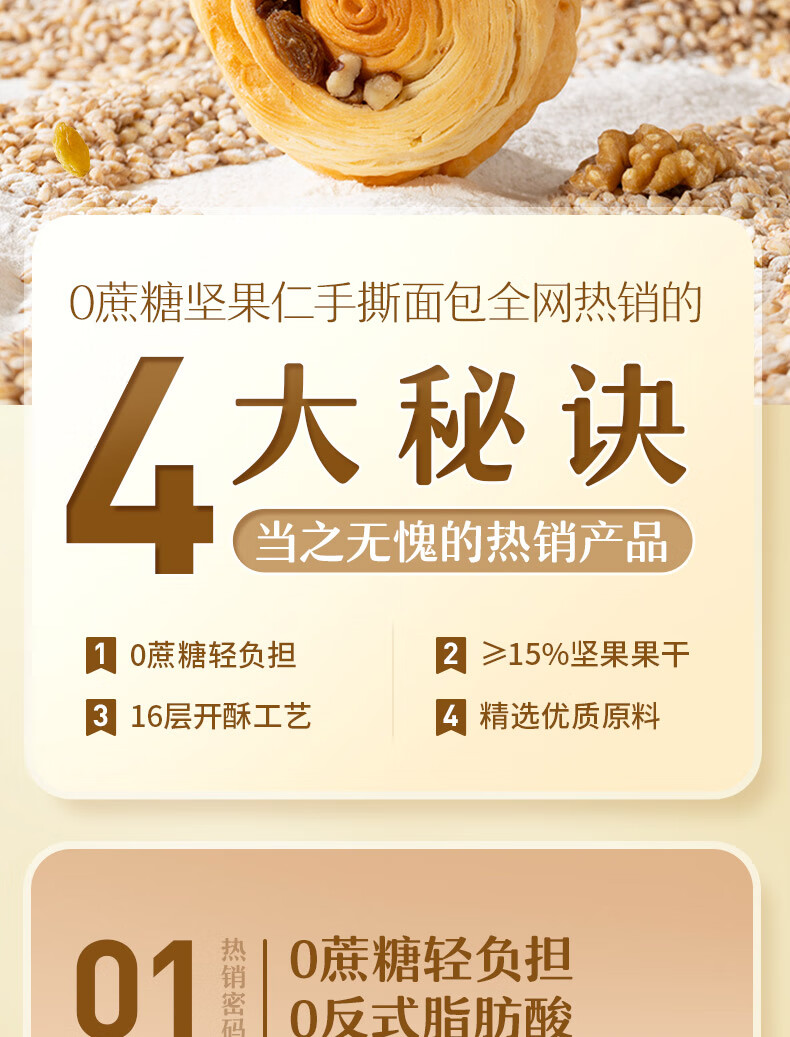 三只松鼠无蔗糖坚果仁手撕面包1.1kg 早餐小面包吐司蛋糕代餐饱腹整箱点心
