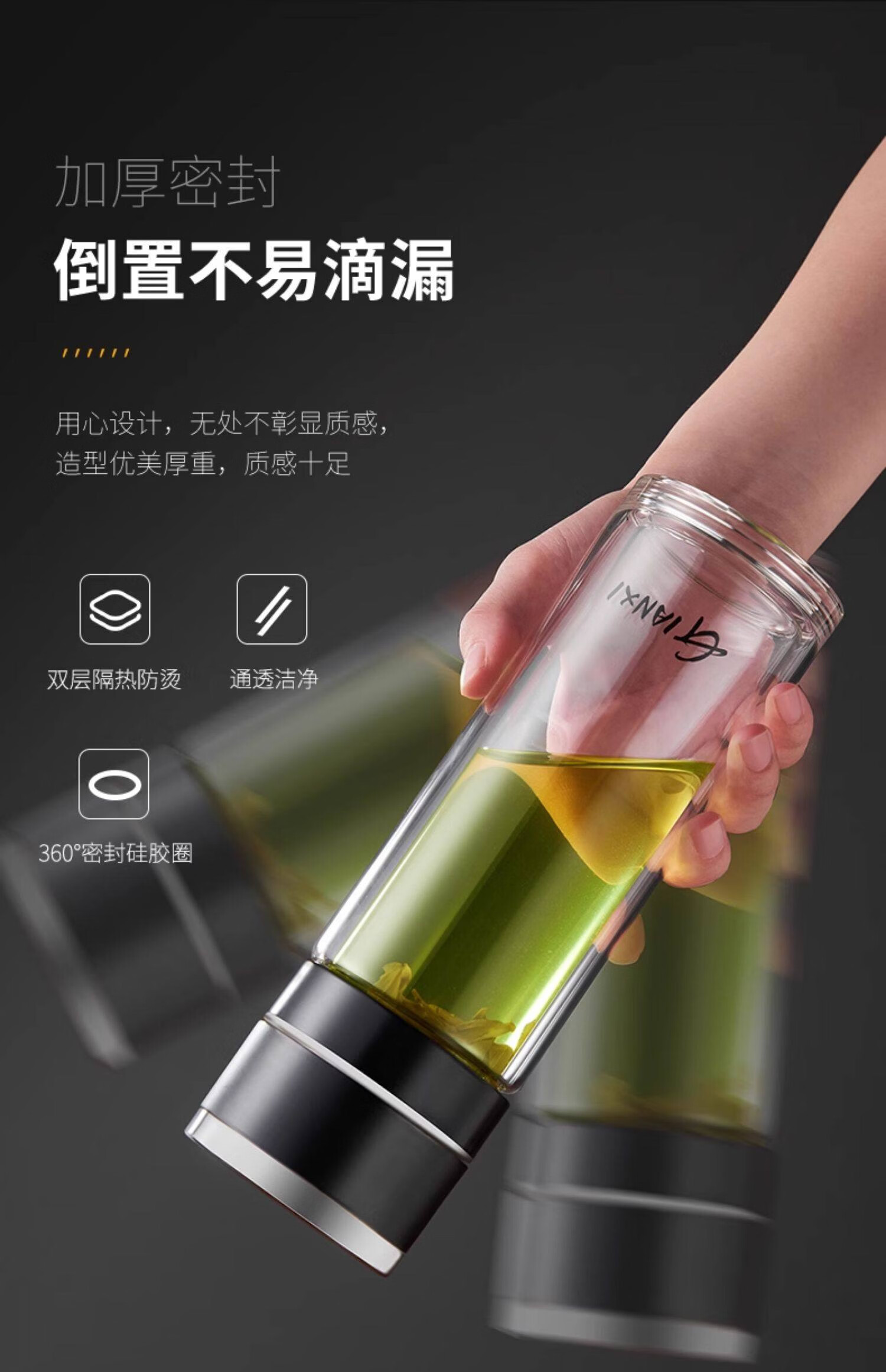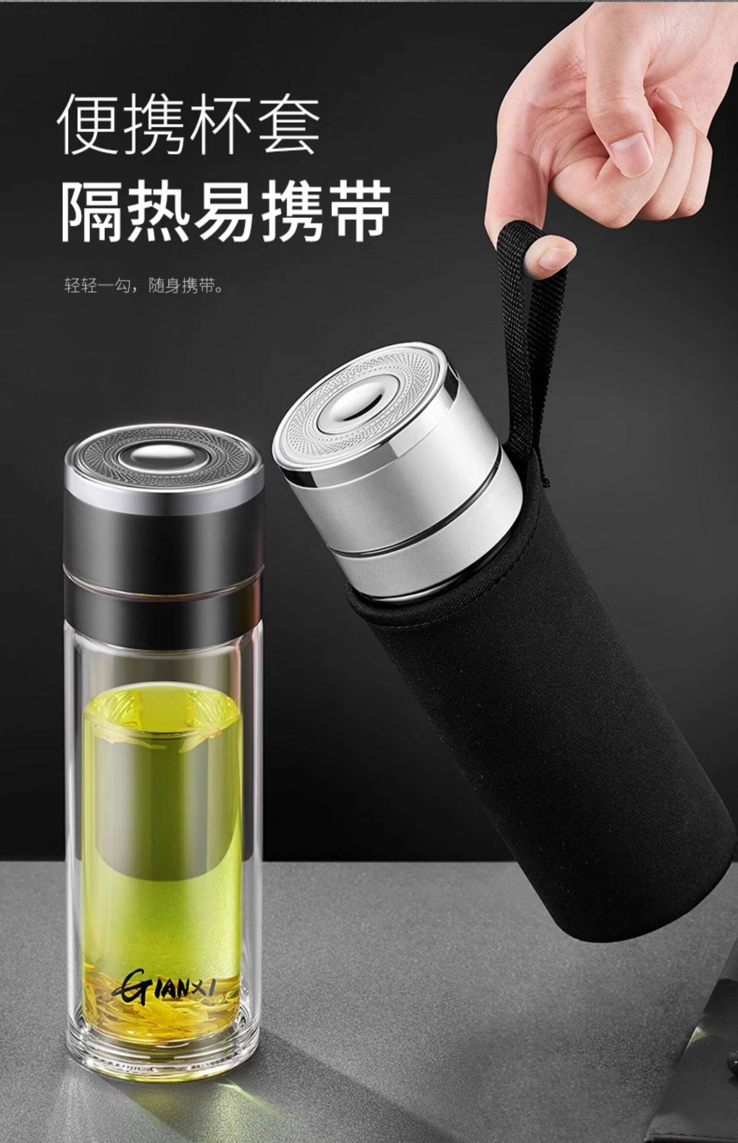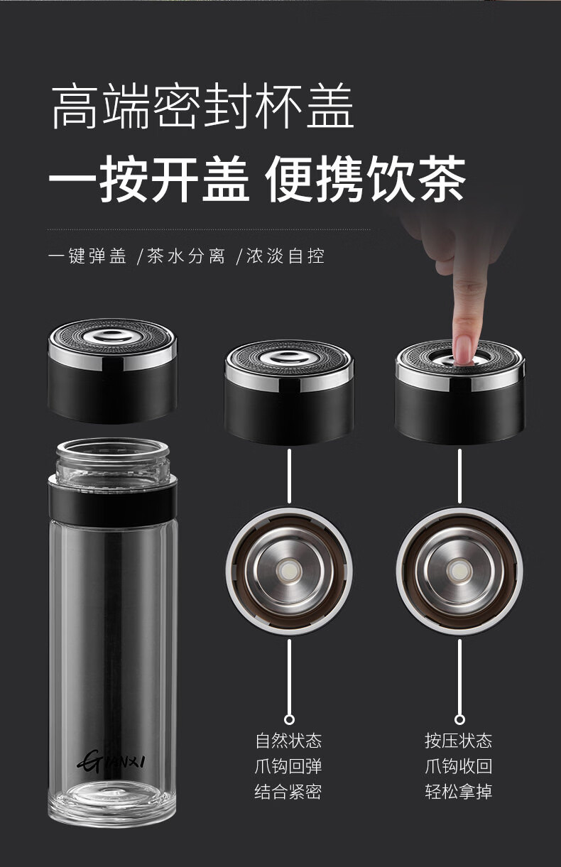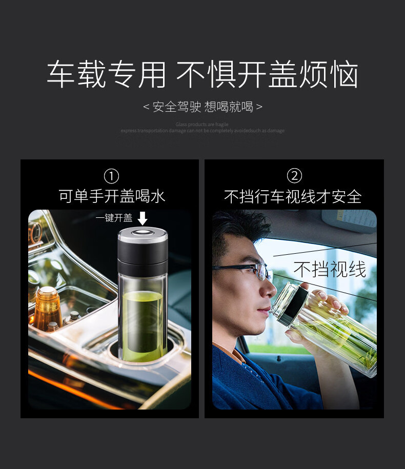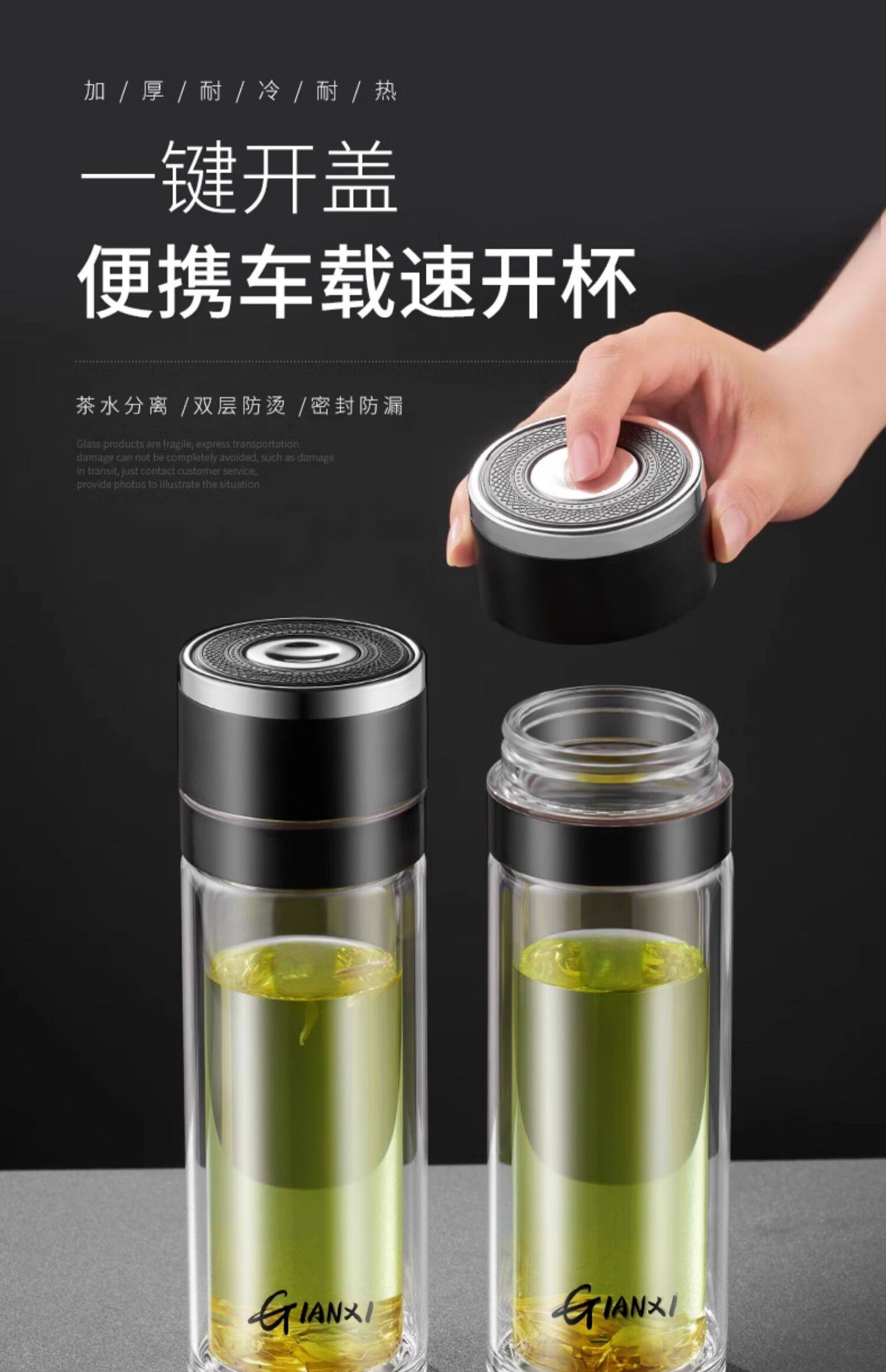 GERTHRON德国一键开盖双层玻璃杯男女士水杯2026新款车载茶水分离泡茶杯 双层加厚绅士黑【赠杯套+杯刷】 500ml