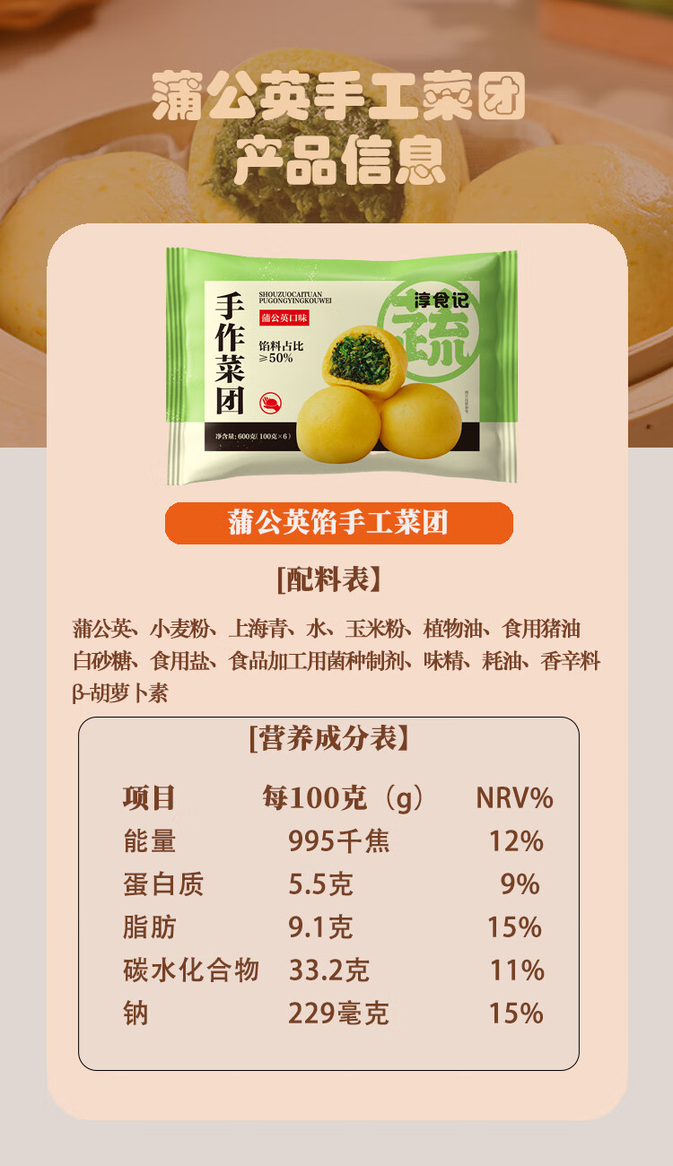 淳食记手作蒲公英菜团子粗粮早餐冻品面点半成品儿童早餐家常风味600g 3袋装100g*18个
