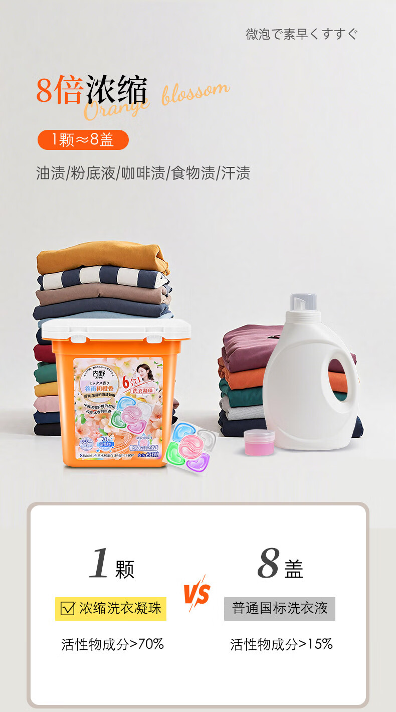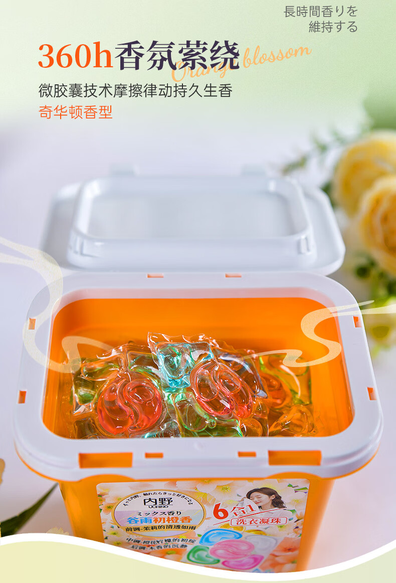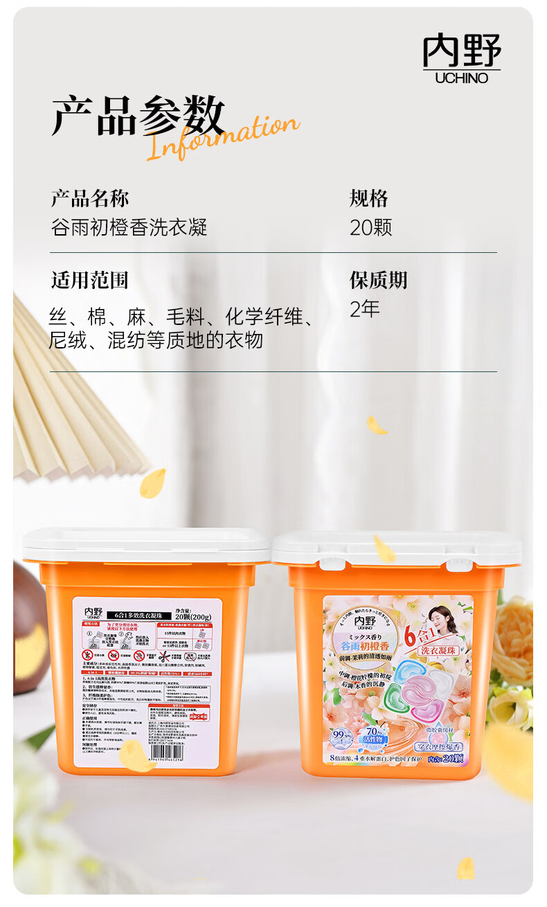 内野(UCHINO)香氛洗衣凝珠20颗浓缩洗衣液 99%抑菌除螨洁净柔护橙香持久留香 洗衣凝珠试用装4粒