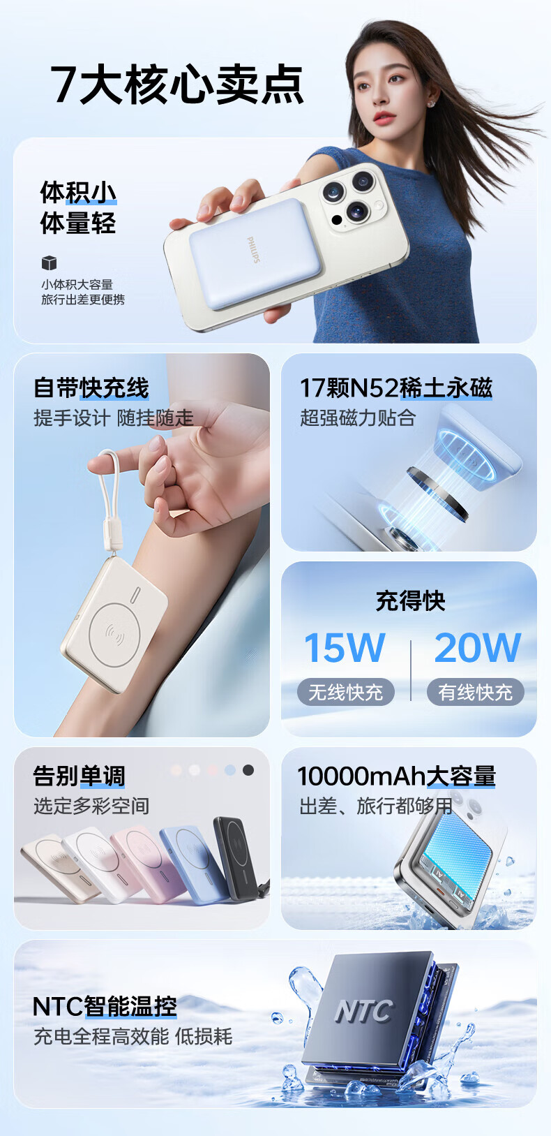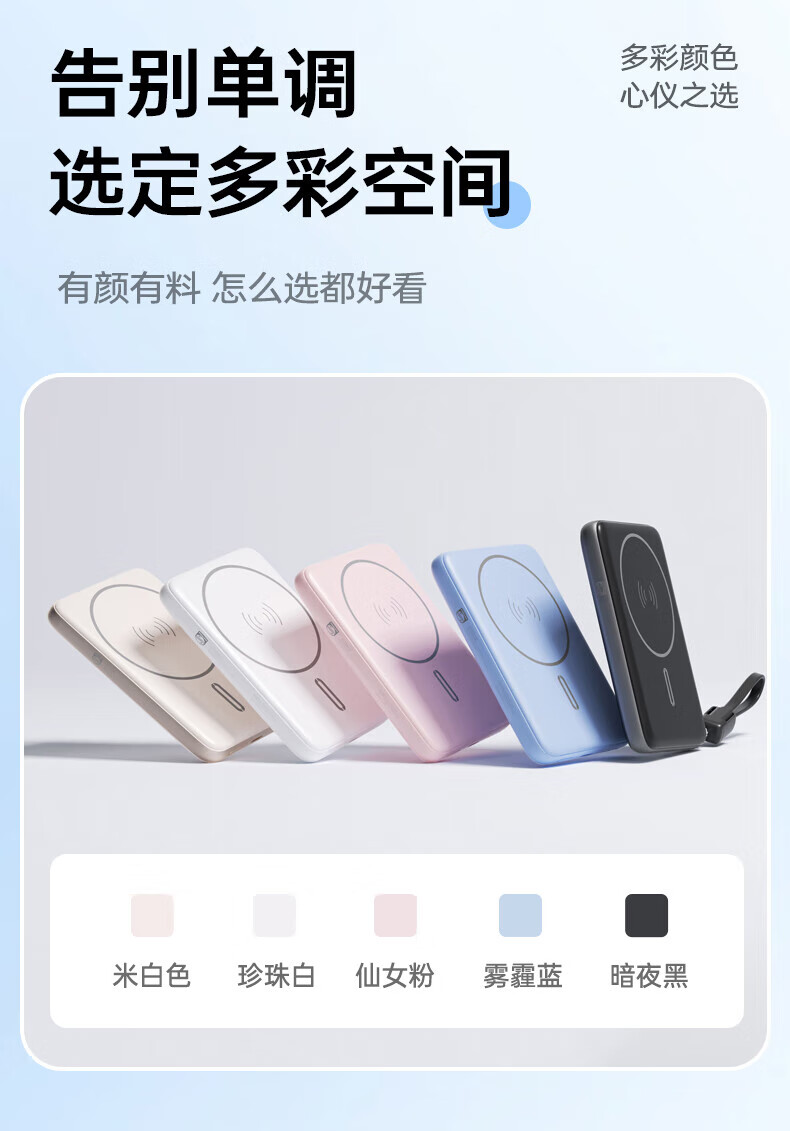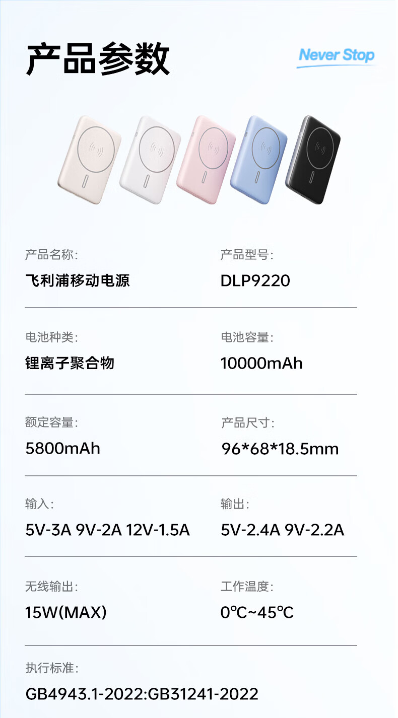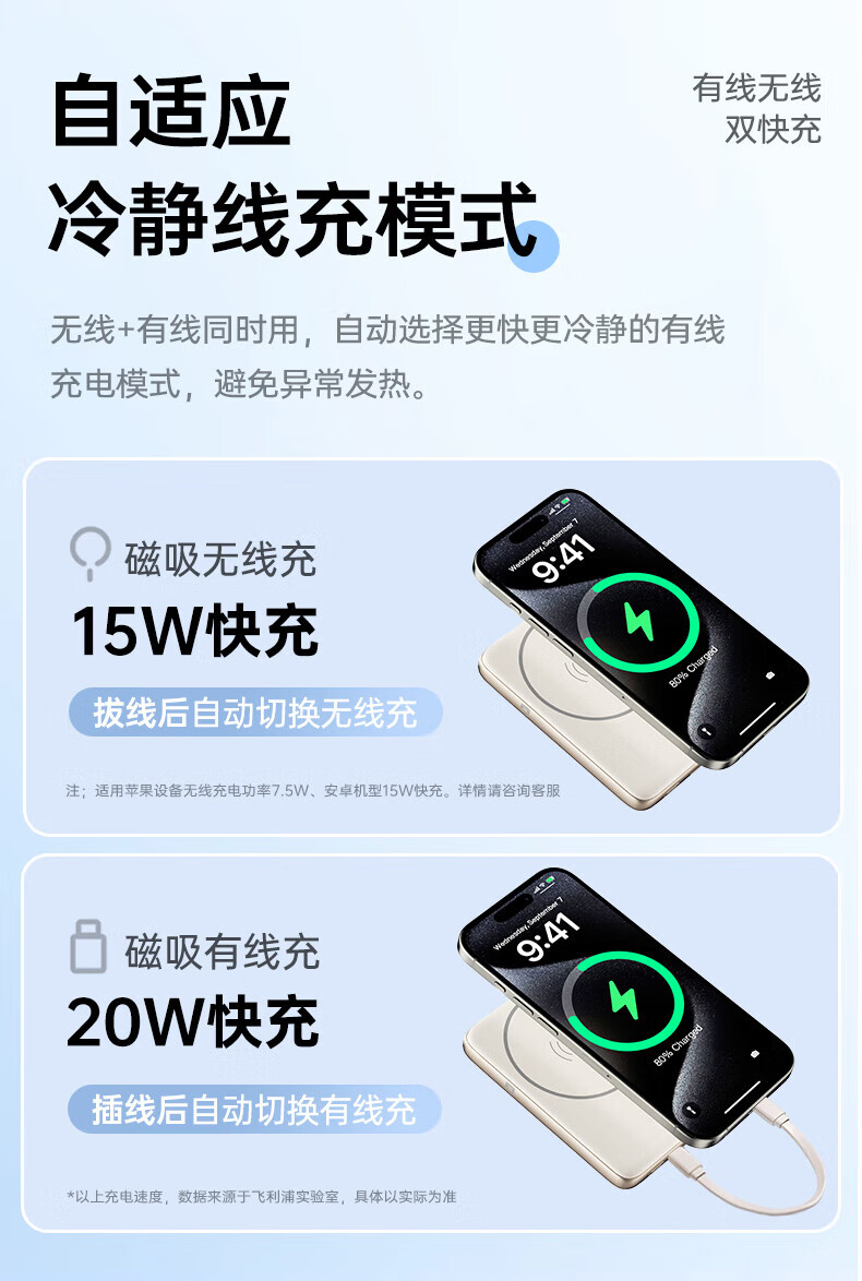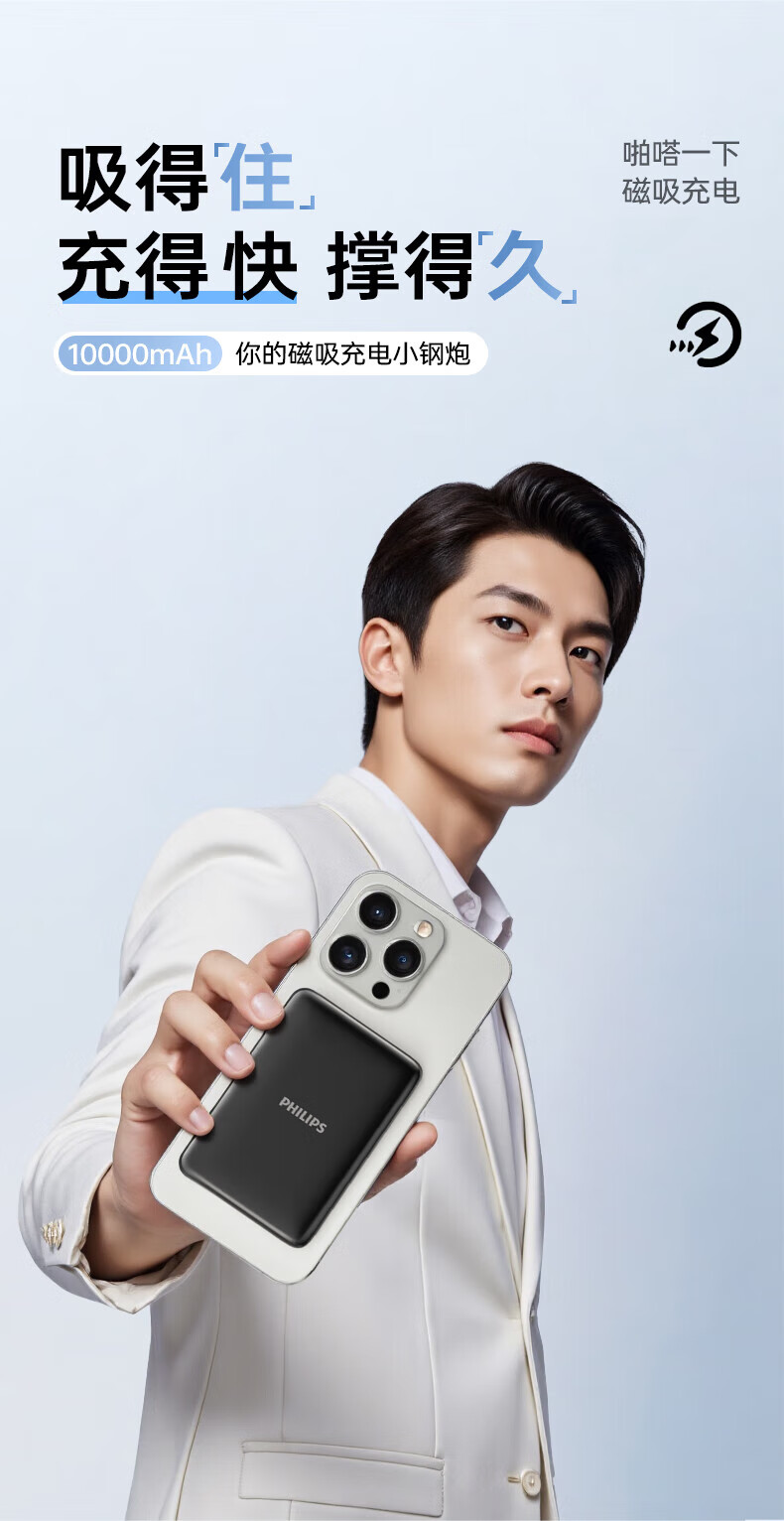 飞利浦(PHILIPS)无线磁吸充电宝一万毫安DLP9220自带线 3c认证手机移动电源快充超薄小巧便携迷你大容量 DLP9221【双线PD手机快充20W】 暗夜黑