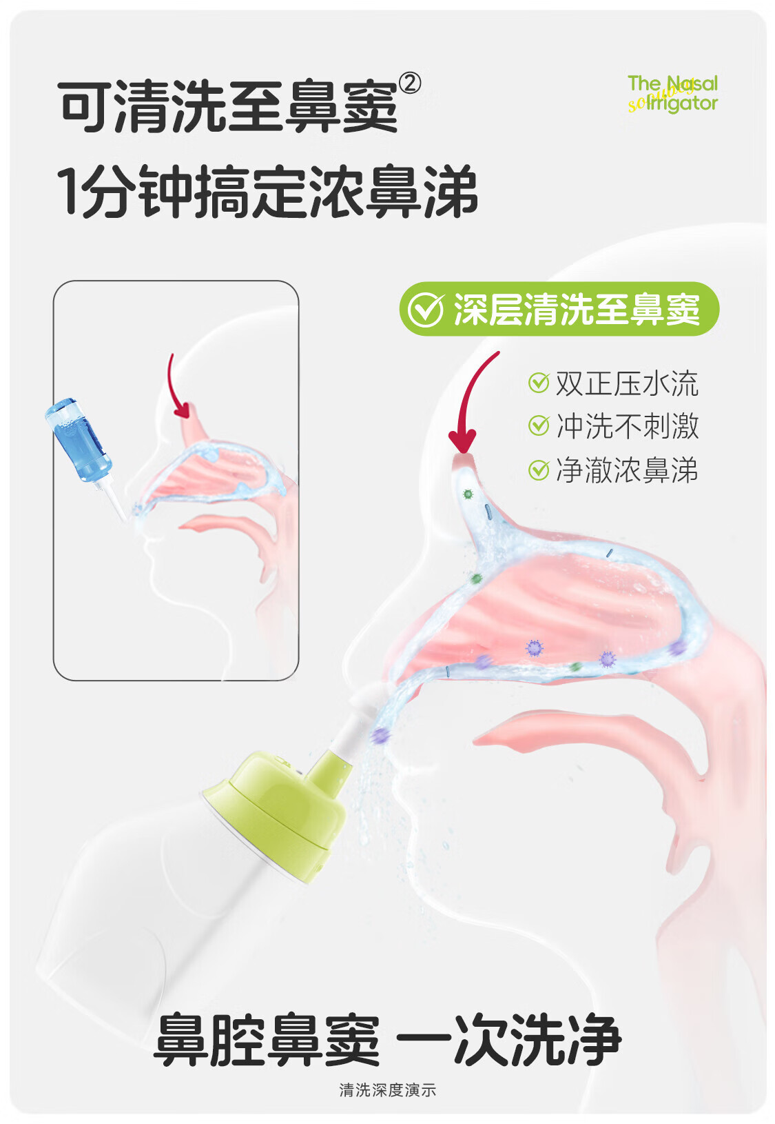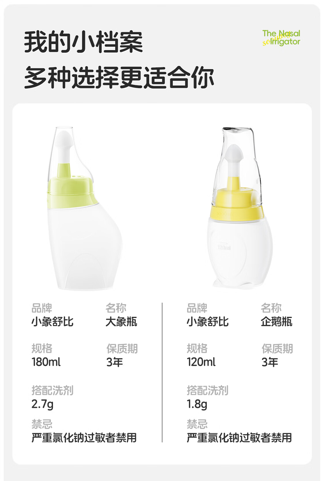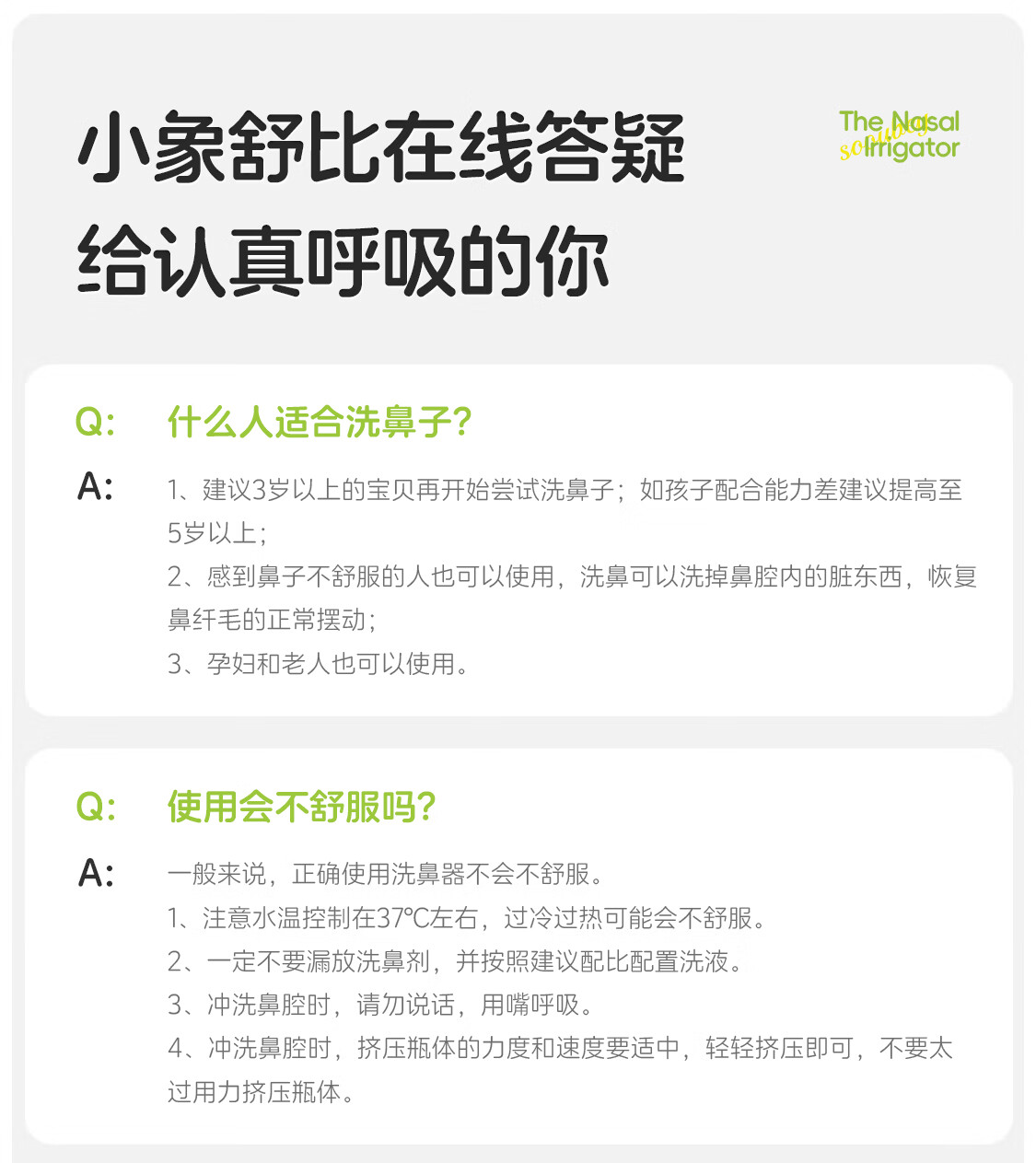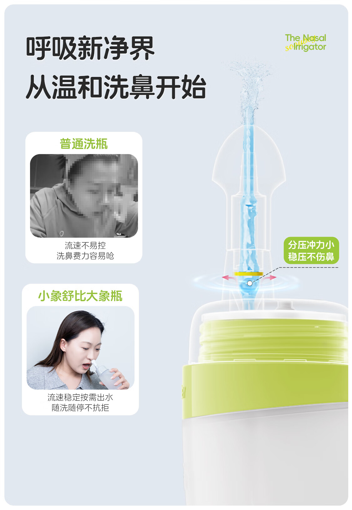 小象舒比洗鼻器儿童鼻炎医用成人鼻腔冲洗器家用手动洗鼻壶洗鼻盐生理盐水 【新品生机绿体验】180ml洗鼻器+10袋洗鼻剂