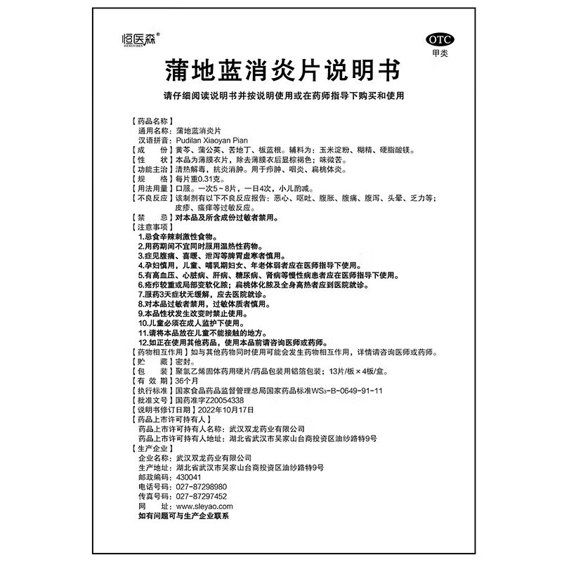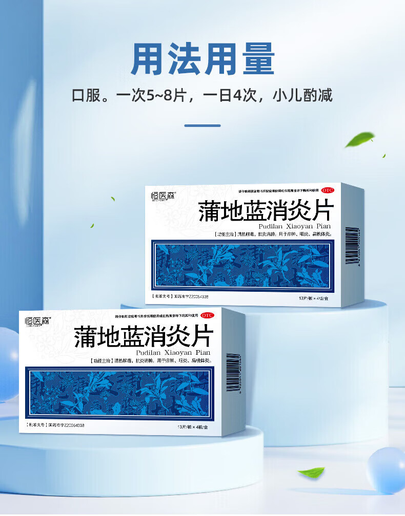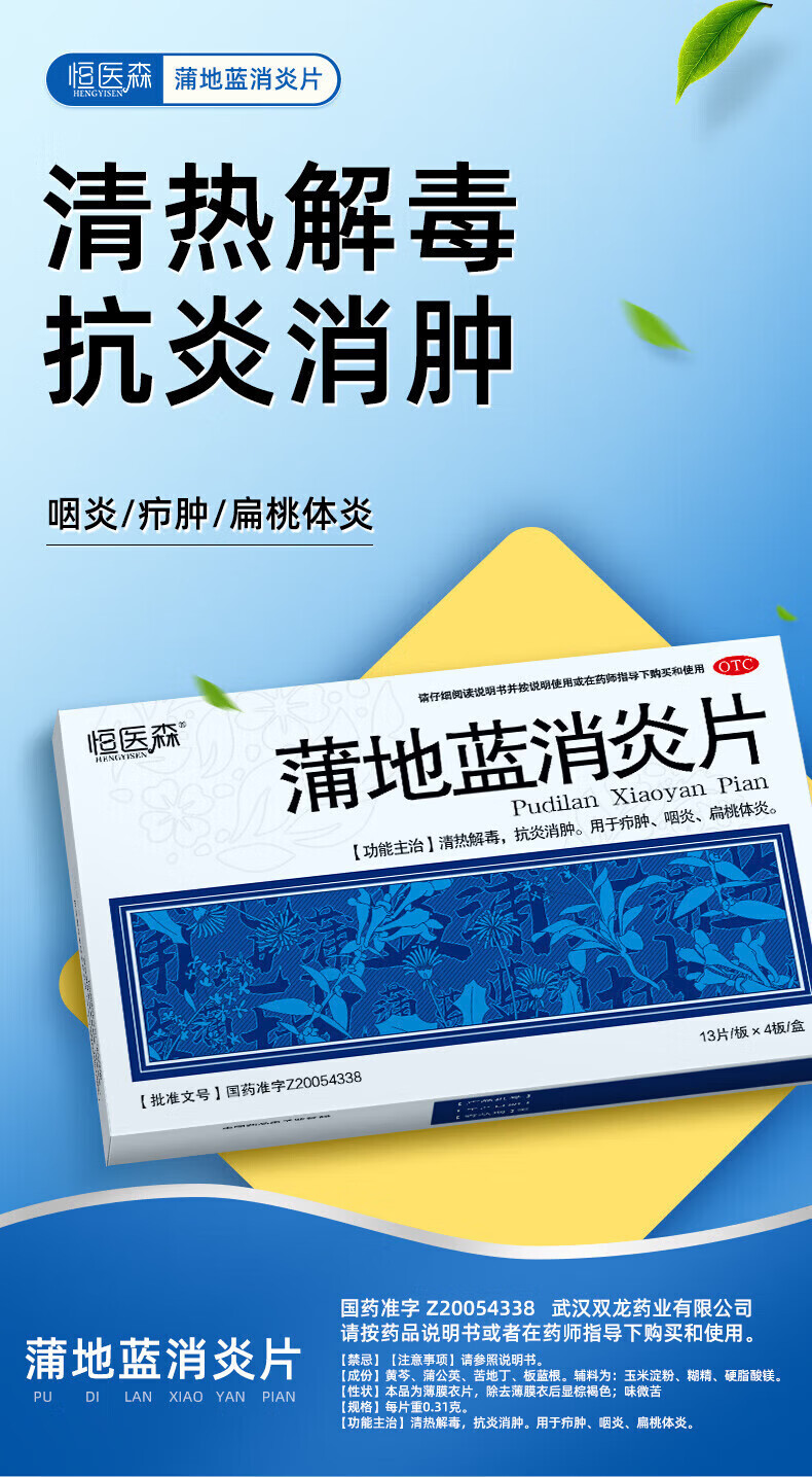 [恒医森]蒲地蓝消炎片 0.31g*52片 1盒+[恒医森]布洛芬缓释胶囊 0.3g*14粒 1盒 52片/盒 清热解毒下火 肿痛 【感冒发烧