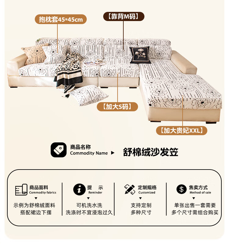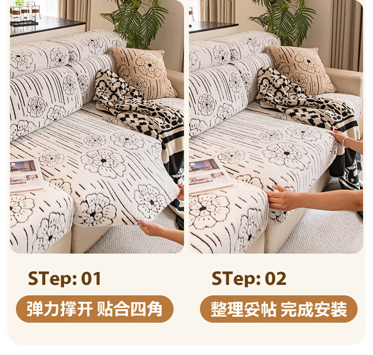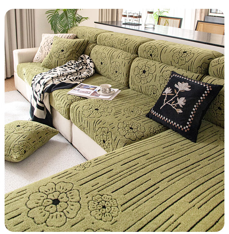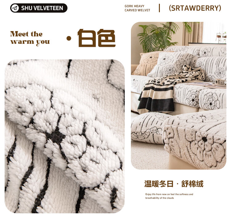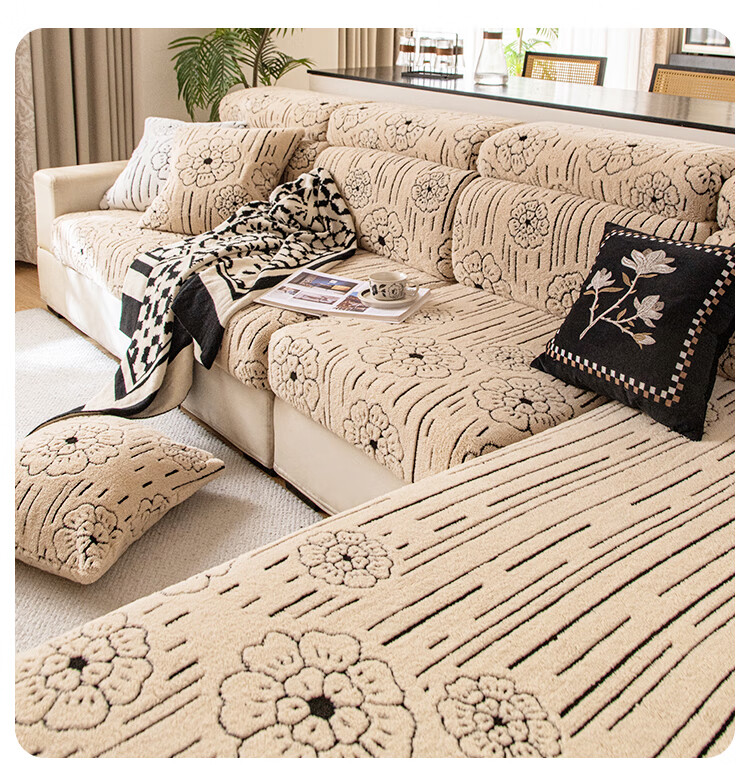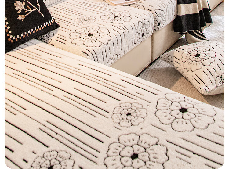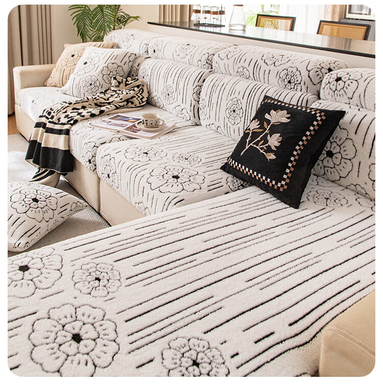 金拾美月舒棉绒冬季沙发笠2026新款三座一贵妃坐垫套罩防猫防滑抓盖布巾 花影-白色 单人加大S宽65-85cm*长65-95cm
