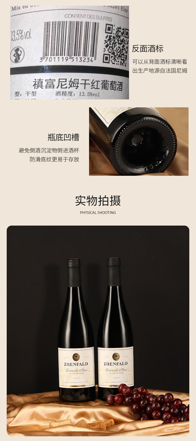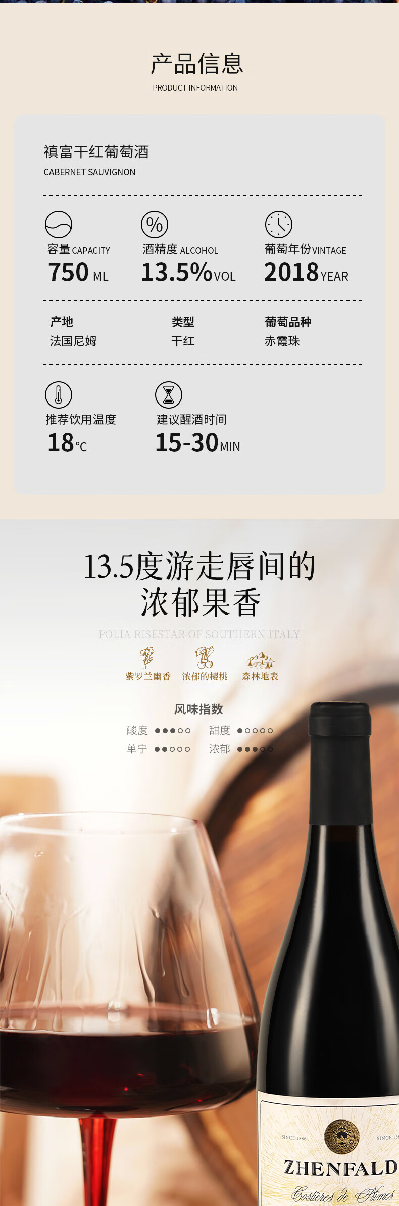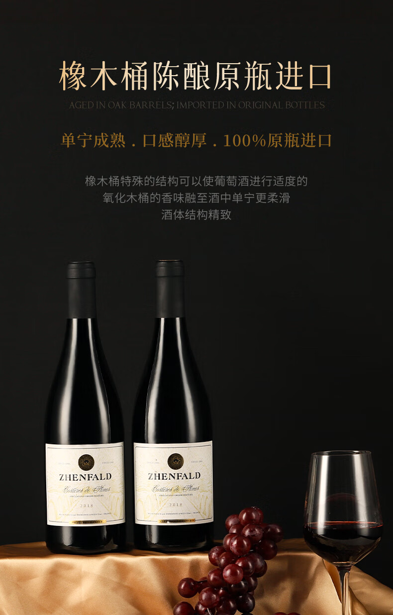 禛富法国尼姆赤霞珠原瓶进口红酒AOP级干红葡萄酒红酒13.5度750ml 整箱