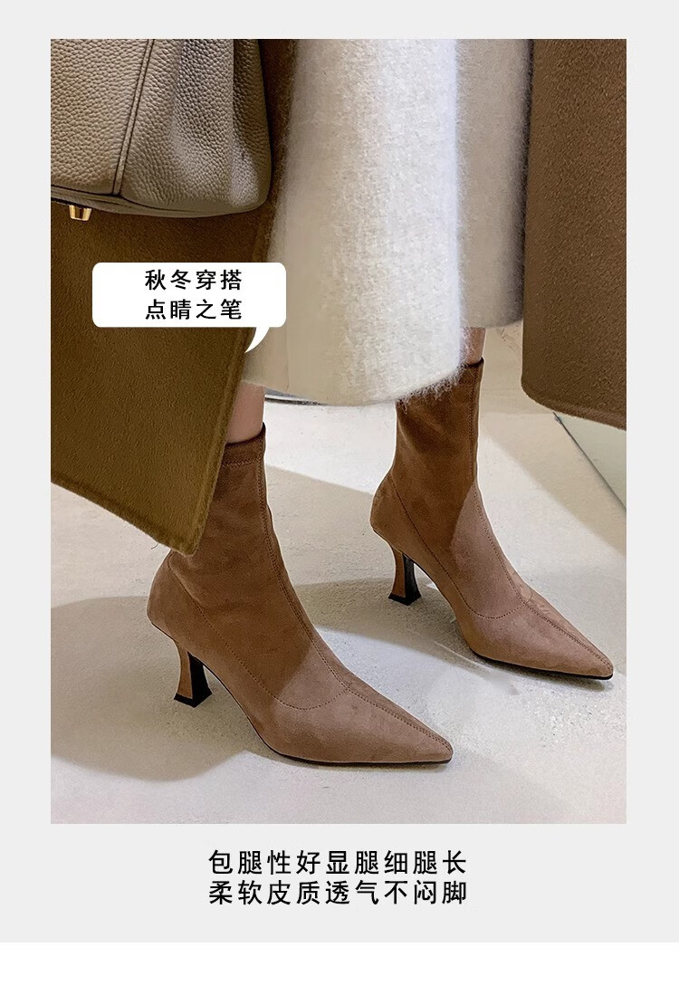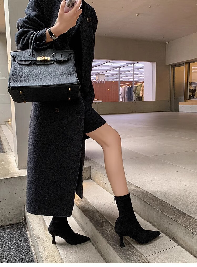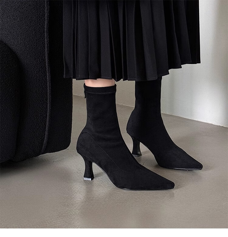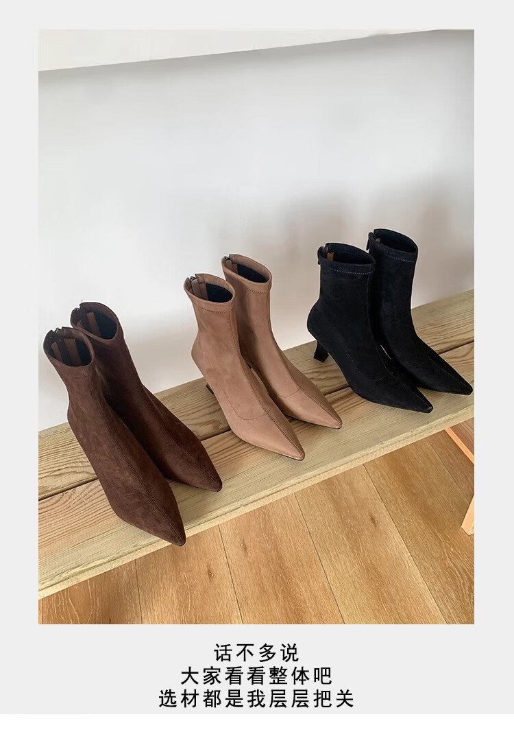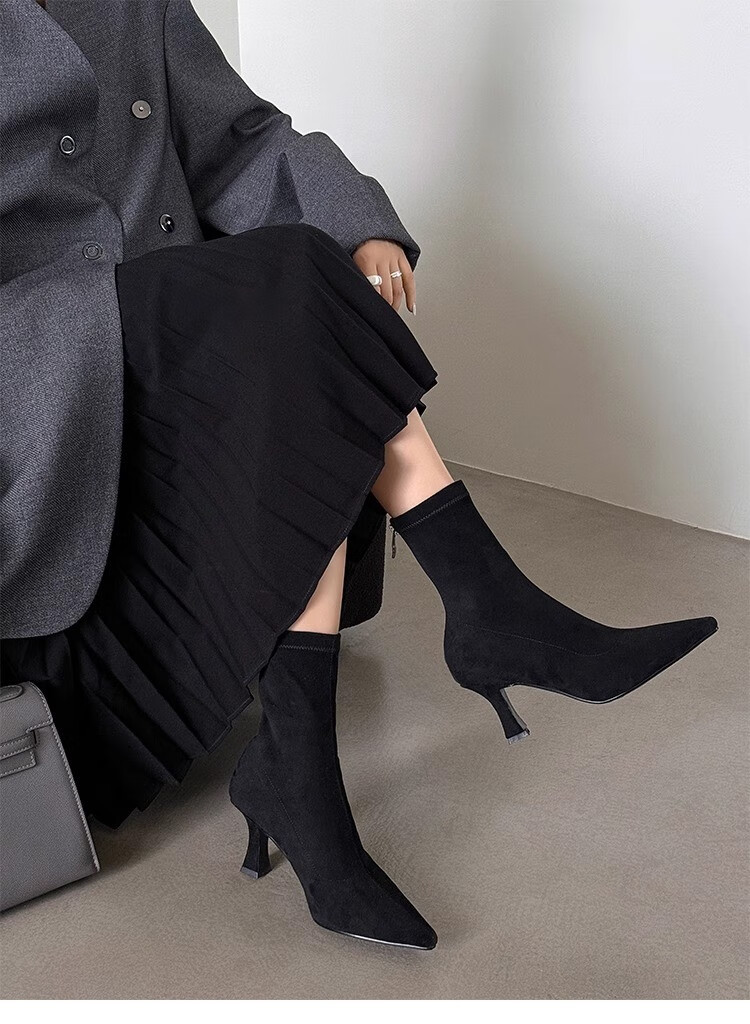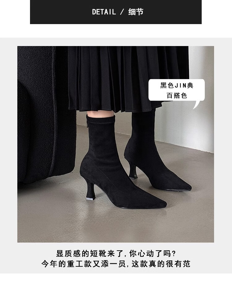浪莎(LangSha)简约尖头细跟短靴女2025秋冬新款韩版通勤高跟瘦瘦靴弹力袜靴 黑色 35