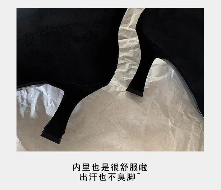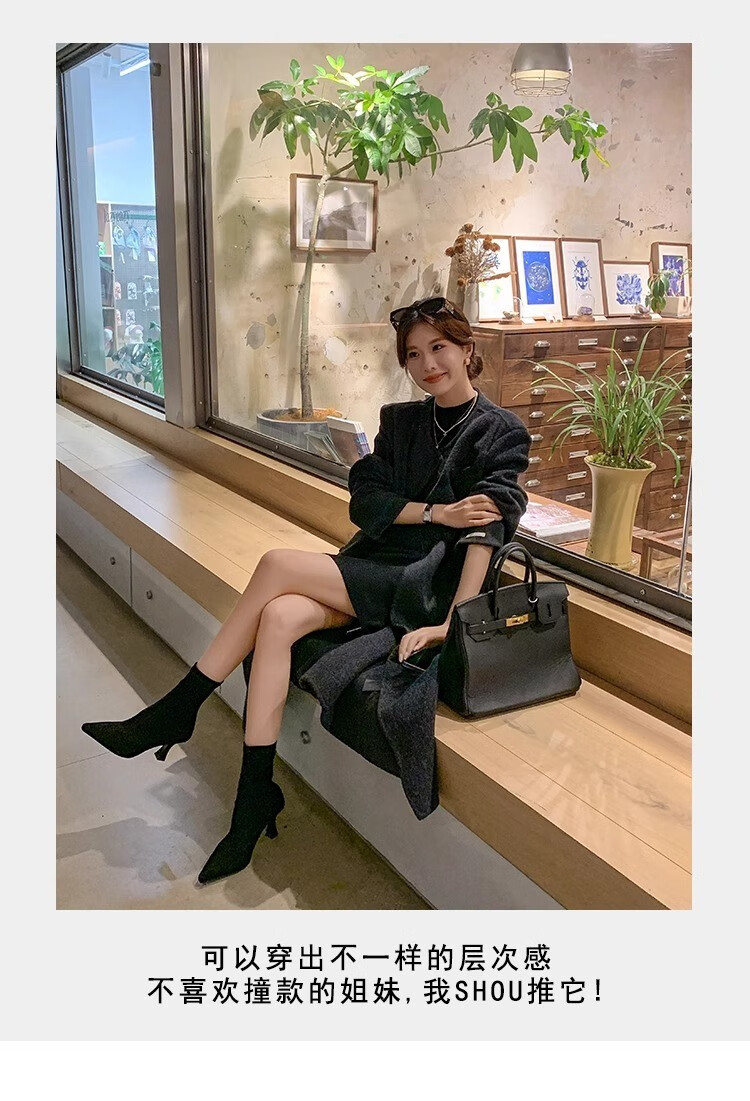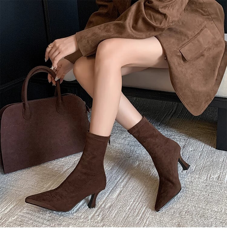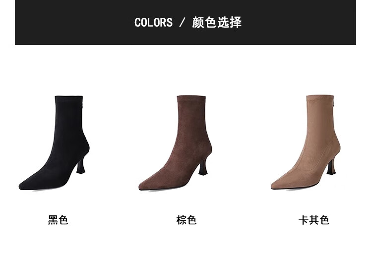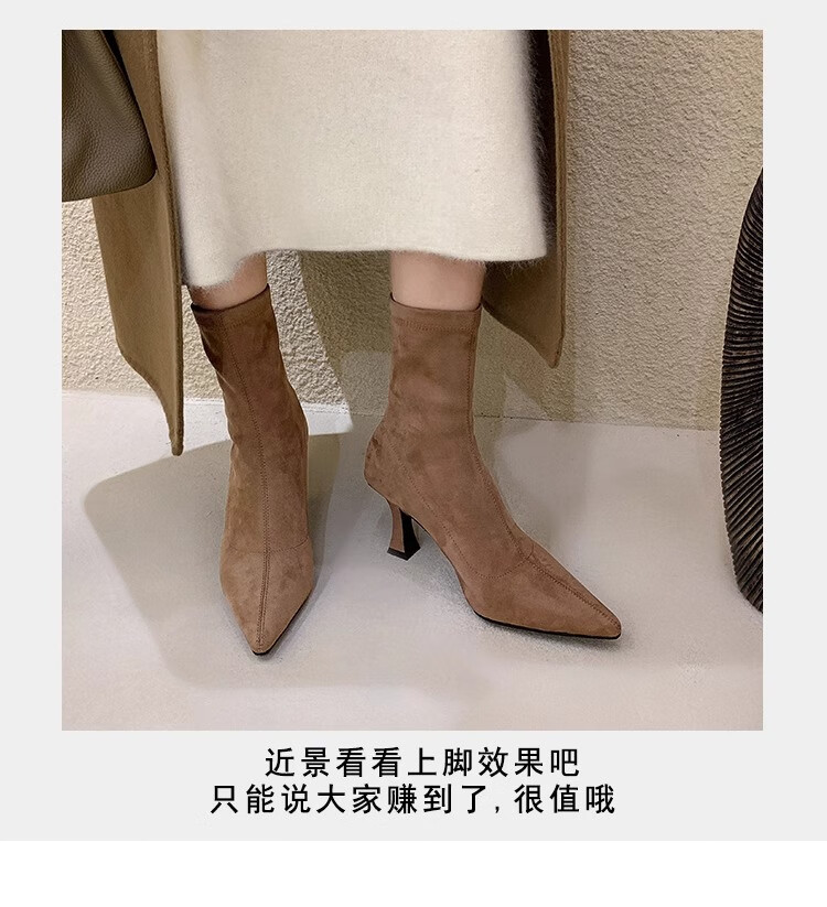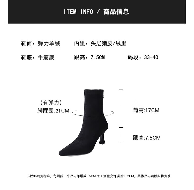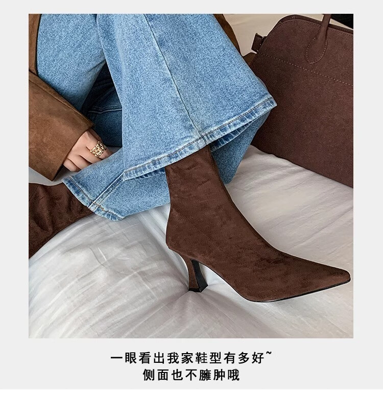 浪莎(LangSha)简约尖头细跟短靴女2025秋冬新款韩版通勤高跟瘦瘦靴弹力袜靴 黑色 35