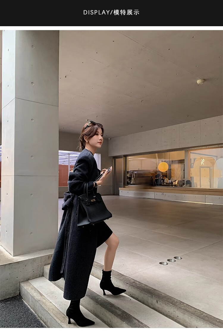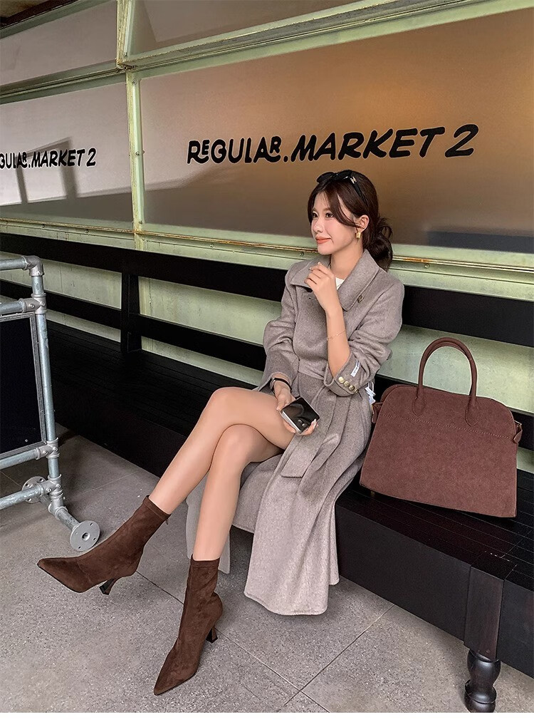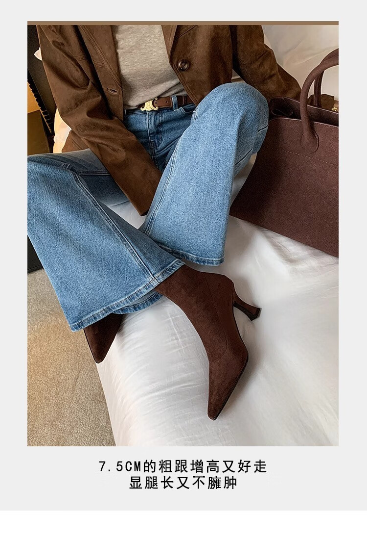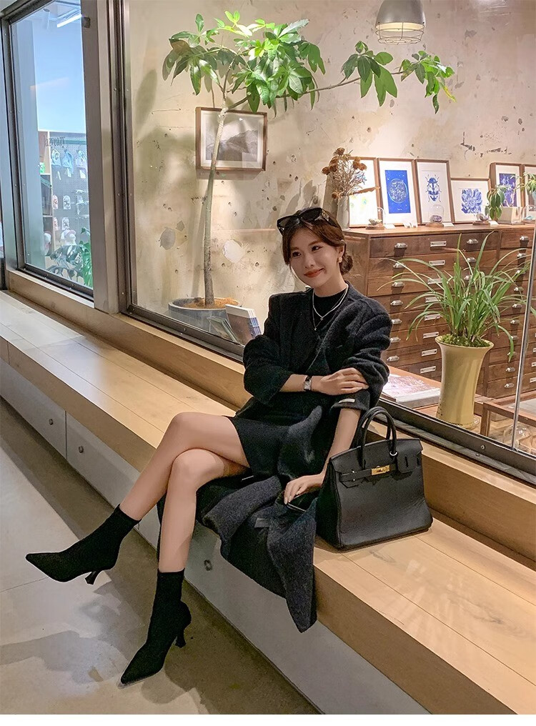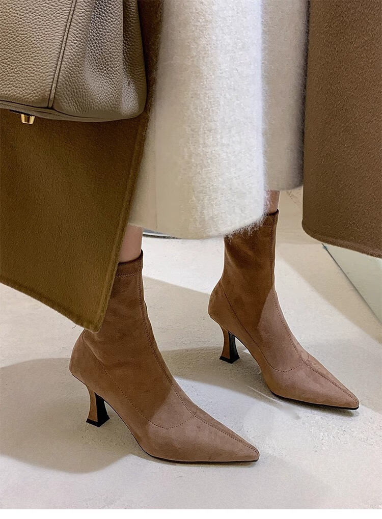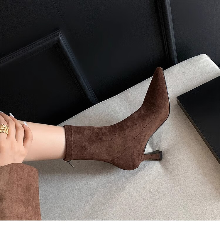 浪莎(LangSha)简约尖头细跟短靴女2025秋冬新款韩版通勤高跟瘦瘦靴弹力袜靴 黑色 35