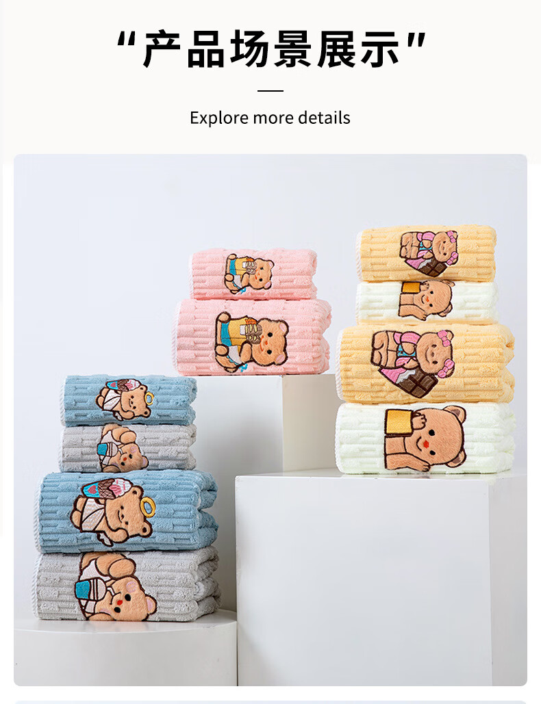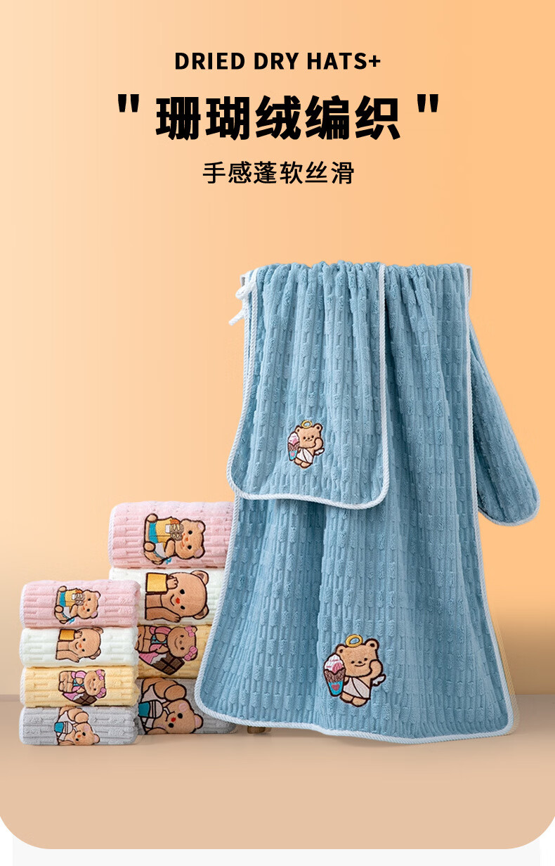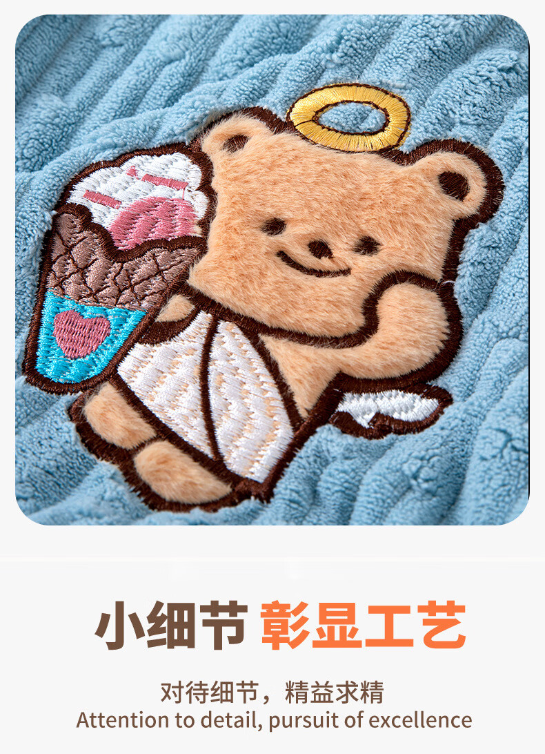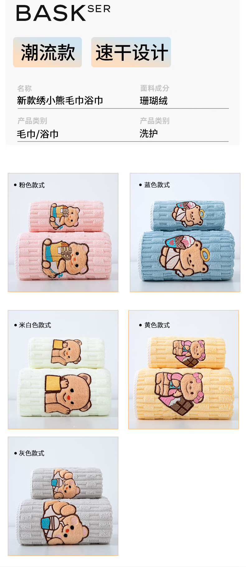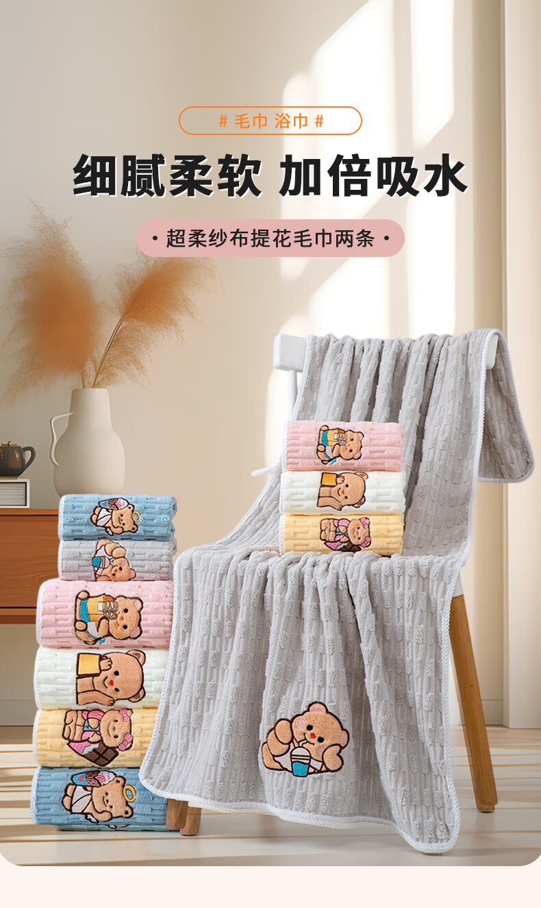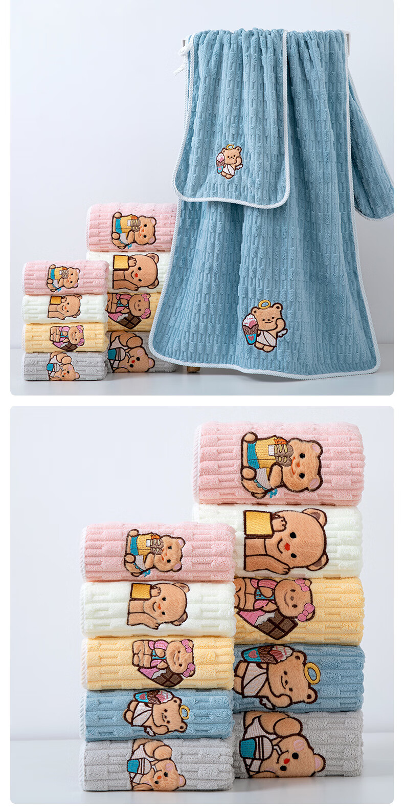 【精选好物】珊瑚绒毛巾浴巾套装卡通可爱小熊刺绣毛巾两件套家居 灰色 毛巾35*75
