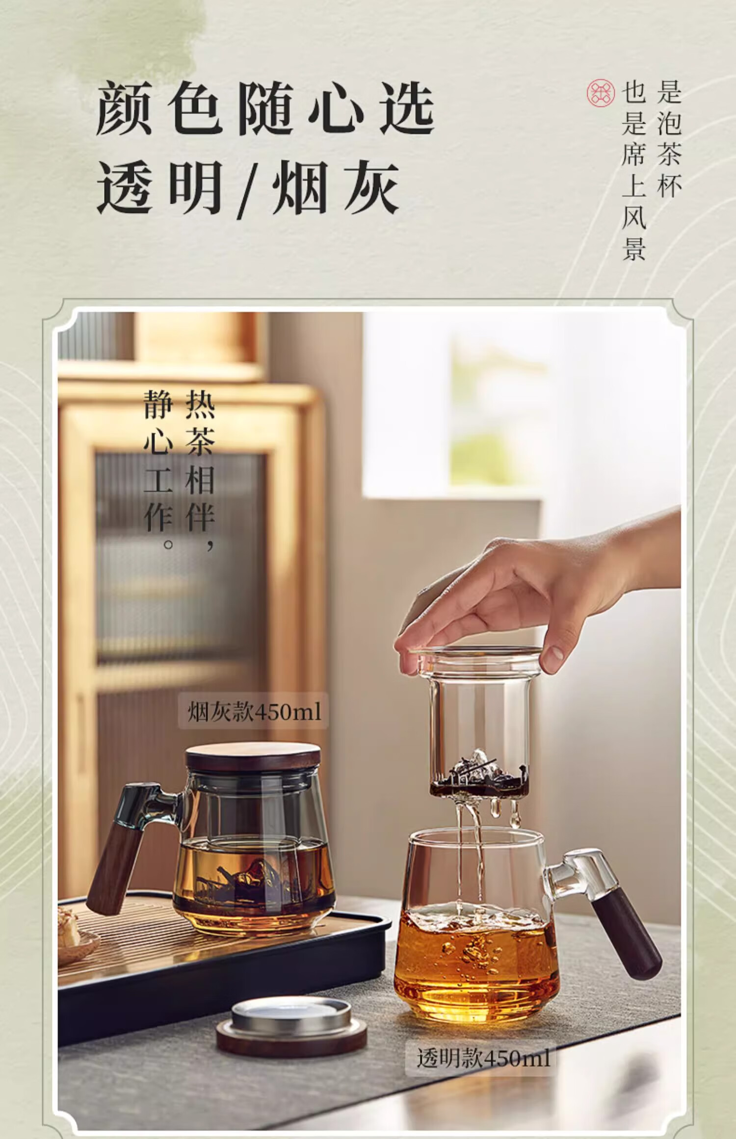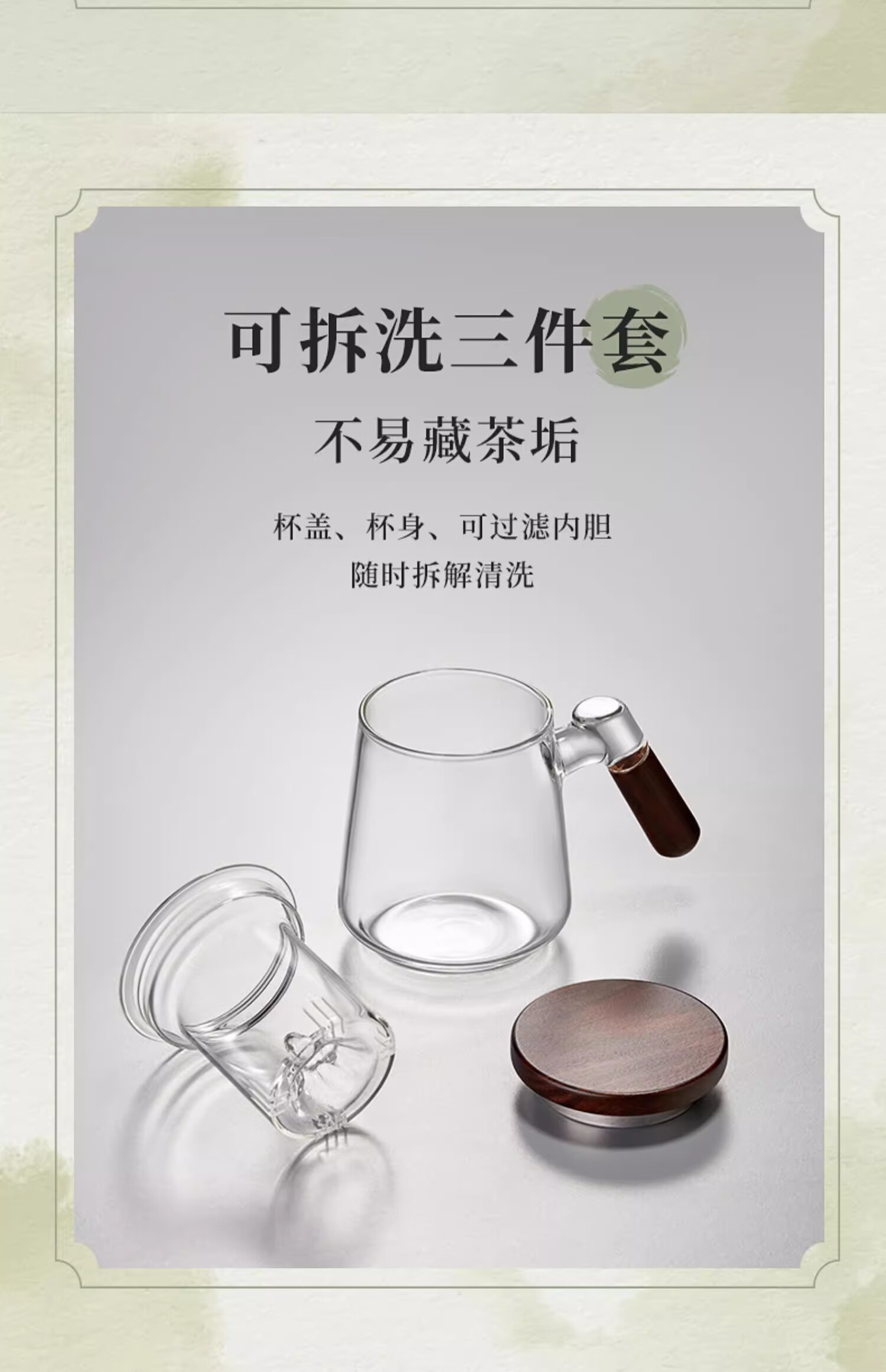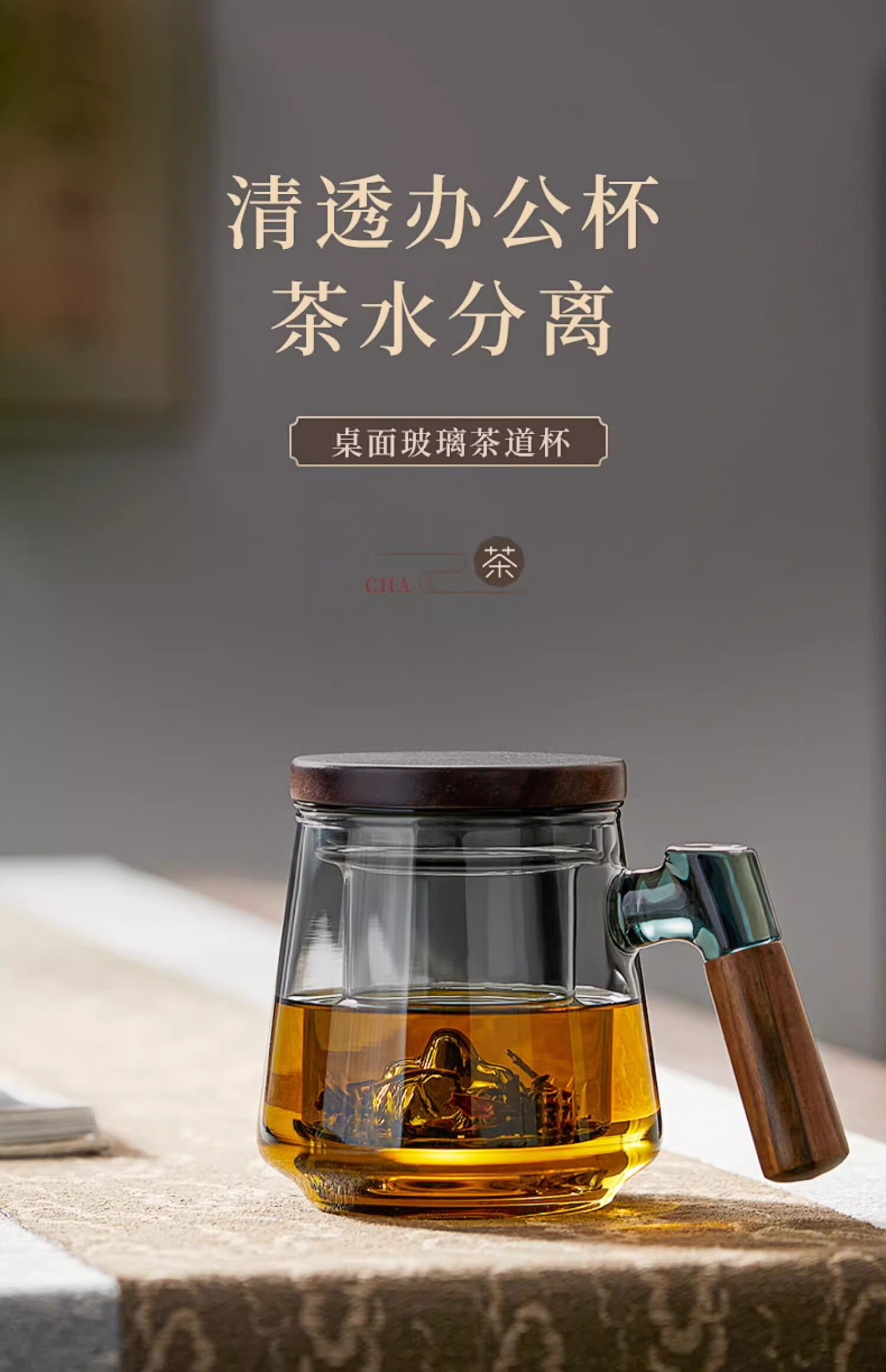 溥畔高硼硅玻璃茶杯带把手茶水分离水杯个性创意观山杯子办公室花茶杯 烟青观山【胡桃木手柄】 500ml