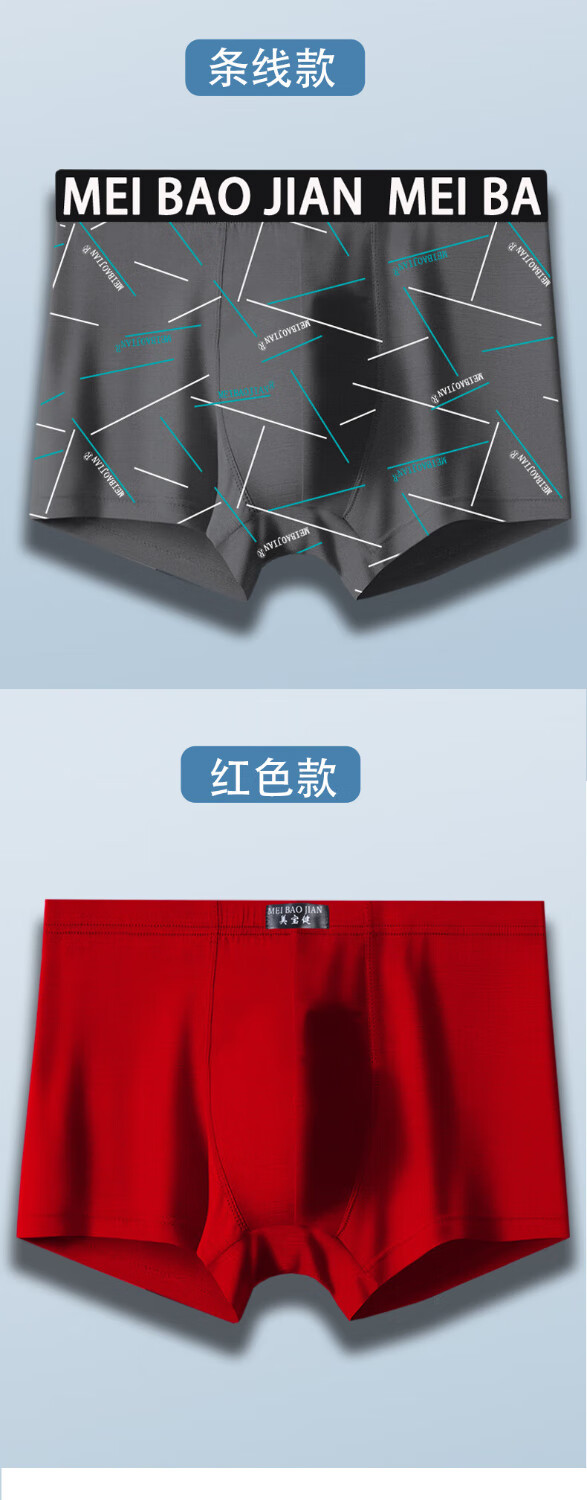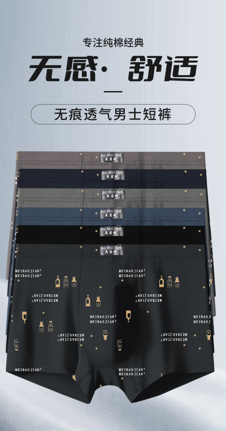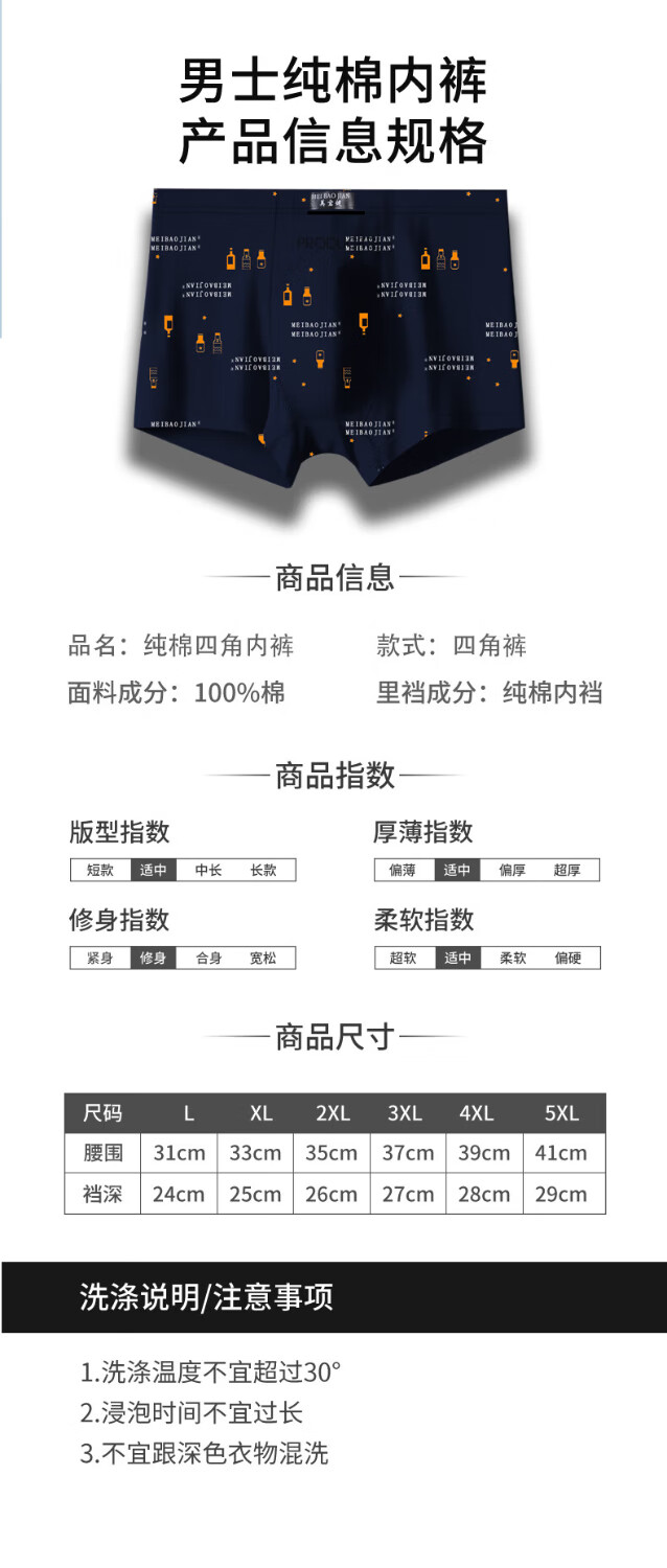 美宝健100%纯棉男式内裤5条平角裤中腰常用型舒适男生运动吸汗透气底裤 3条装(100%纯棉)明筋简约款 3条 XL (体重90-110斤)纯棉