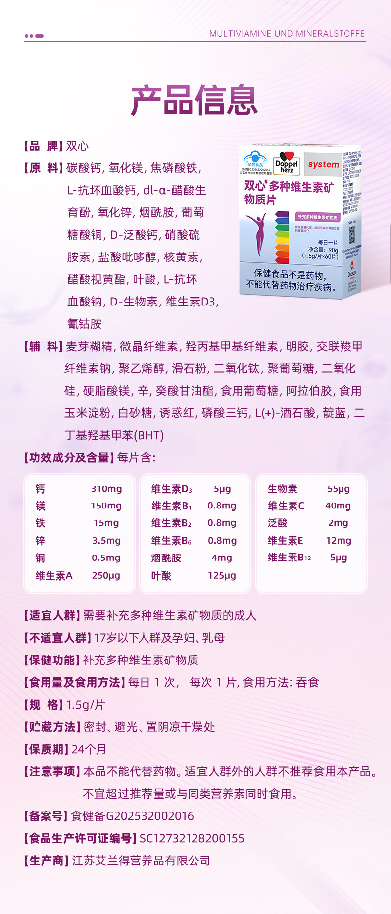 双心(Doppel herz)女士复合维生素17种营养叶酸烟酰胺生物素B族60粒/盒 【女士复合维生素丨1周期】 60粒*2盒