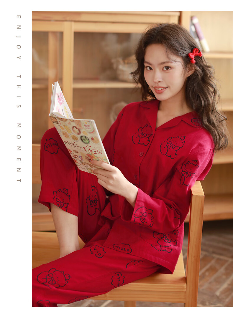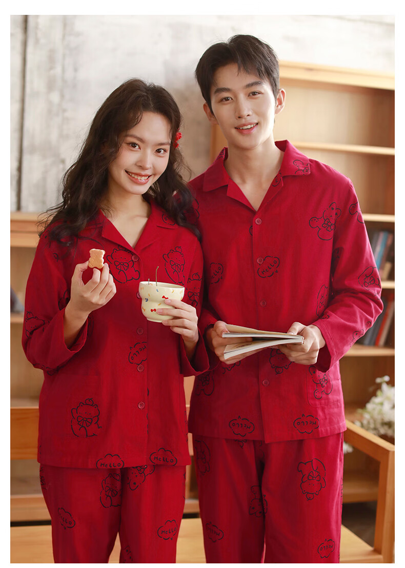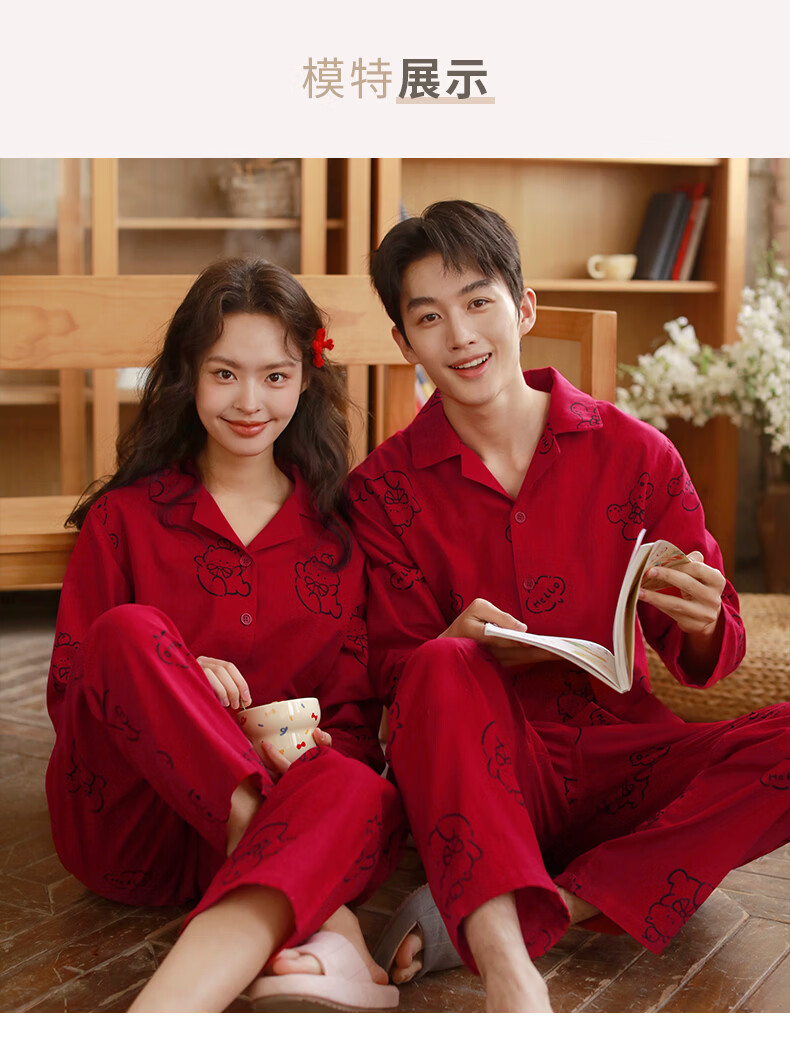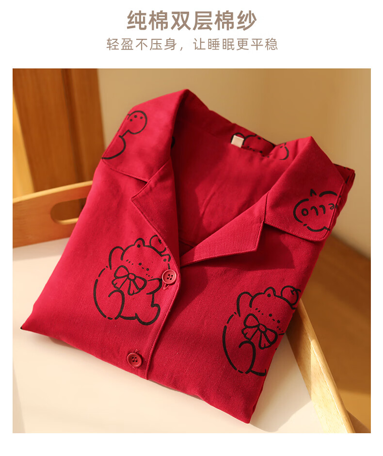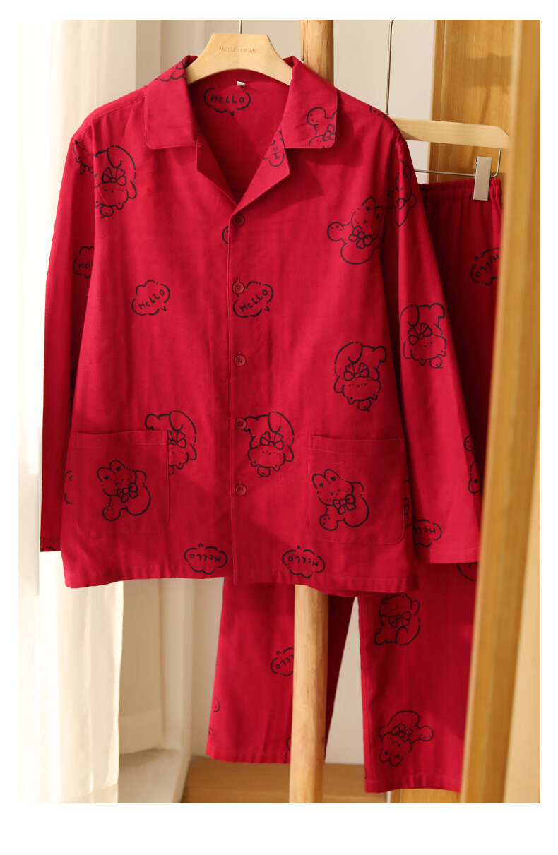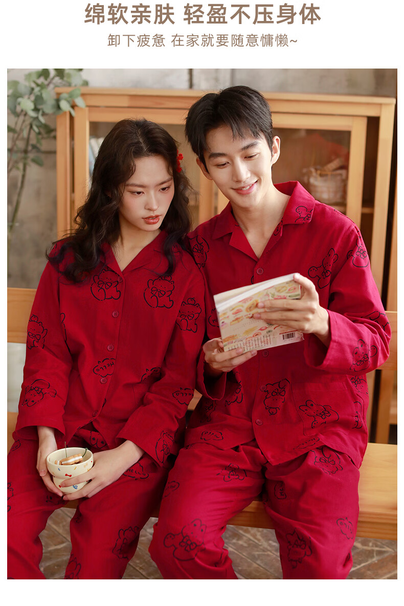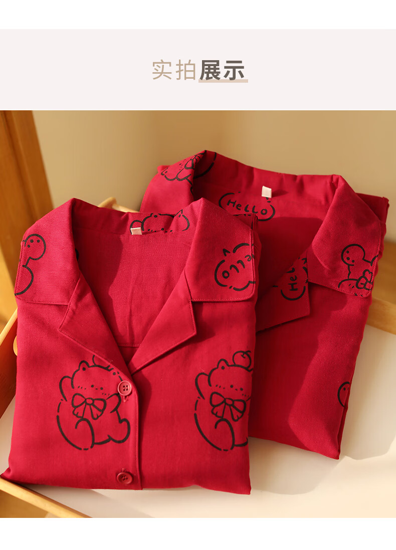蔓秋 MEJU新年本命年红色(猫咪)情侣情人节礼物纱布长袖长裤家居服套装 红色女 M 男士140斤以内 女士110斤以内