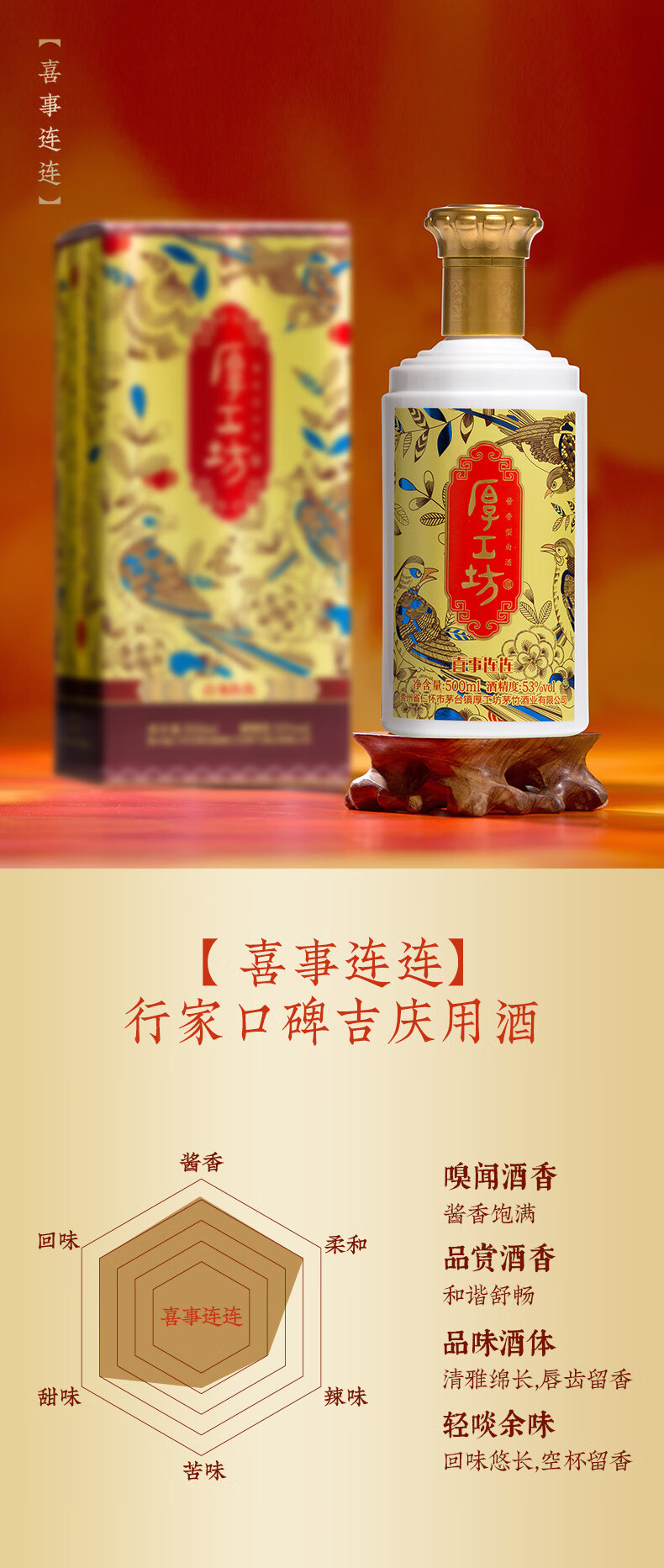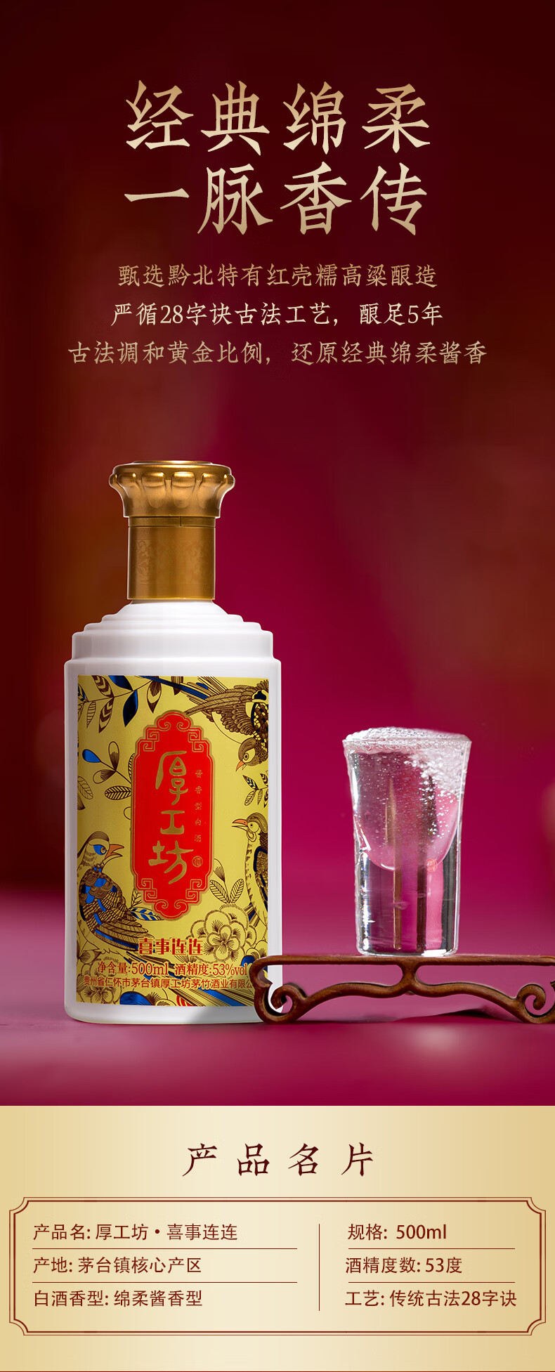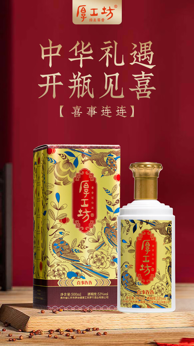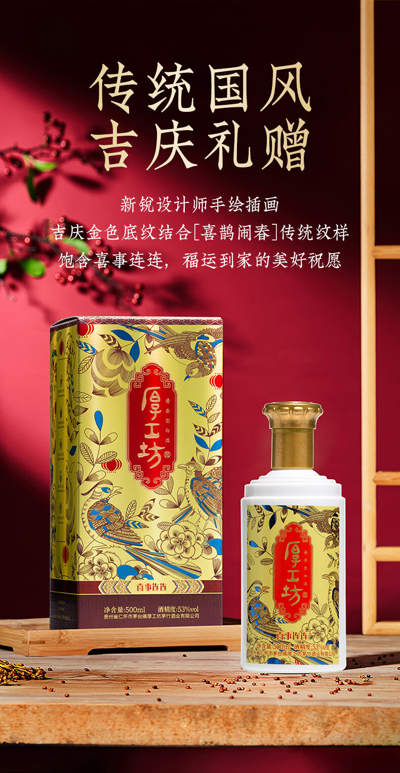 厚工坊【会员积分换购】喜事连连 酱香53度白酒 送礼 喜事 婚宴 纯粮酒 53度 500mL 1瓶 (喜事连连单瓶)