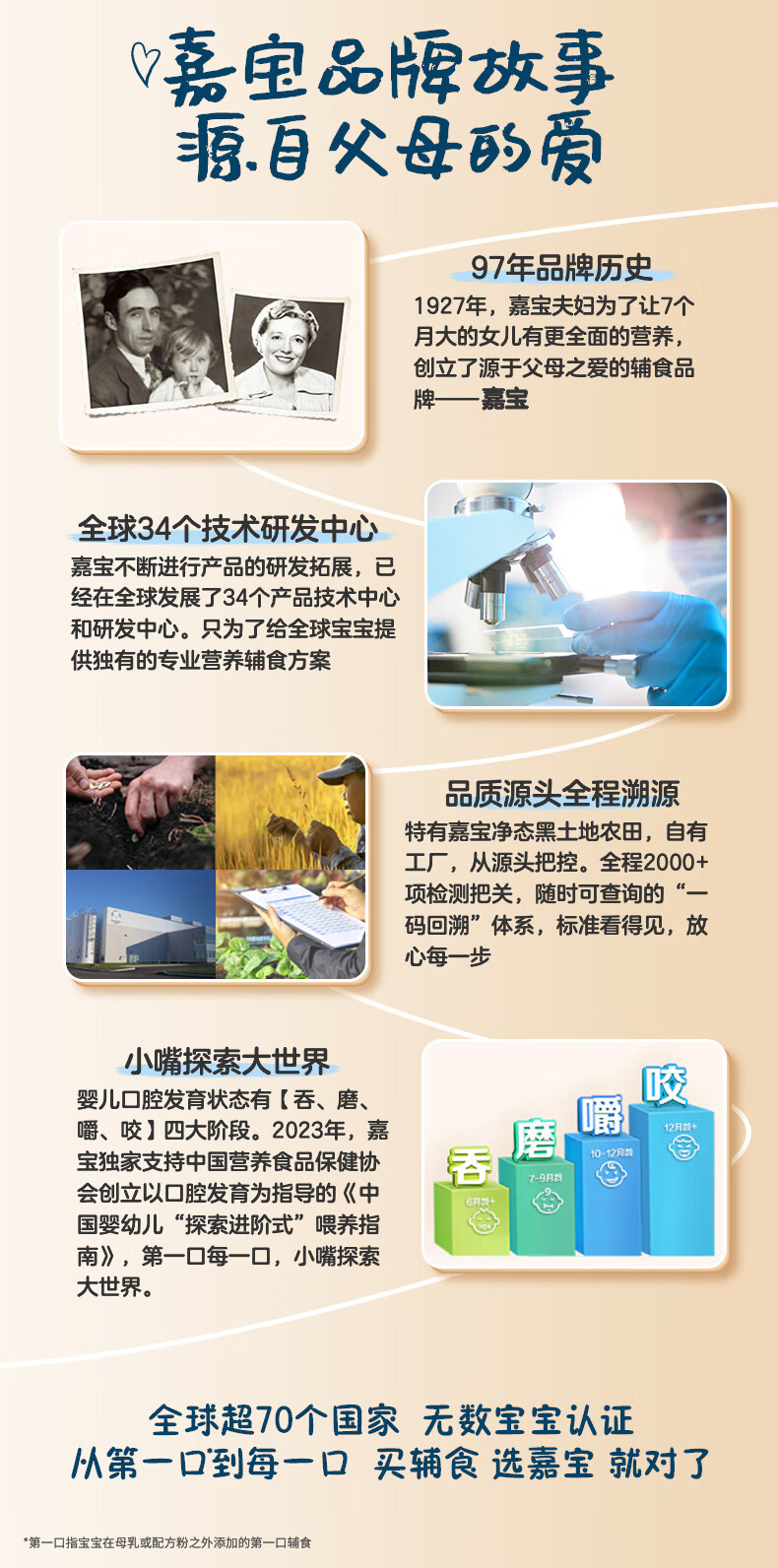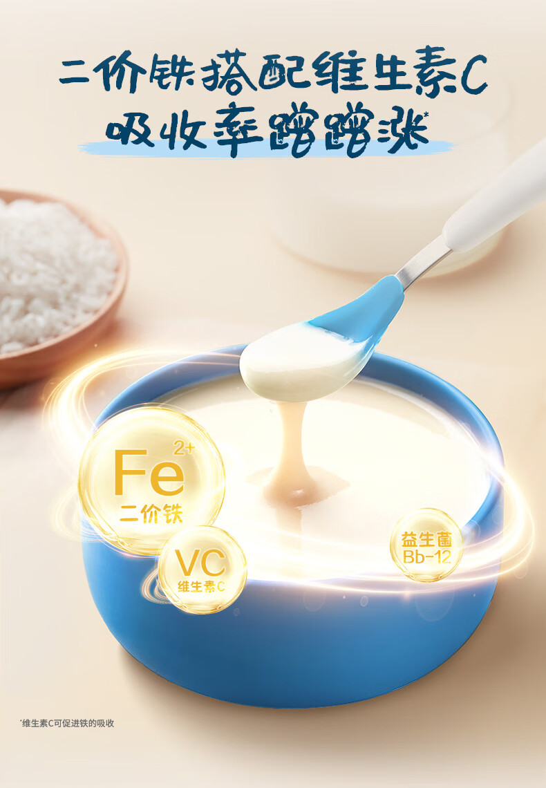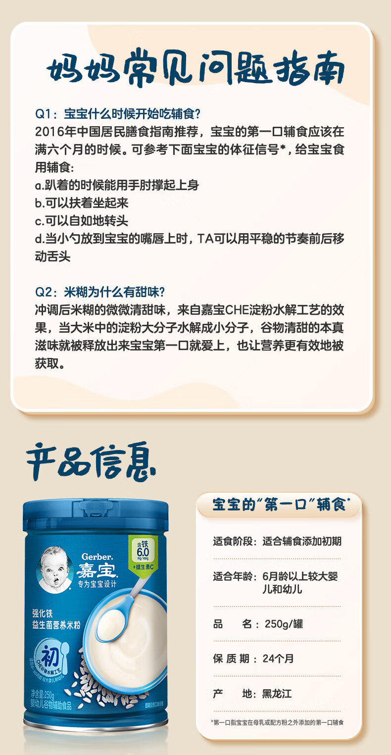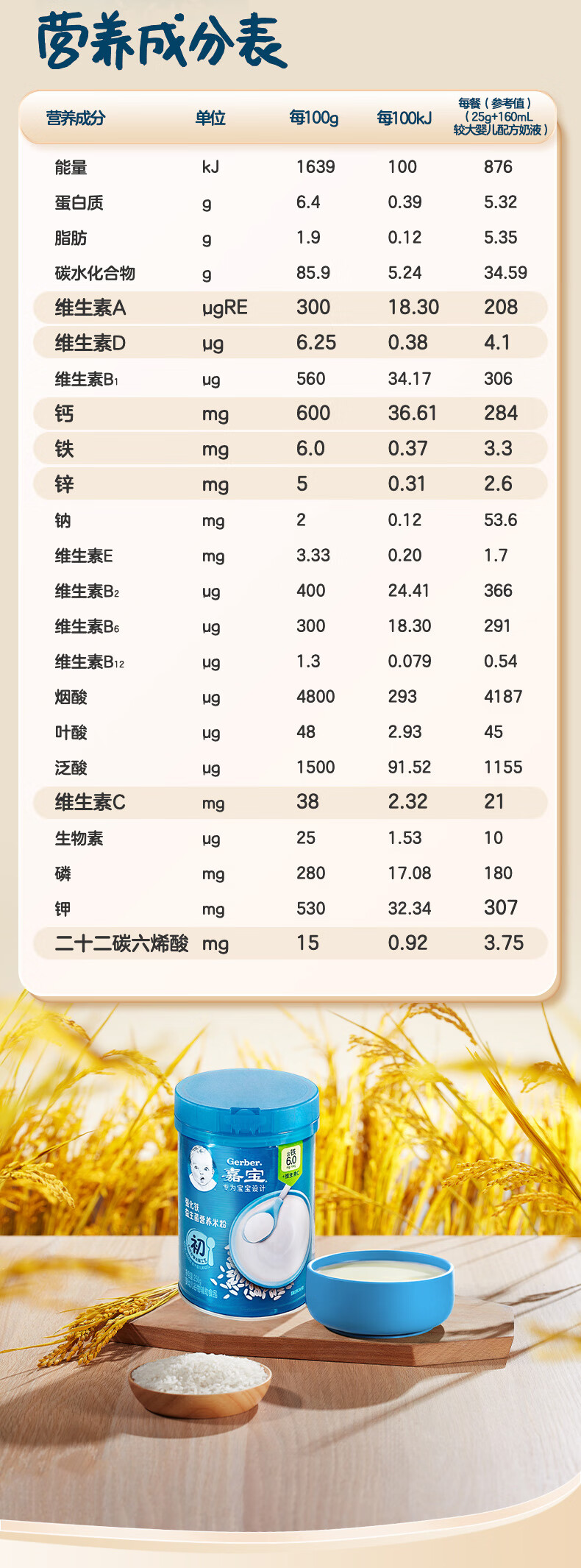 嘉宝(GERBER)【吞】原味高铁米粉辅食米糊含DHA活性益生菌250g 6月龄