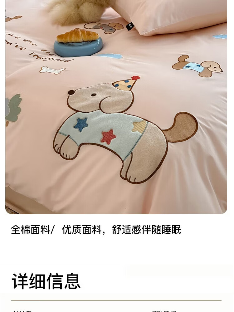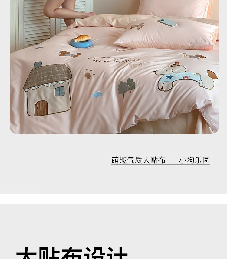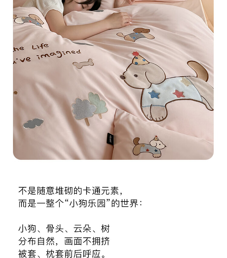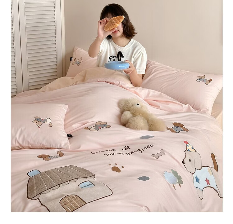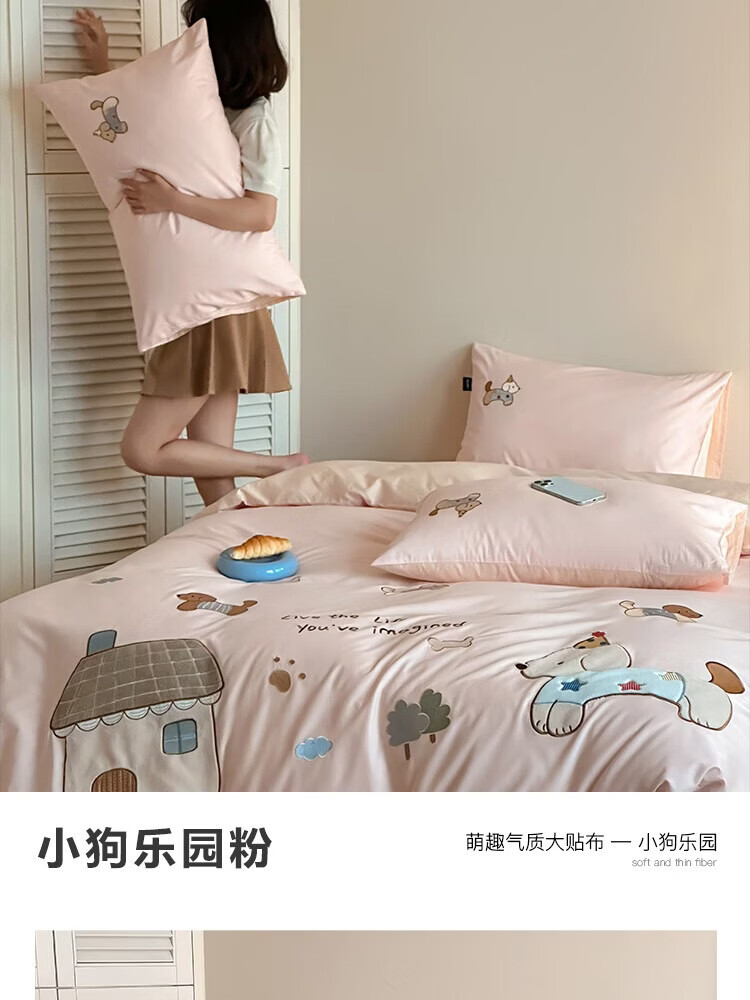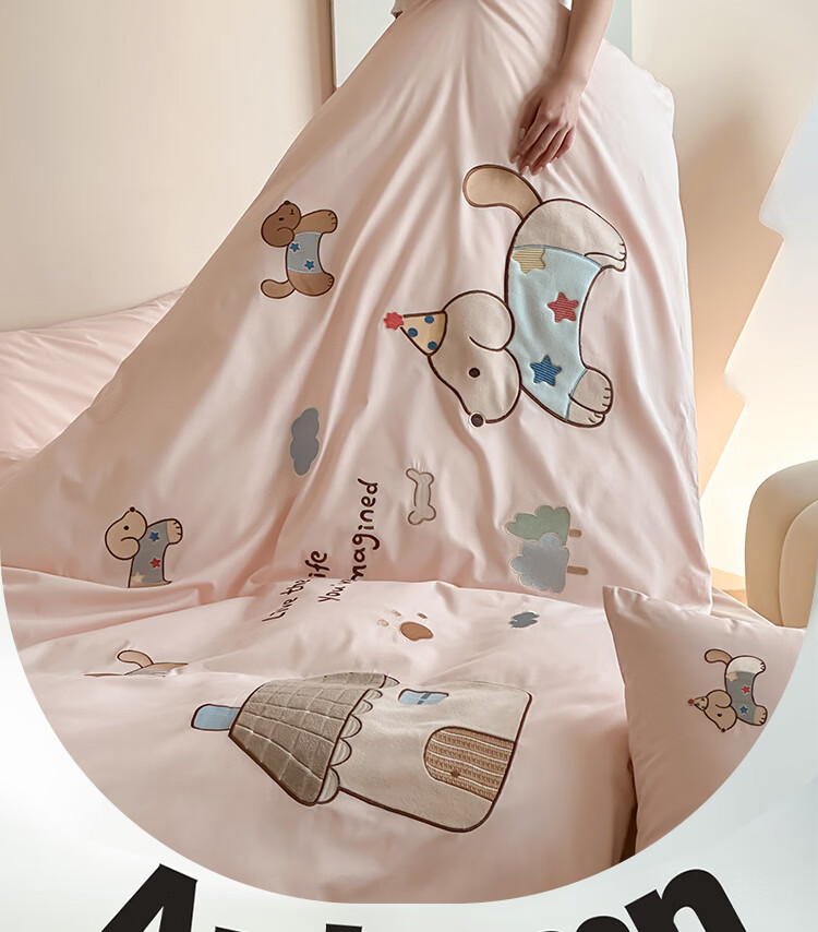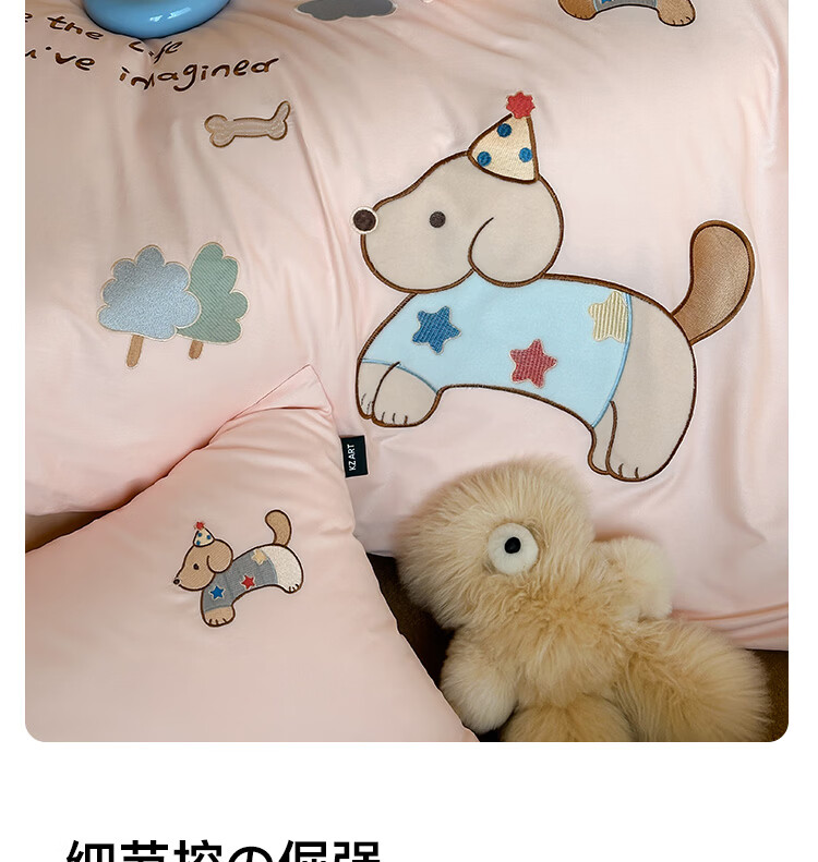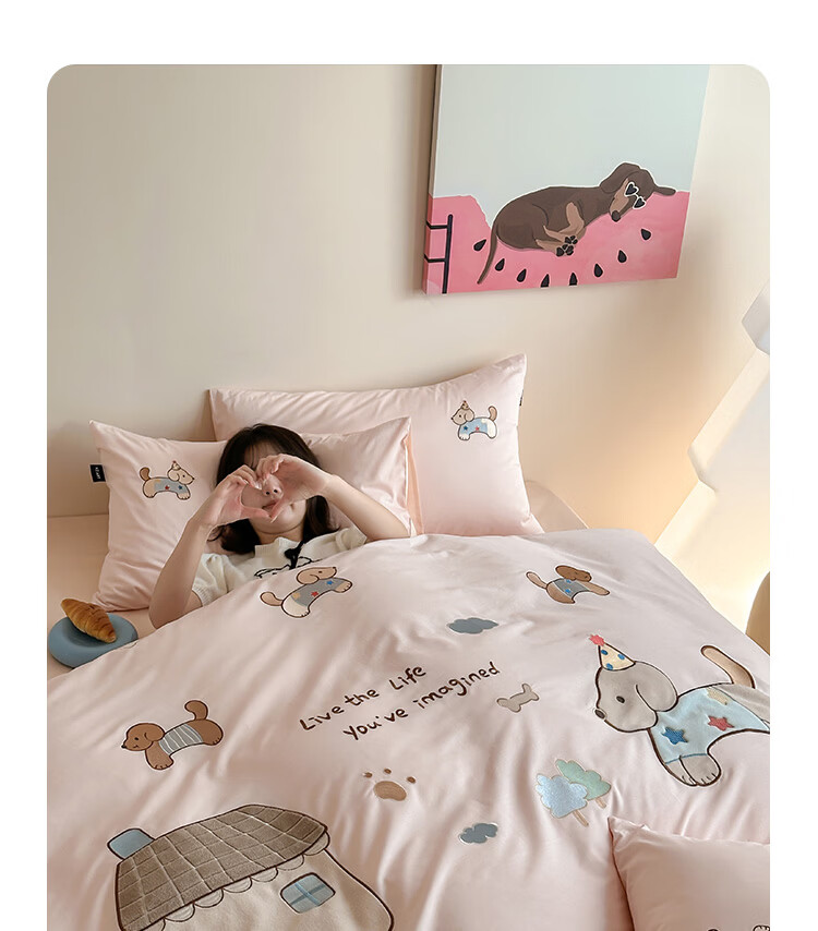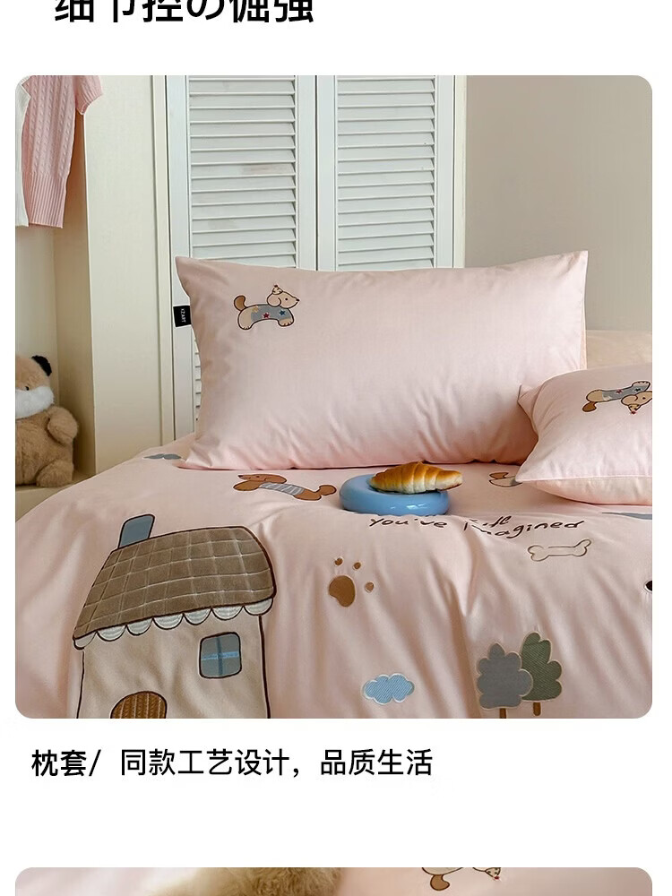ROLAND LIVE儿童全棉卡通四件套萌趣小狗贴布绣被套床单学生宿舍三件套 KZ 全棉套件-小狗乐园粉 1.8米床 床笠款 【被套200*230cm】