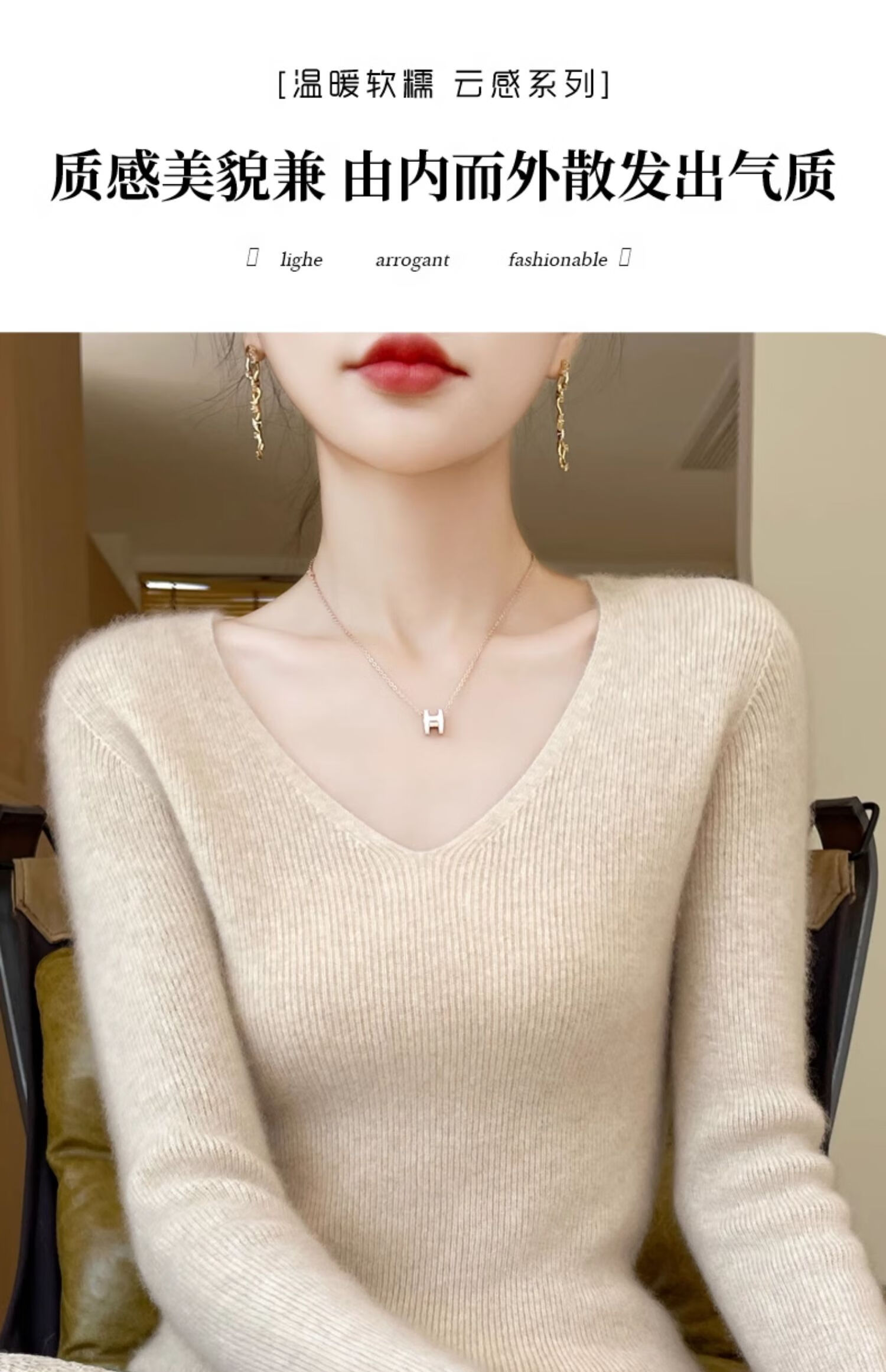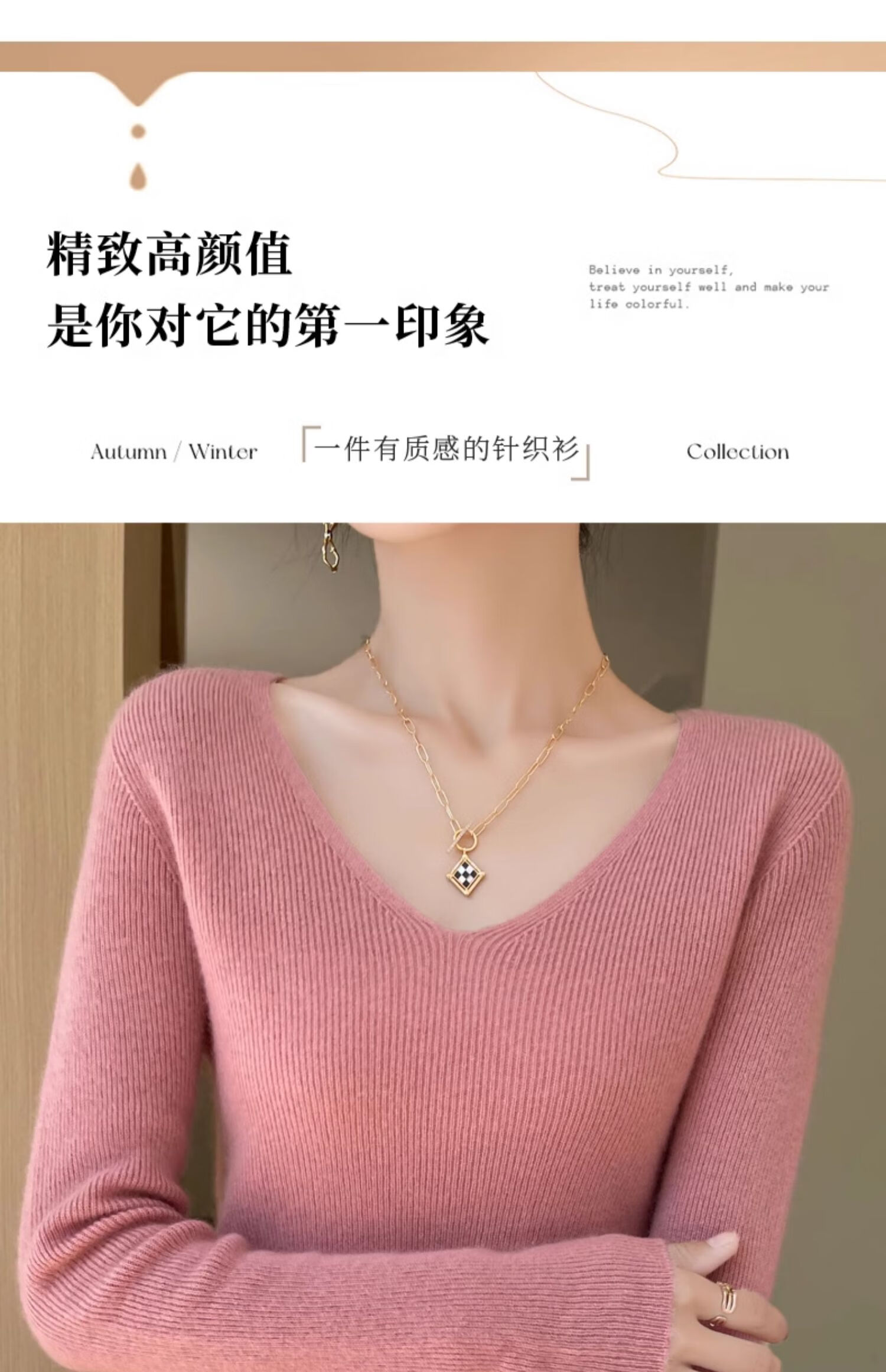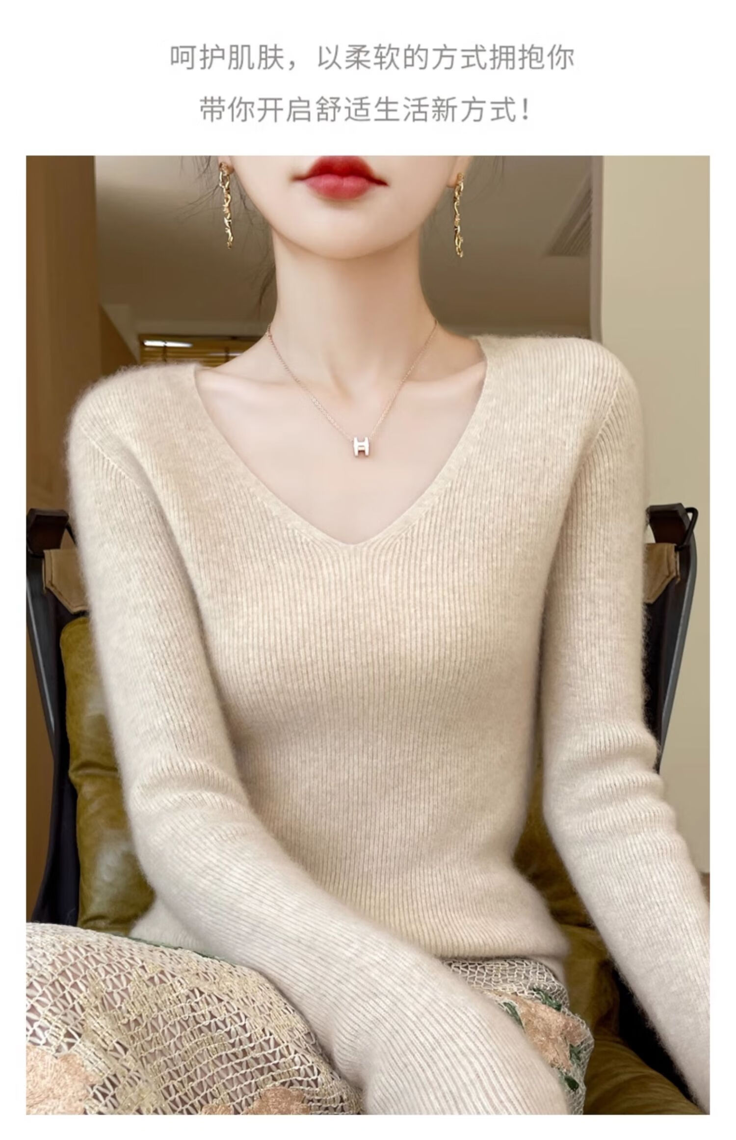 香影纯女装新款2025纯色V领针织衫女秋冬修身修身毛衣女百搭针织打底衫 米色 S (建议95斤以内)